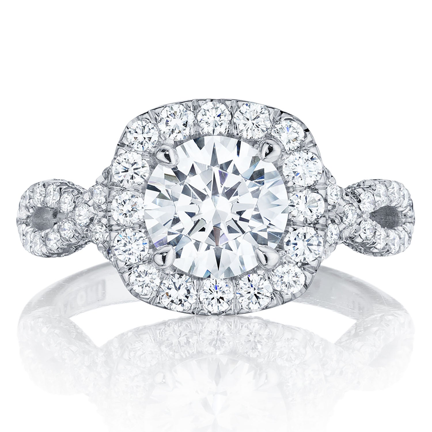 Twists of pavé-set diamonds culminate at the crown and wrap around the center stone to form a cushion bloom. Set on a Cathedral foundation above a band of Petite Crescent fabric.