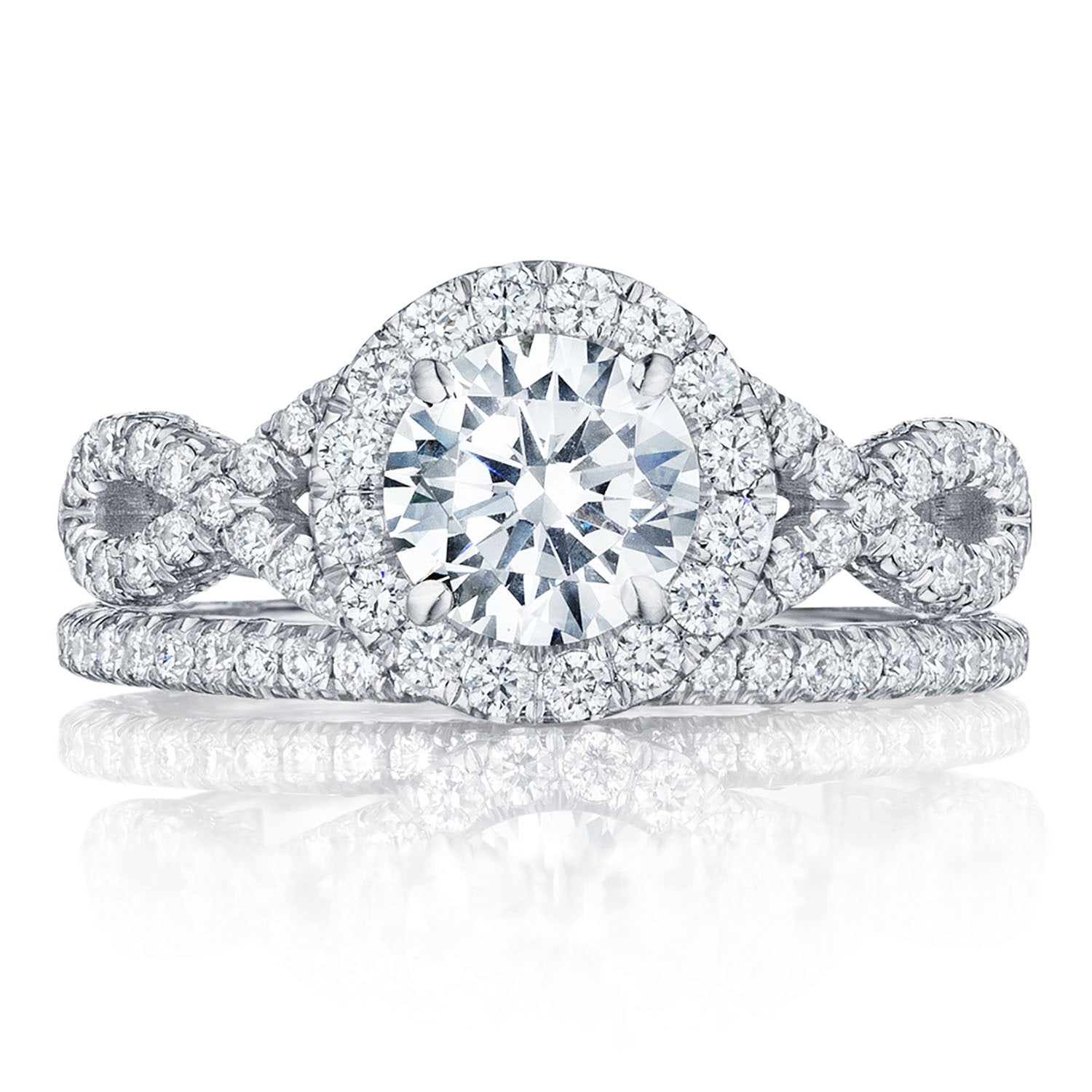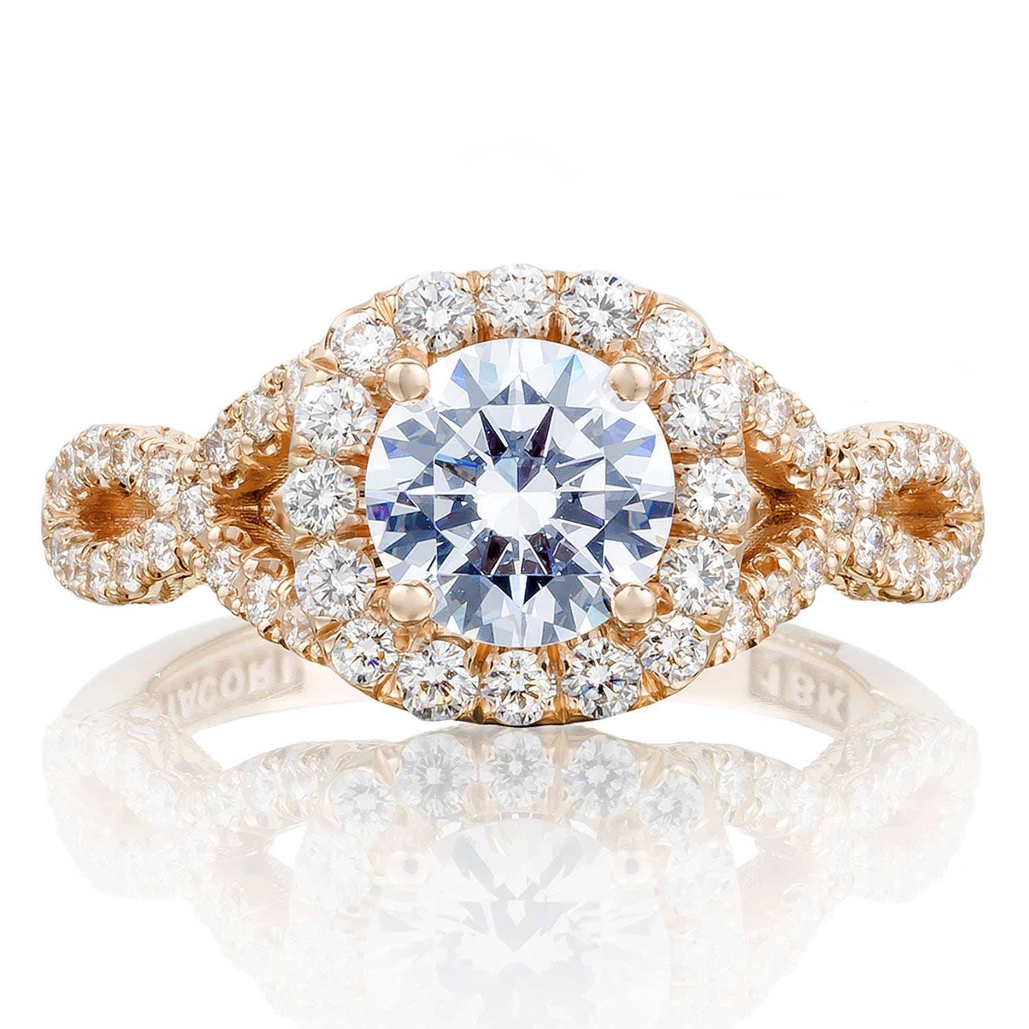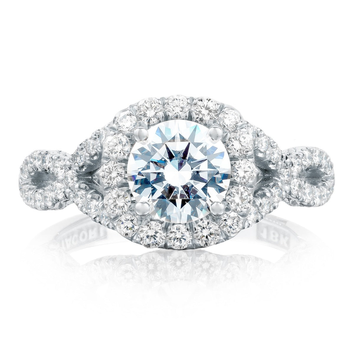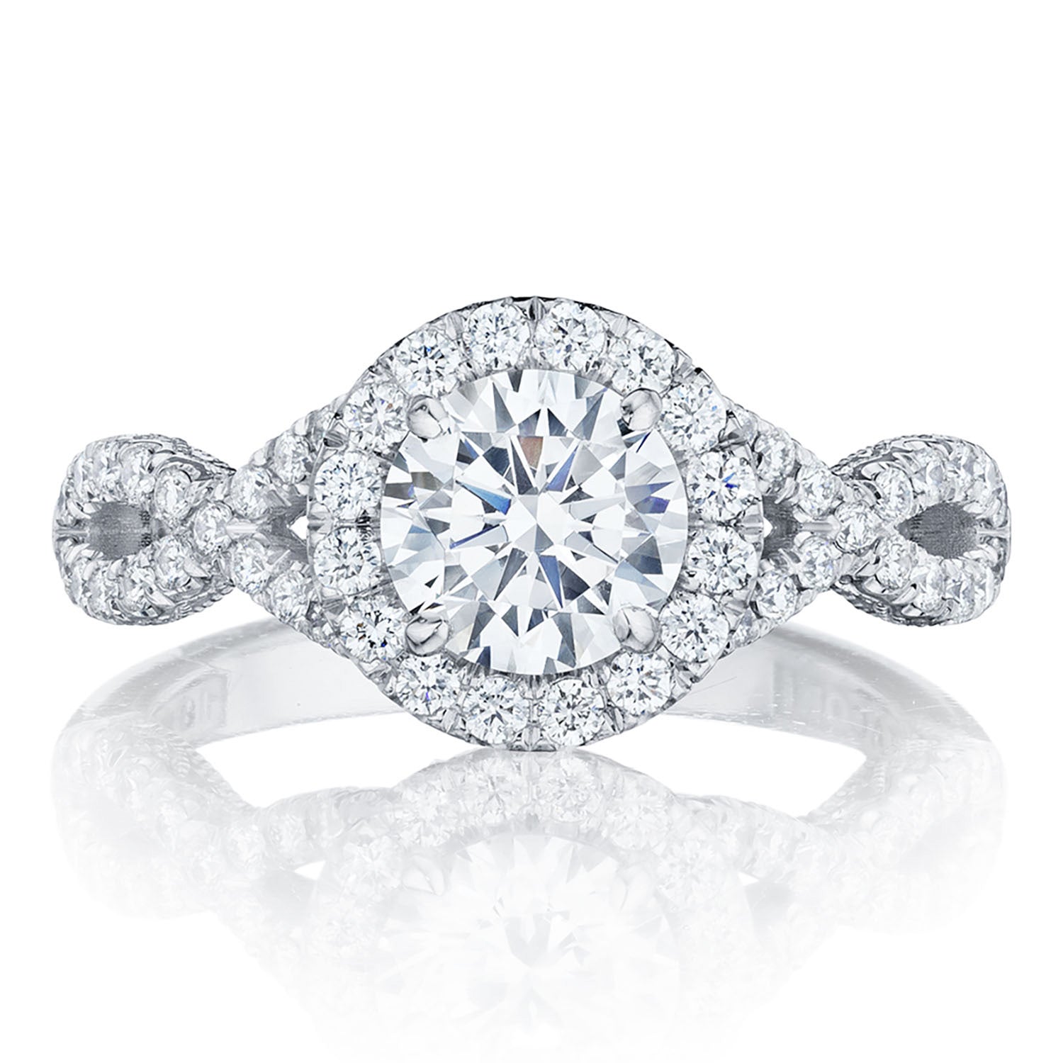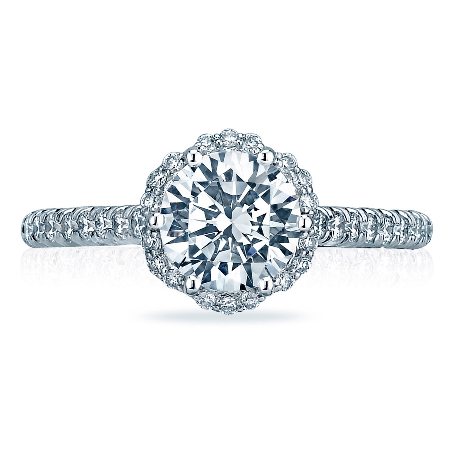 Twists of pavé-set diamonds culminate at the crown and wrap around the center stone to form a round bloom. Set on a Cathedral foundation above a band of Petite Crescent fabric.