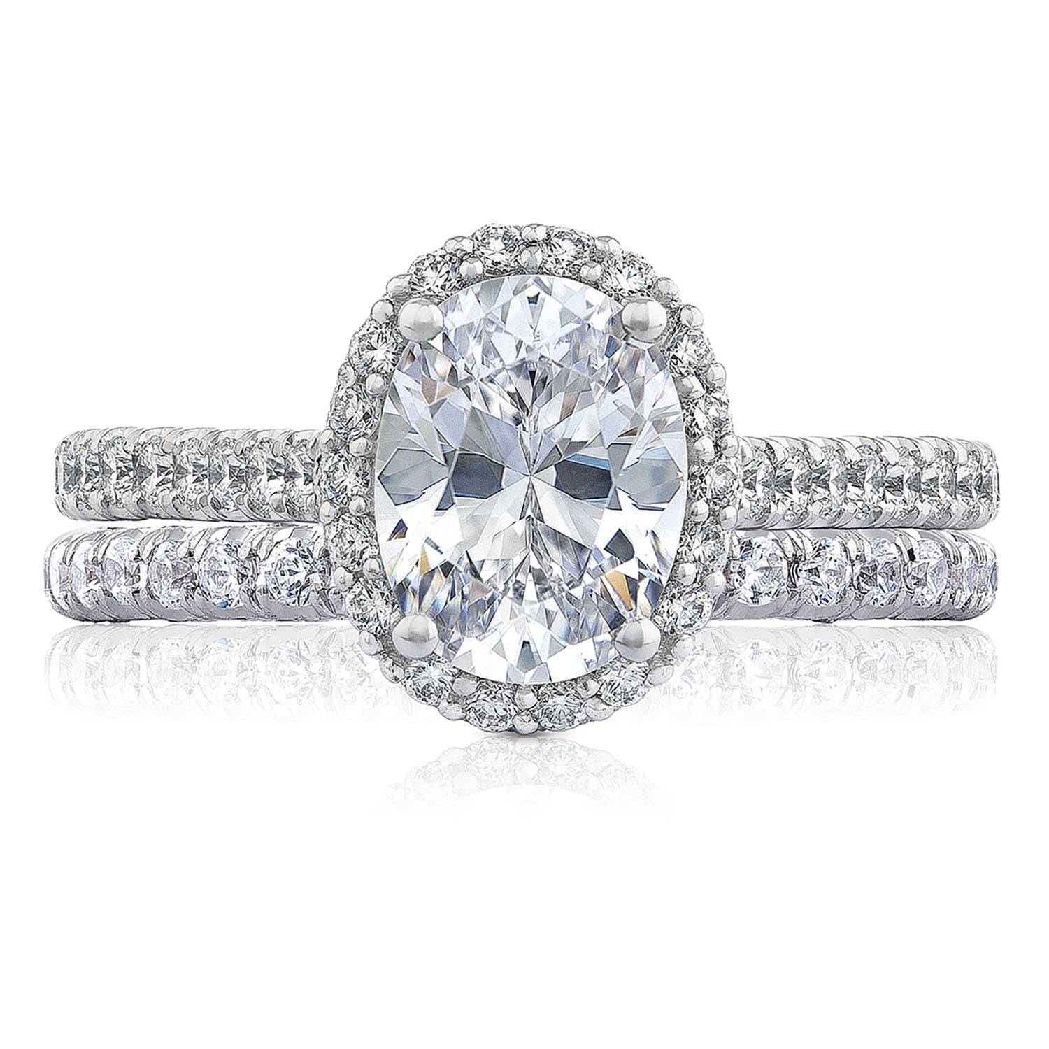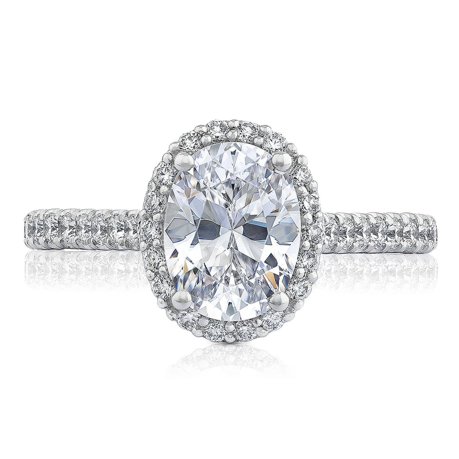 A bloom of diamonds enhances the center stone, which is set on a milgrain-detailed Cathedral foundation. Diamond-studded crescents accent the silhouette, while a pavé ceiling delivers extra radiance.