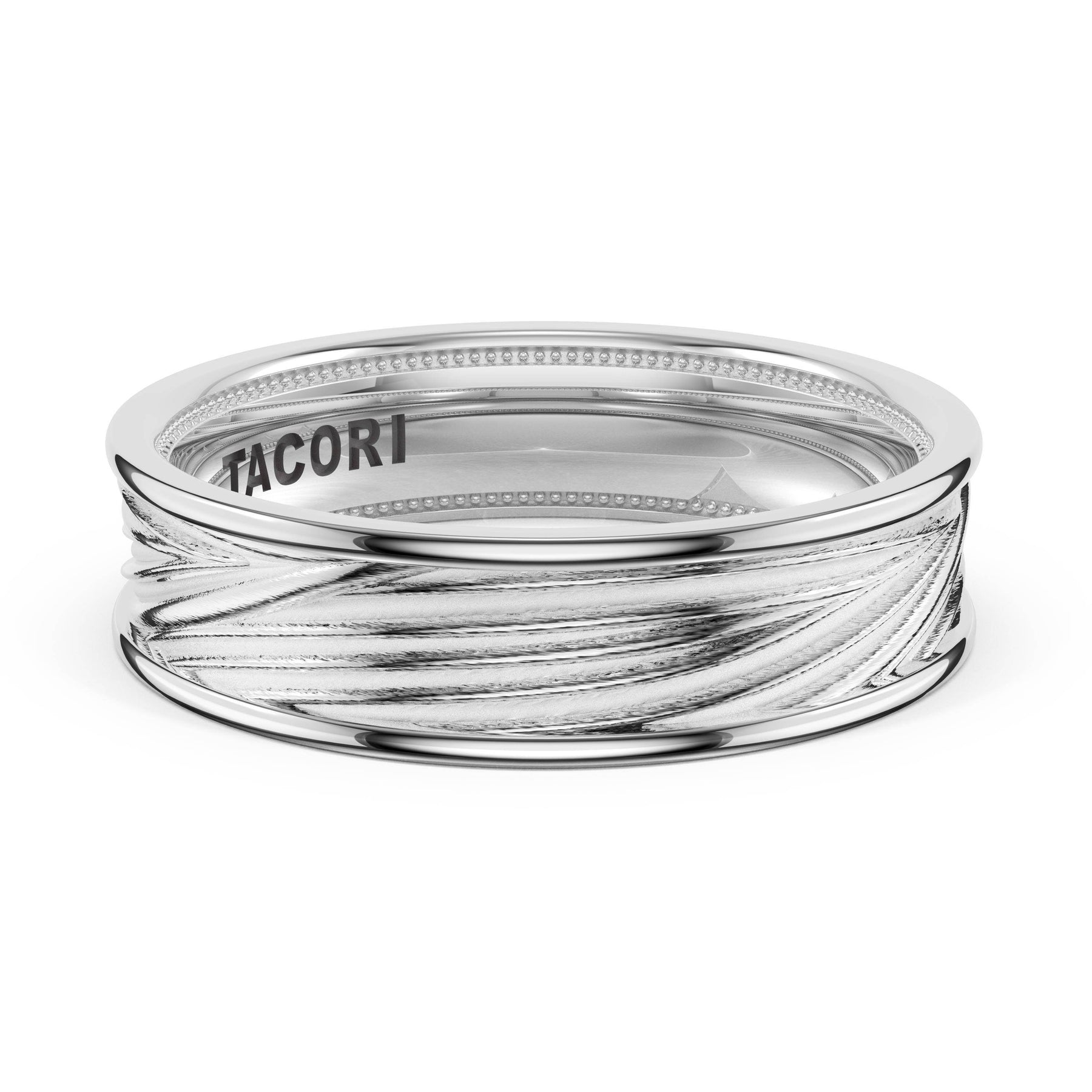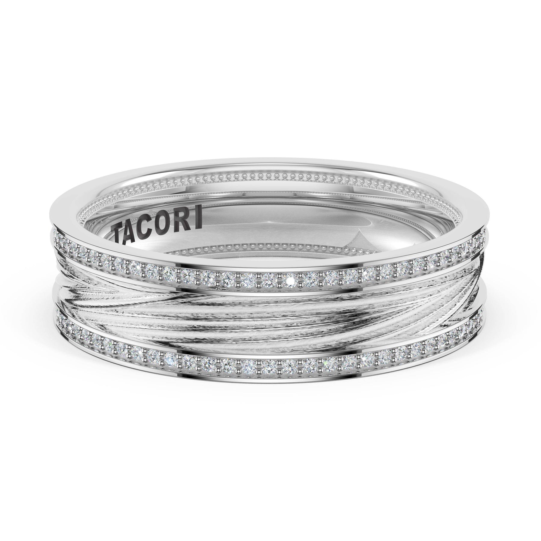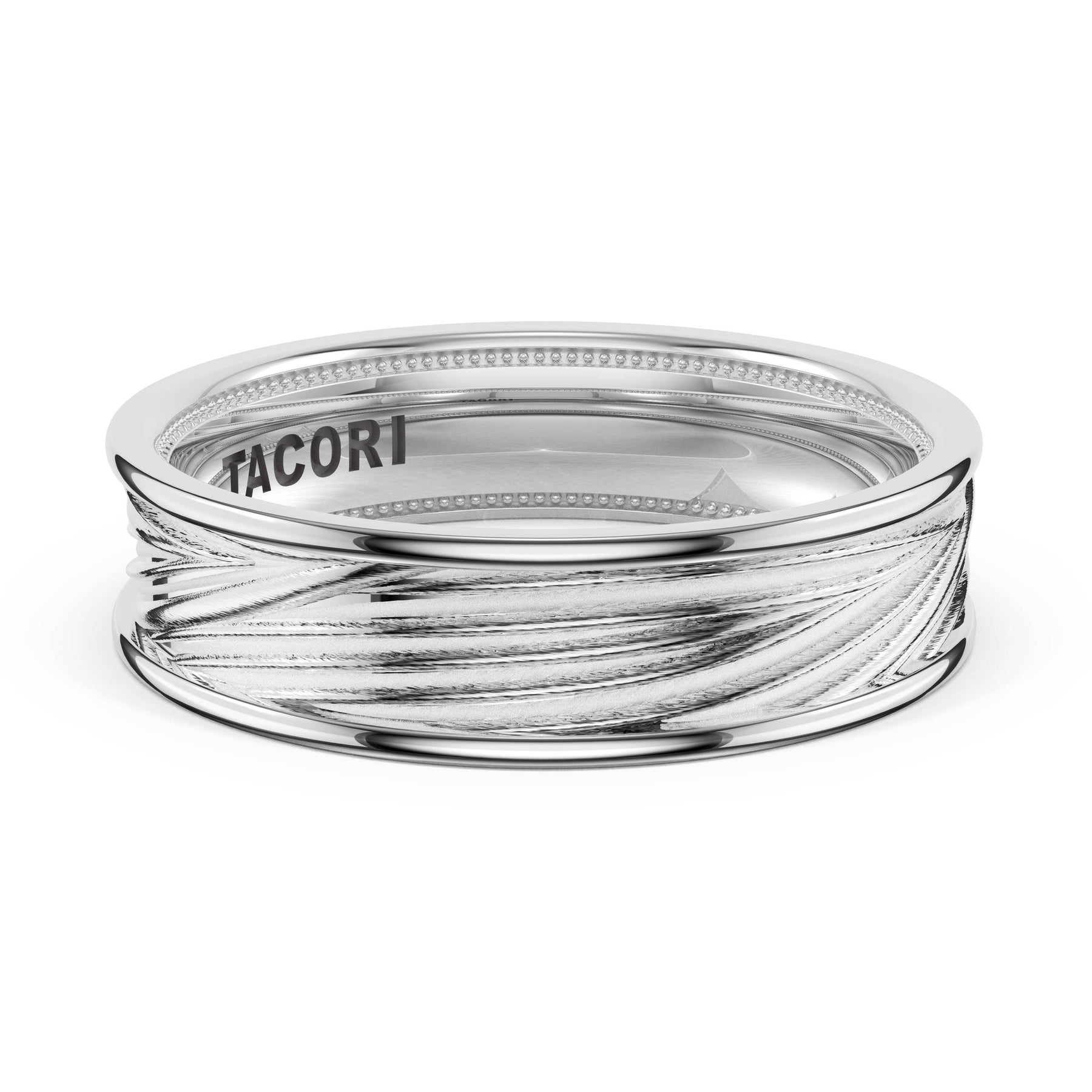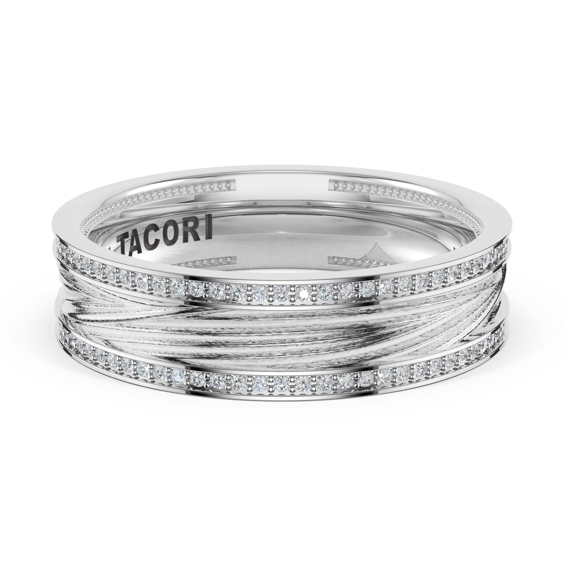 Organic texture flows across the high-polish foundation in fluid lines that catch and reflect light. A wide design showcasing TACORI's mastery of sculptural metalwork.