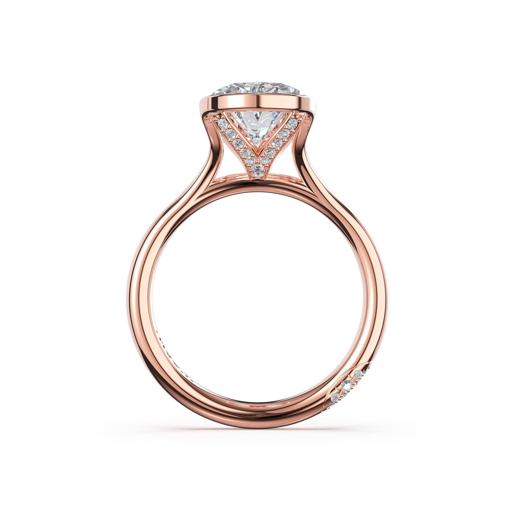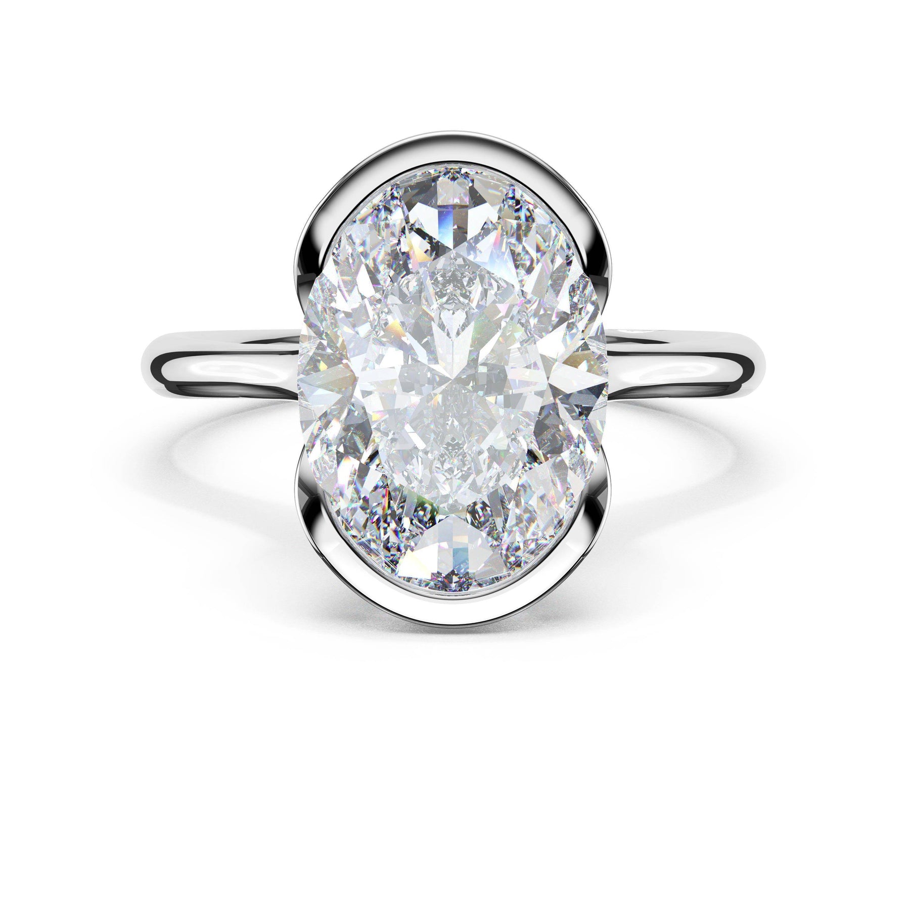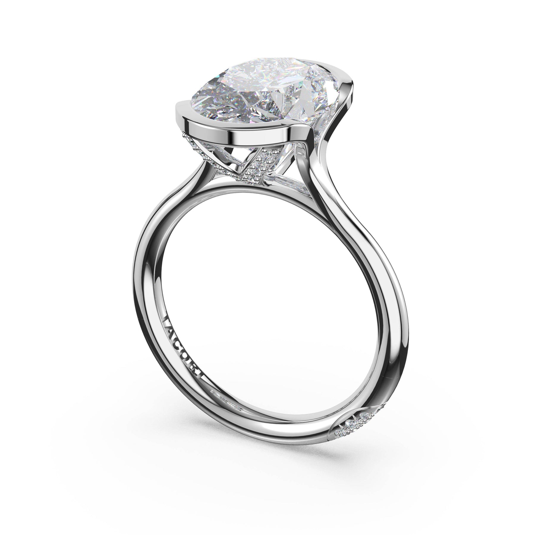 A tapering crown of pavé diamonds trace toward a north-south set oval-cut center stone in a semi-bezel setting, creating a refined sense of suspension and sparkle. The crown rises gracefully before meeting the high-polish foundation.