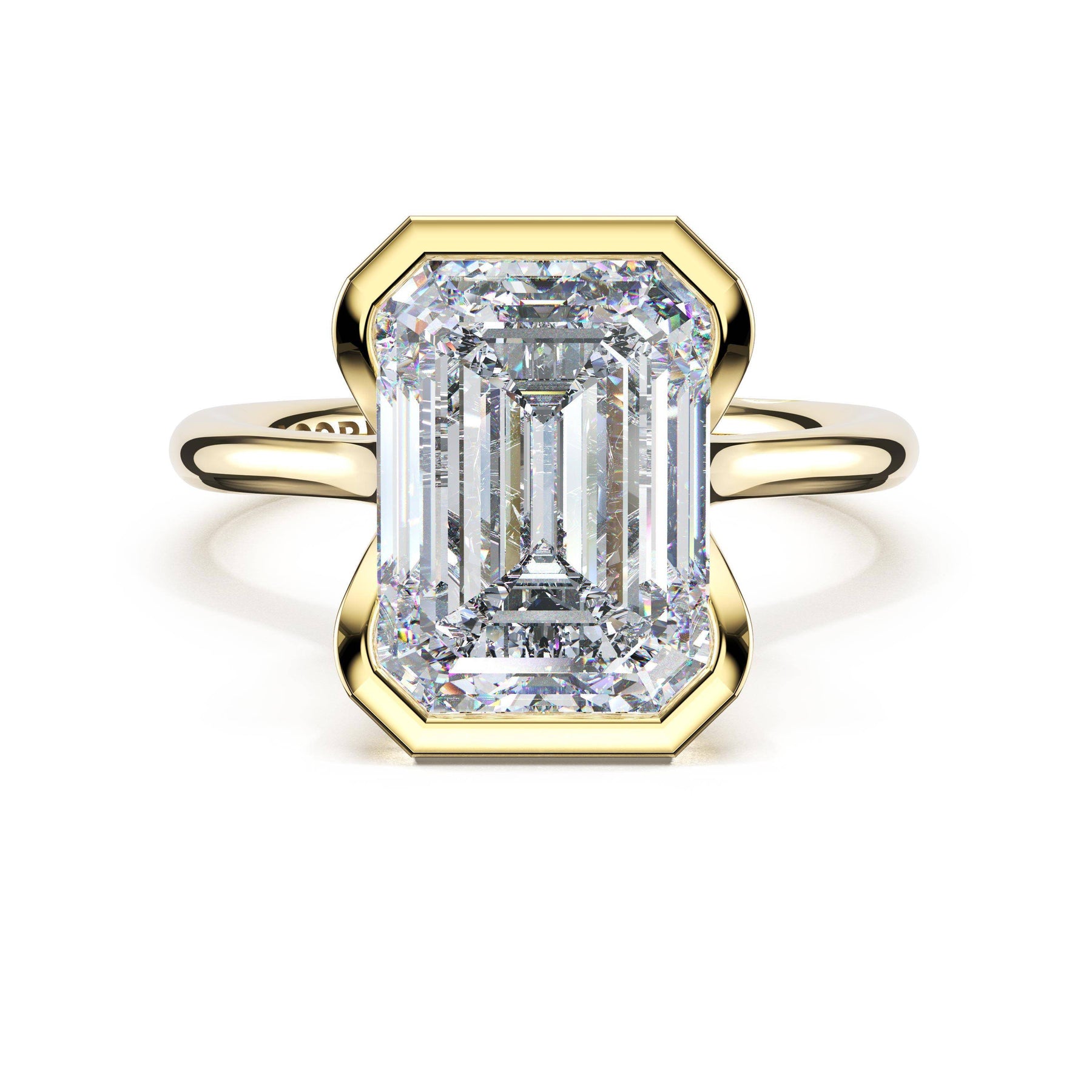A tapering crown of pavé diamonds trace toward a north-south set emerald-cut center stone in a semi-bezel setting, creating a refined sense of suspension and sparkle. The crown rises gracefully before meeting the high-polish foundation.