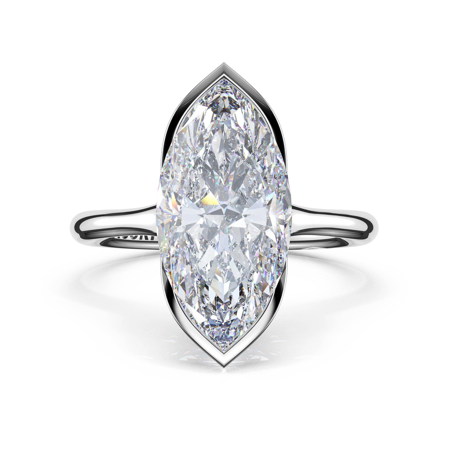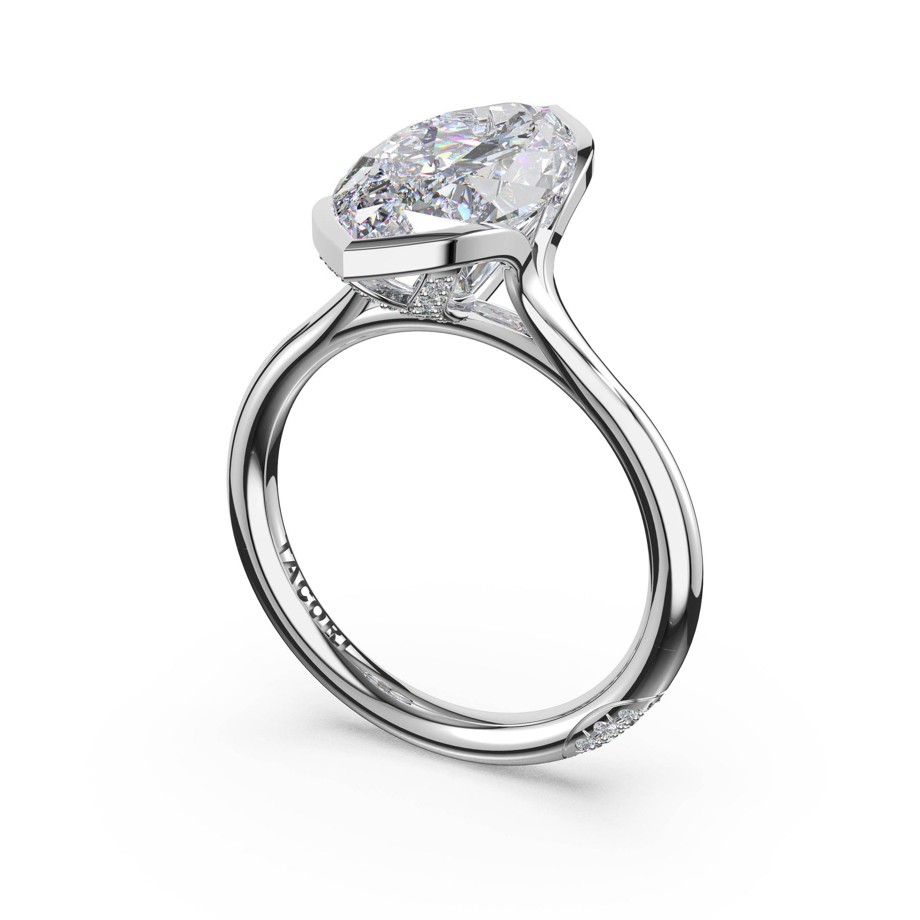 A tapering crown of pavé diamonds trace toward a north-south set marquise-cut center stone in a semi-bezel setting, creating a refined sense of suspension and sparkle. The crown rises gracefully before meeting the high-polish foundation.