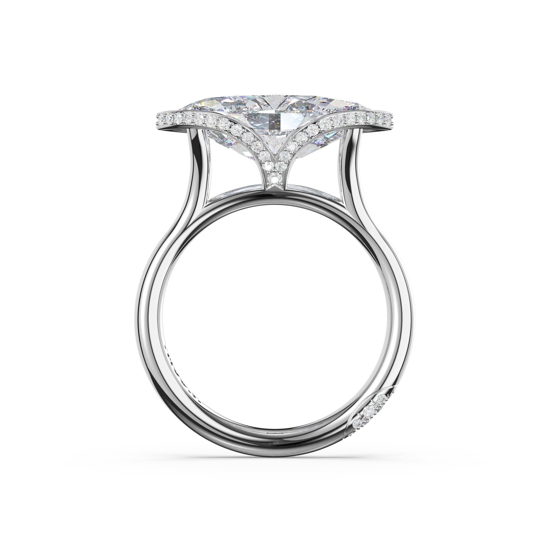 A tapering pavé bloom frames an east-west set marquise-cut diamond in a semi-bezel setting, creating a refined sense of lift and light. The crown flows seamlessly into a slender high-polish foundation.