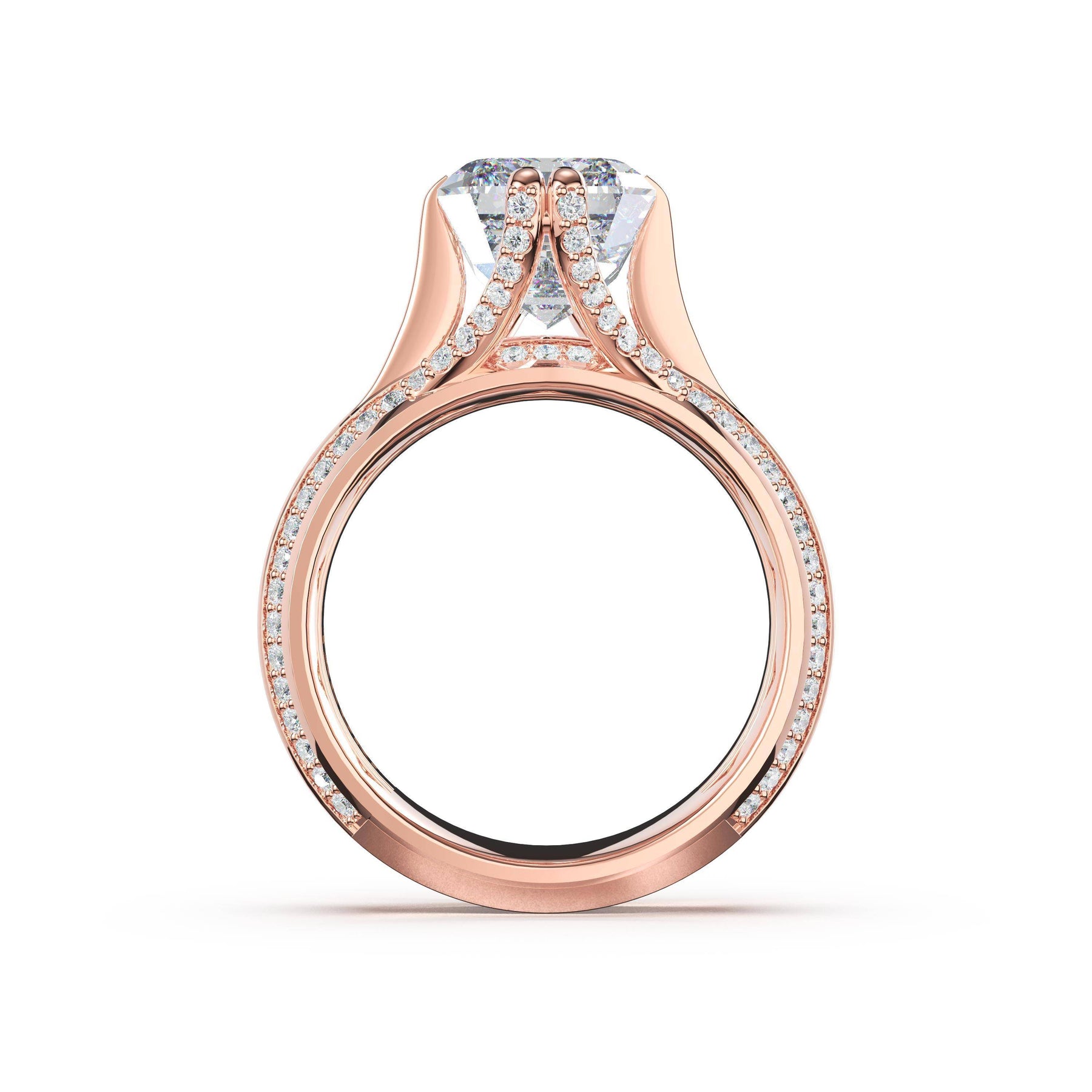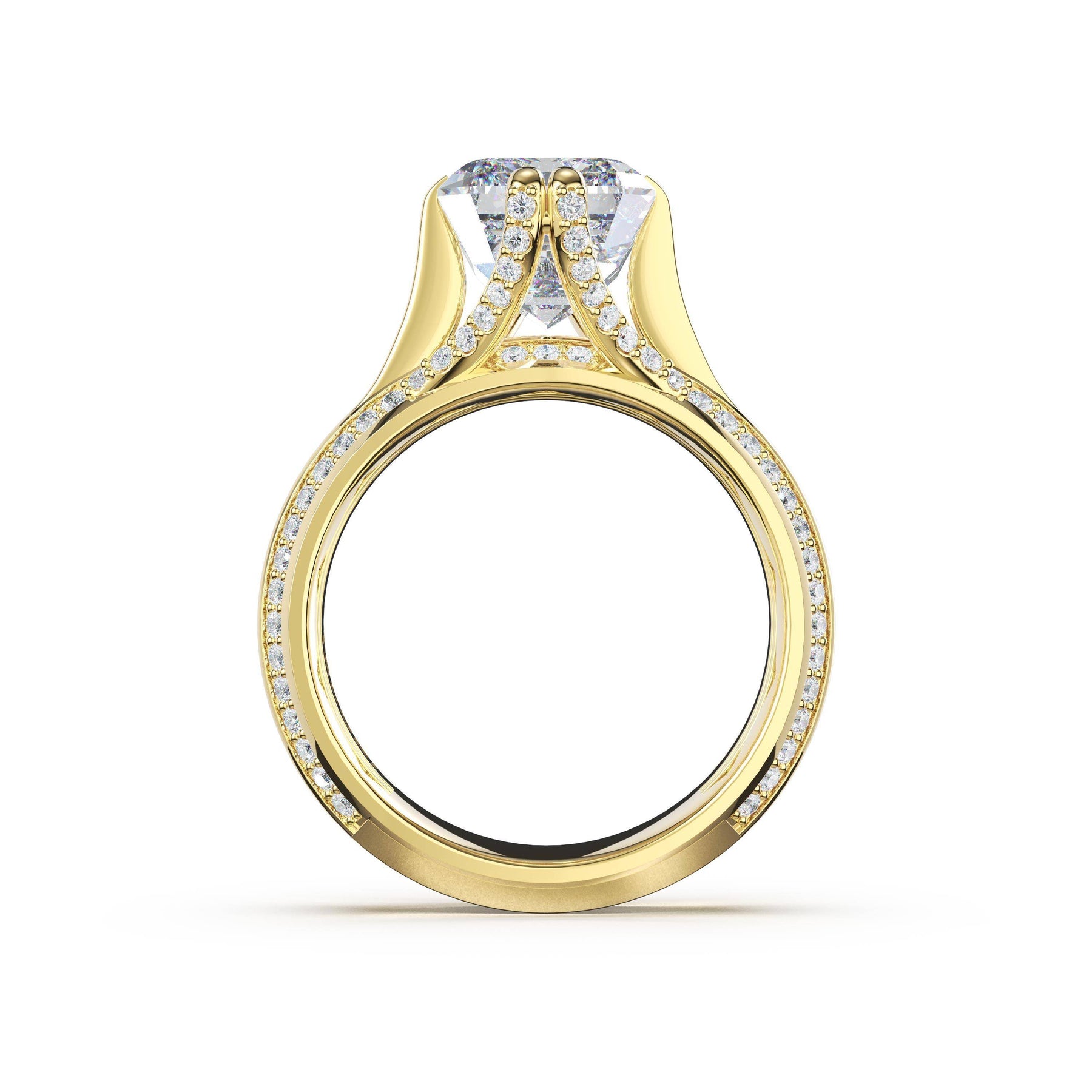 The wide high-polish foundation makes a bold statement, accented with pavé diamonds that sparkle along the open crown of the radiant-cut center stone, creating luminous depth and dimensional brilliance.