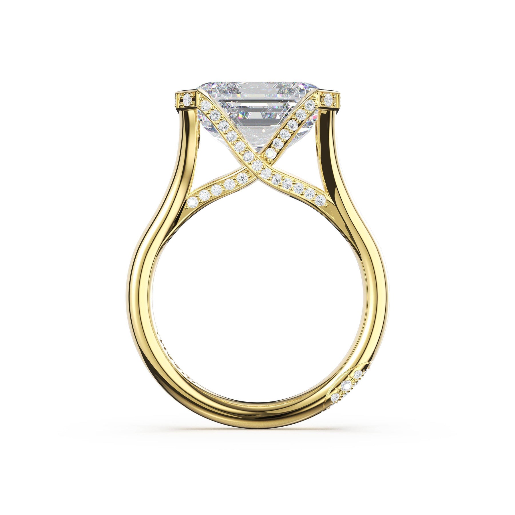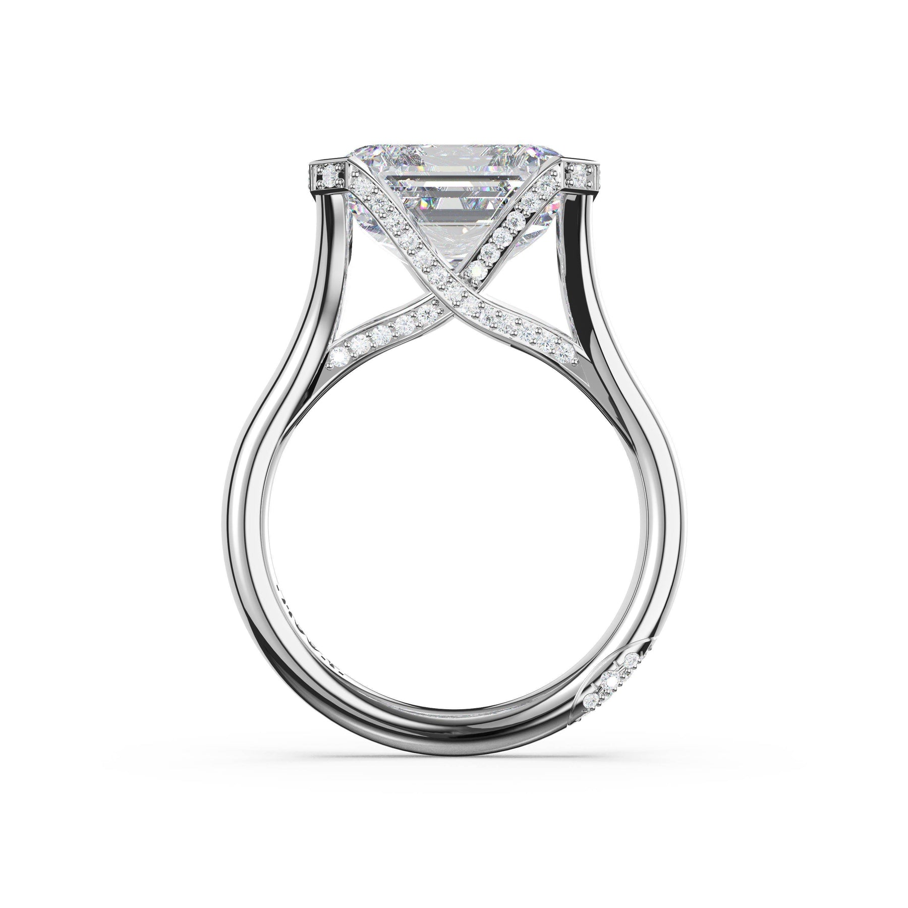 A unique pavé-crossed Cathedral setting elevates a magnificent semi bezel-set emerald-cut diamond on a high-polish foundation, creating a refined sense of suspension and architectural presence.