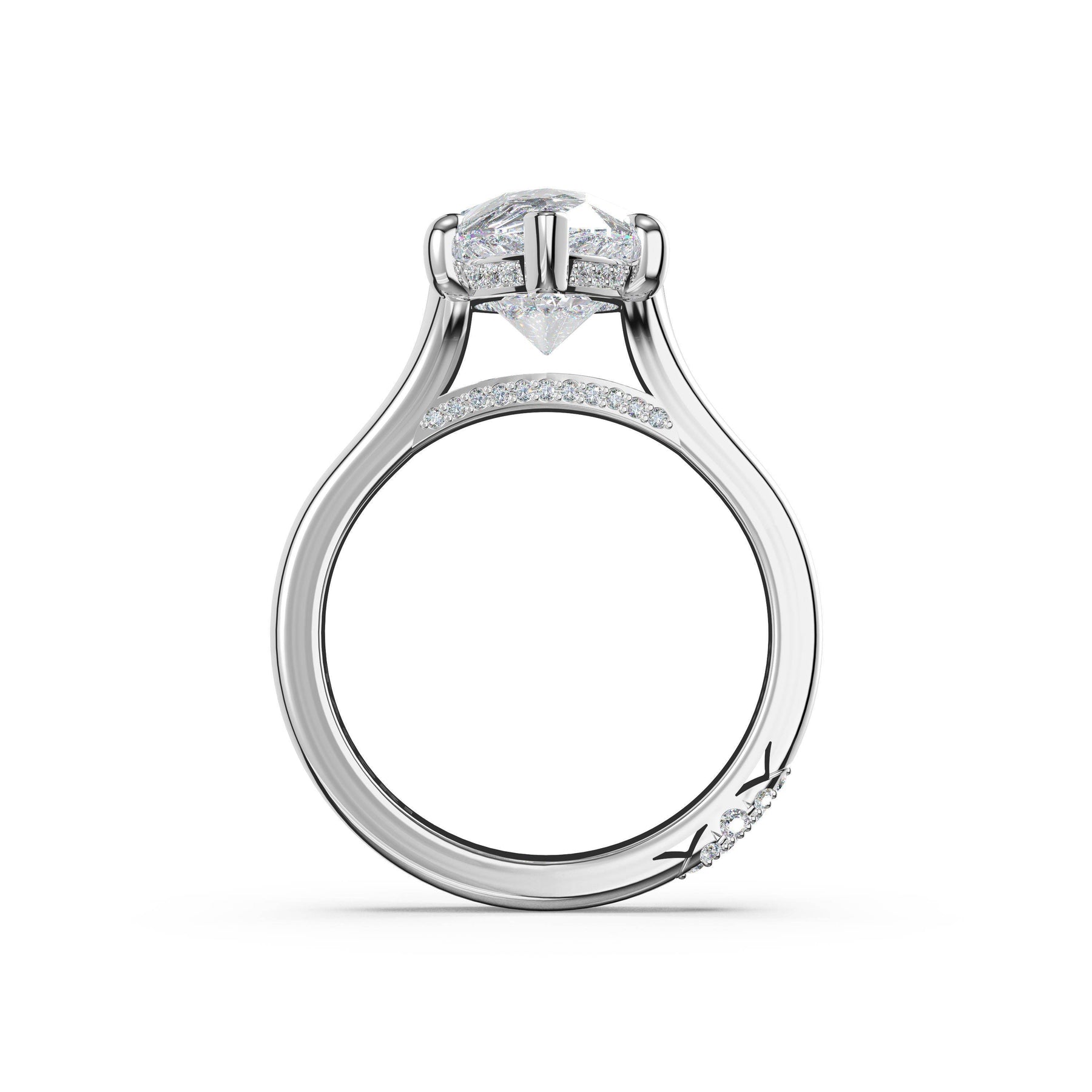 The wide high-polish foundation makes a bold statement, accented with pavé diamonds that sparkle along the open crown of the pear-cut center stone, creating luminous depth and dimensional brilliance.