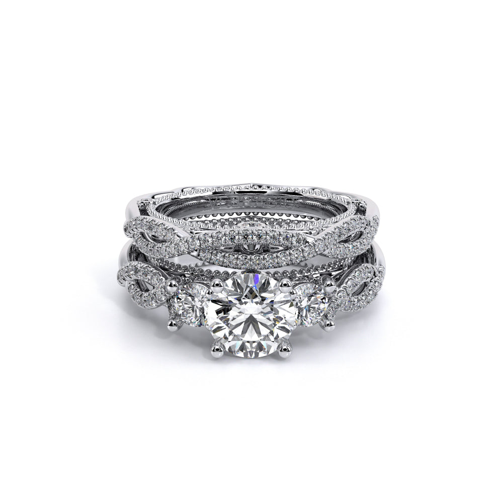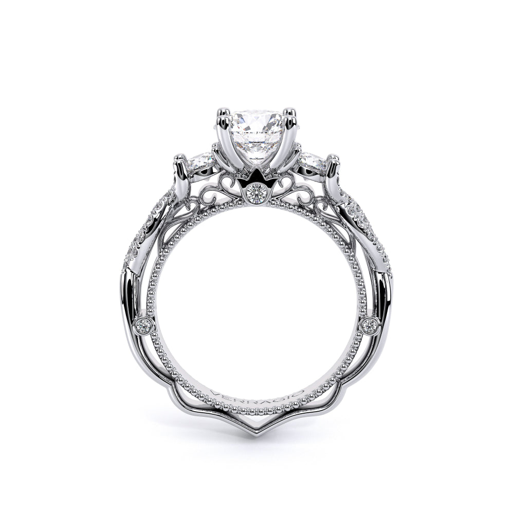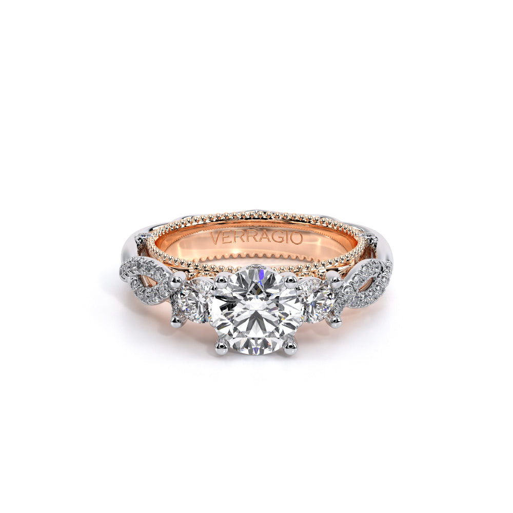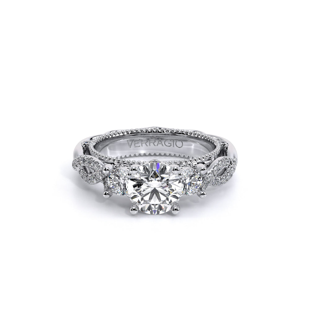 VENETIAN-5013R is a classic representation of a three stone diamond engagement ring. Featuring, two round side diamonds seemlesly integrated on a twisted diamond shank. The beautiful handcrafted lace and Verragio signature beading completes this stunning piece of art.