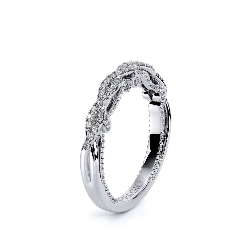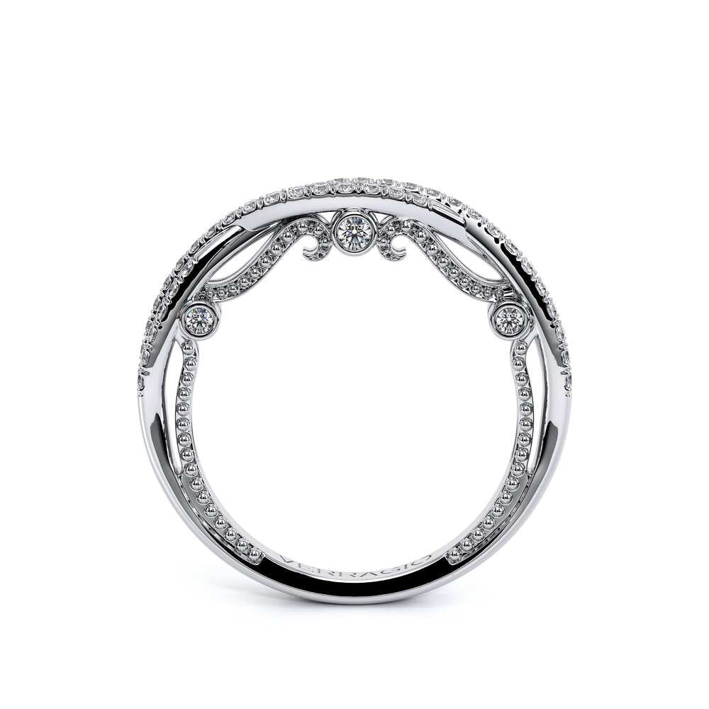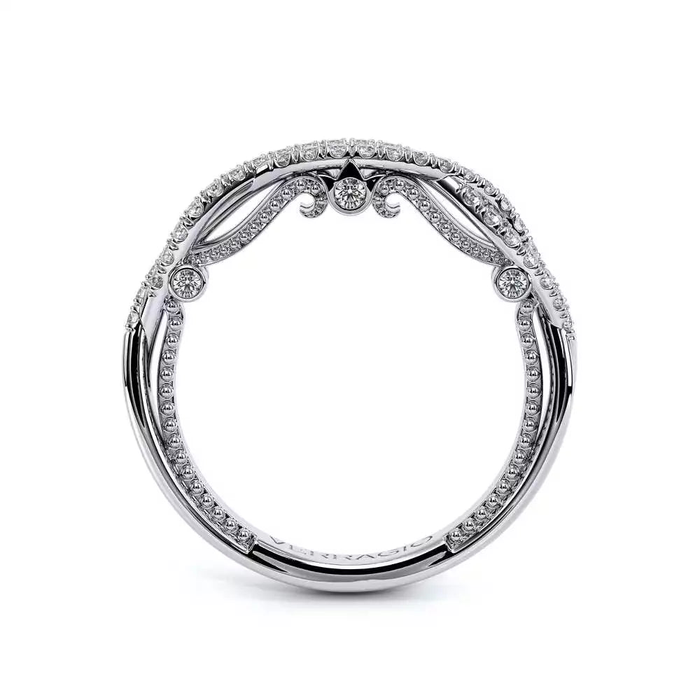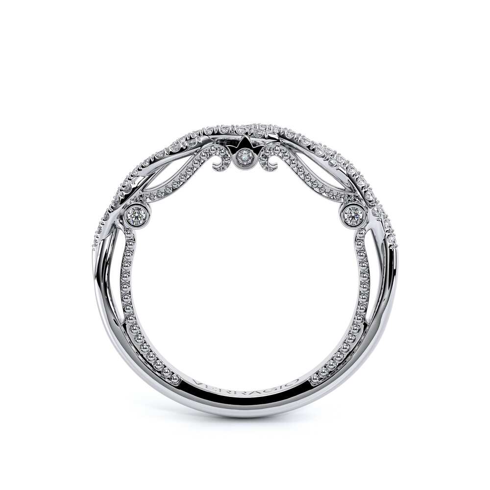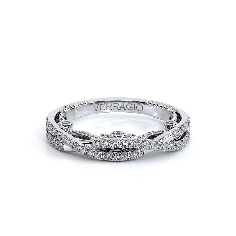 INSIGNIA-7070W diamond wedding ring from the Insignia Collection, featuring round brilliant-cut diamonds pave set on a twisted band. Unique with bezel set diamonds with distinguishing Insignia Scrollwork accompanied by Verragio's timeless signature beading and crest.