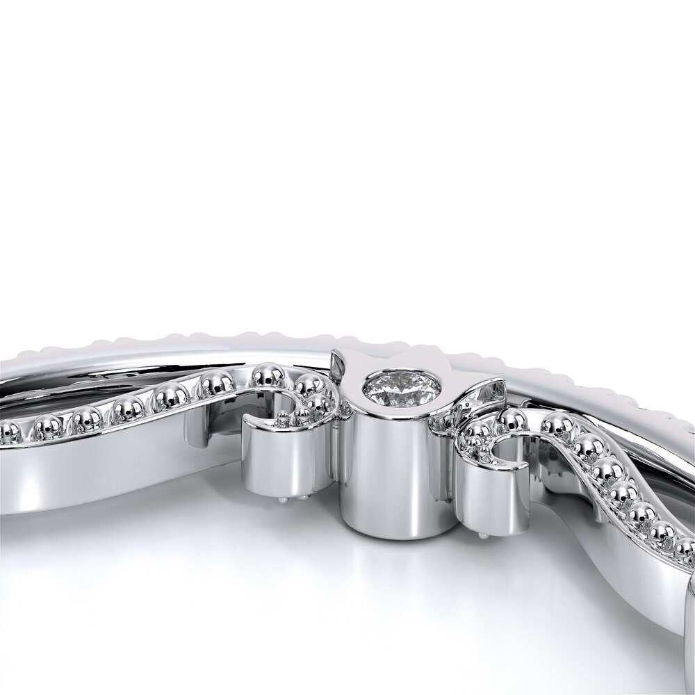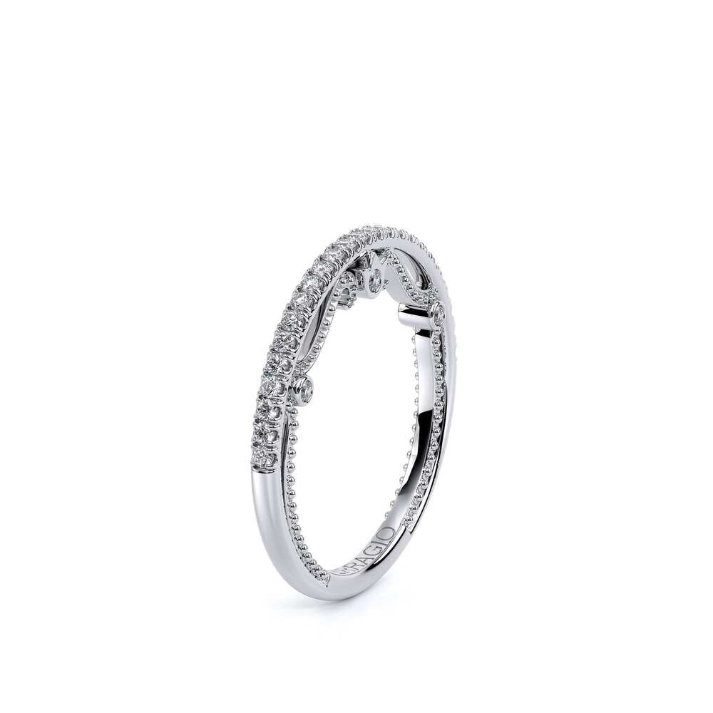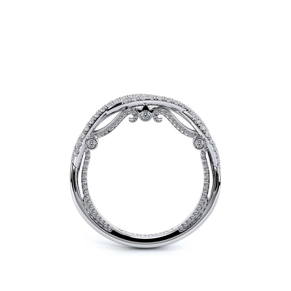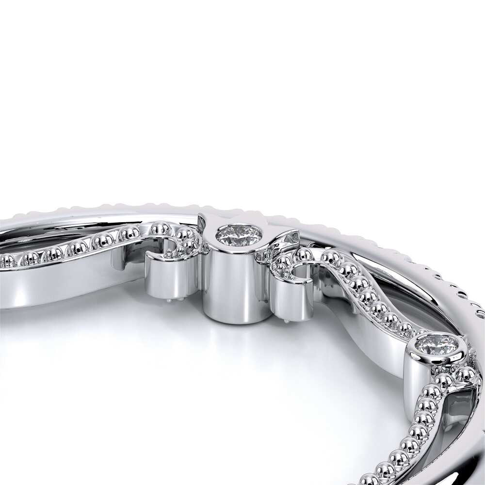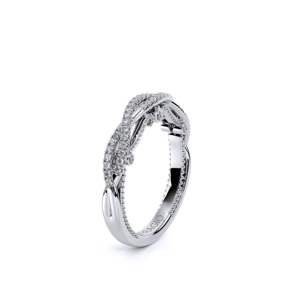 INSIGNIA-7070W diamond wedding ring from the Insignia Collection, featuring round brilliant-cut diamonds pave set on a twisted band. Unique with bezel set diamonds with distinguishing Insignia Scrollwork accompanied by Verragio's timeless signature beading and crest.