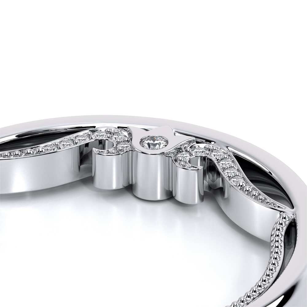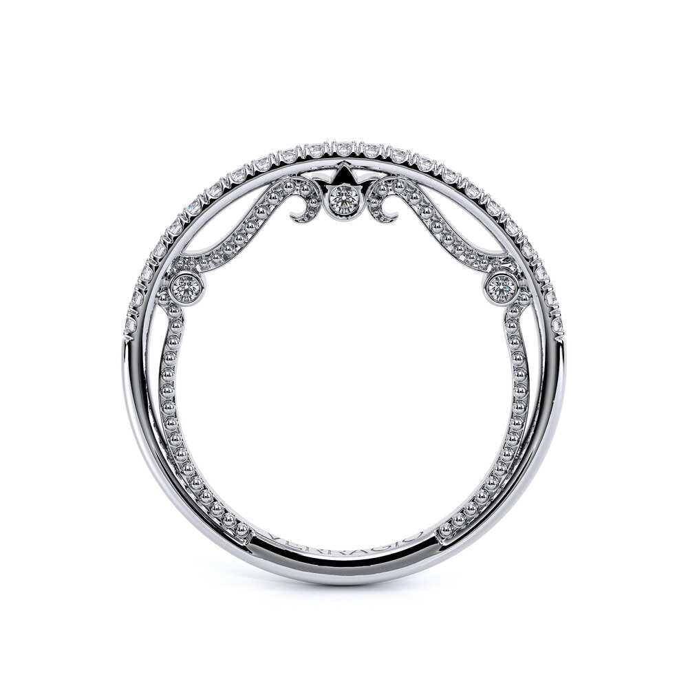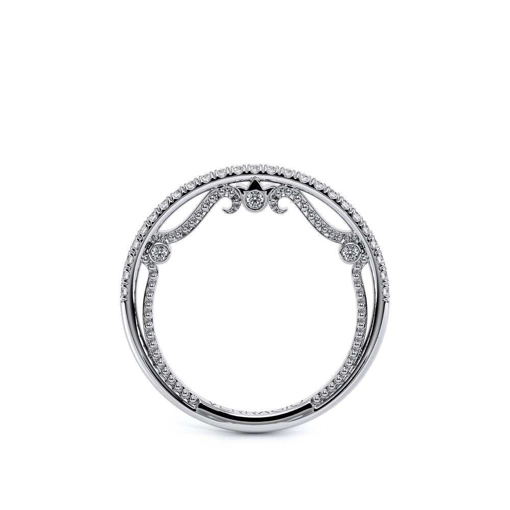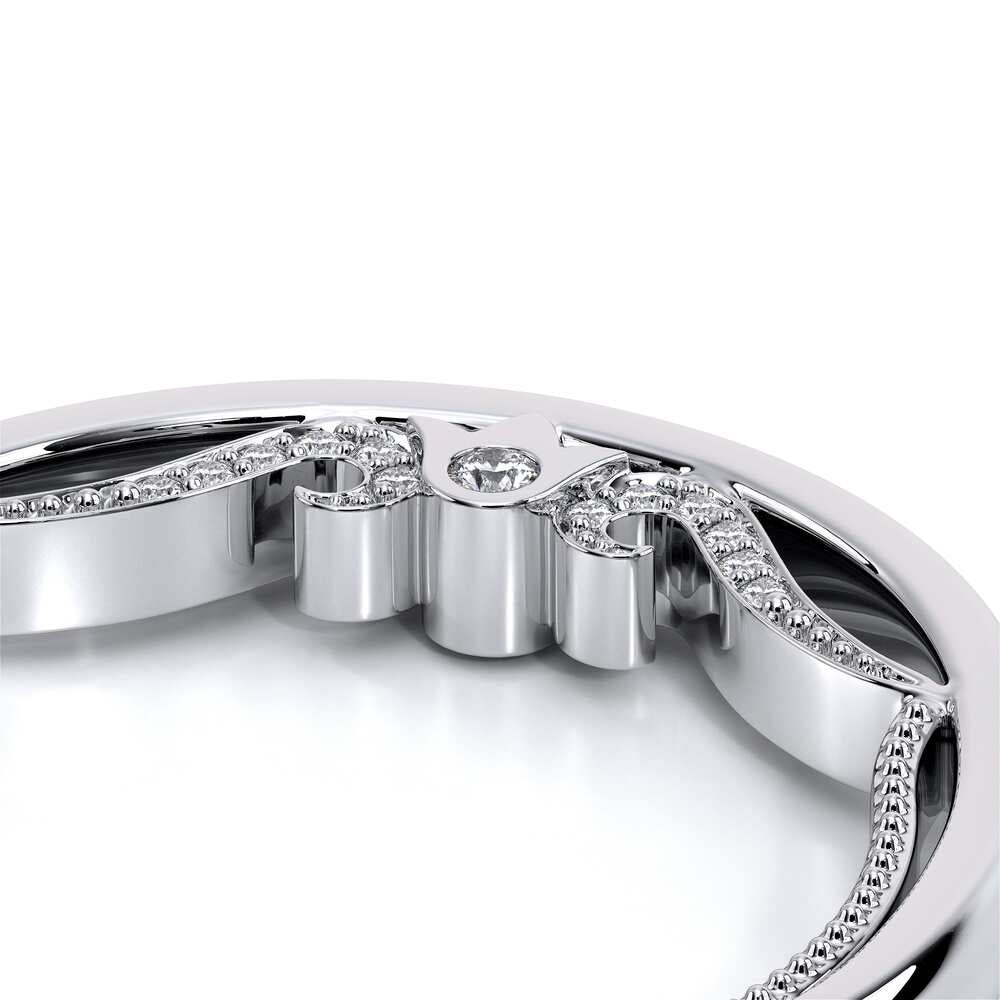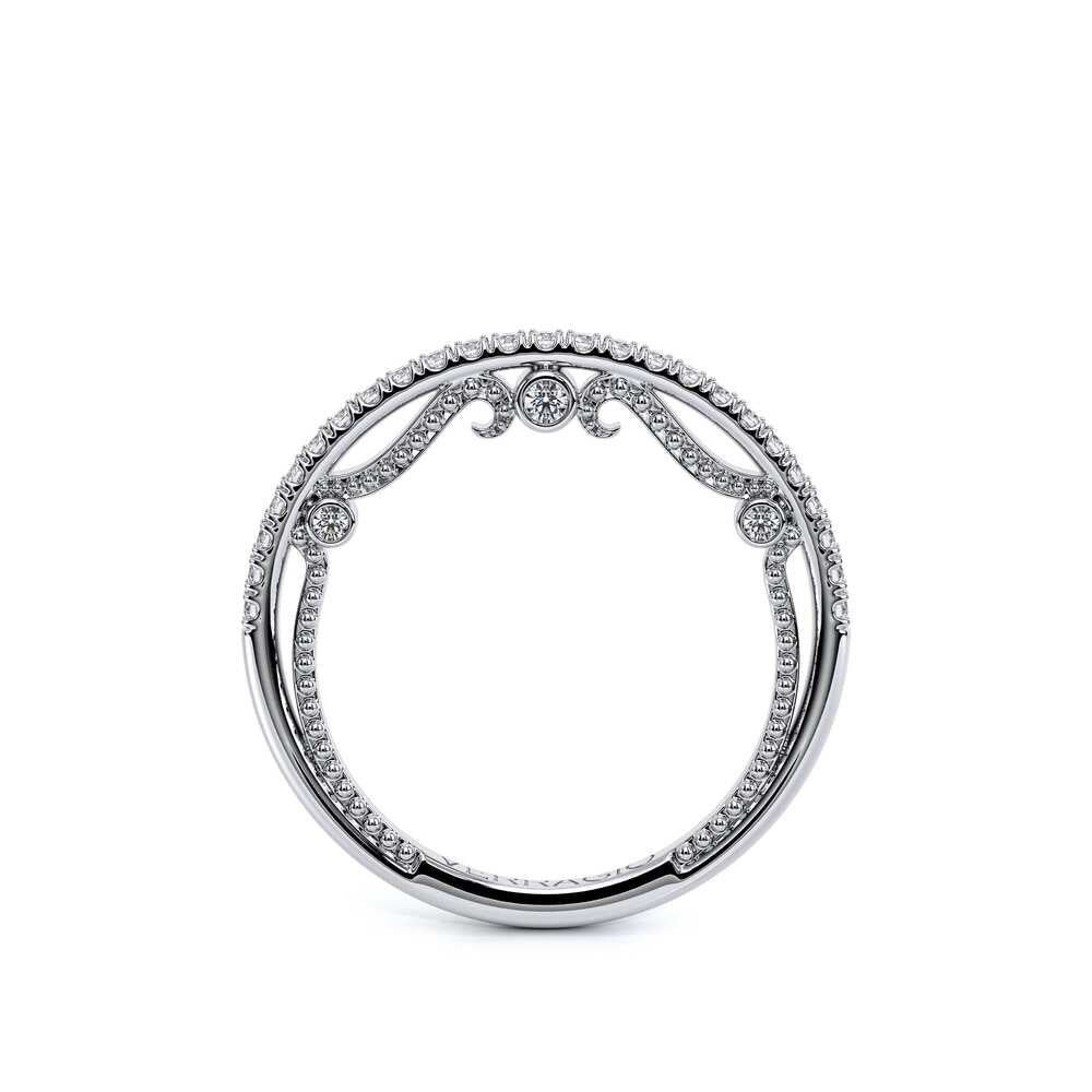INSIGNIA-7087WSB diamond wedding ring from the Insignia Collection, featuring round brilliant-cut diamonds pave set on a straight band. Unique with bezel set diamonds with distinguishing Insignia Scrollwork accompanied by Verragio's signature beading.