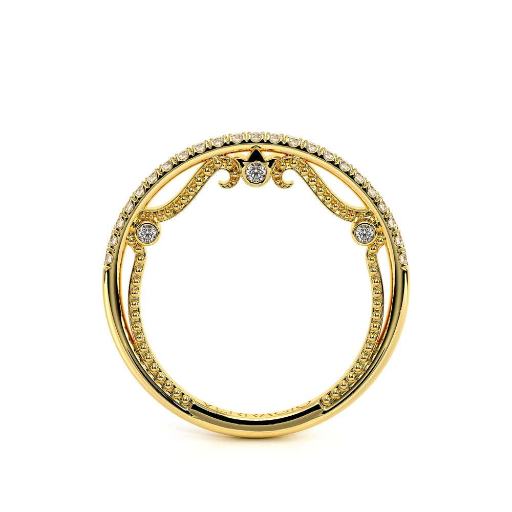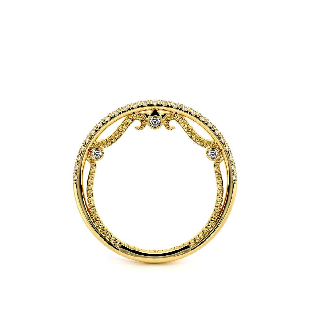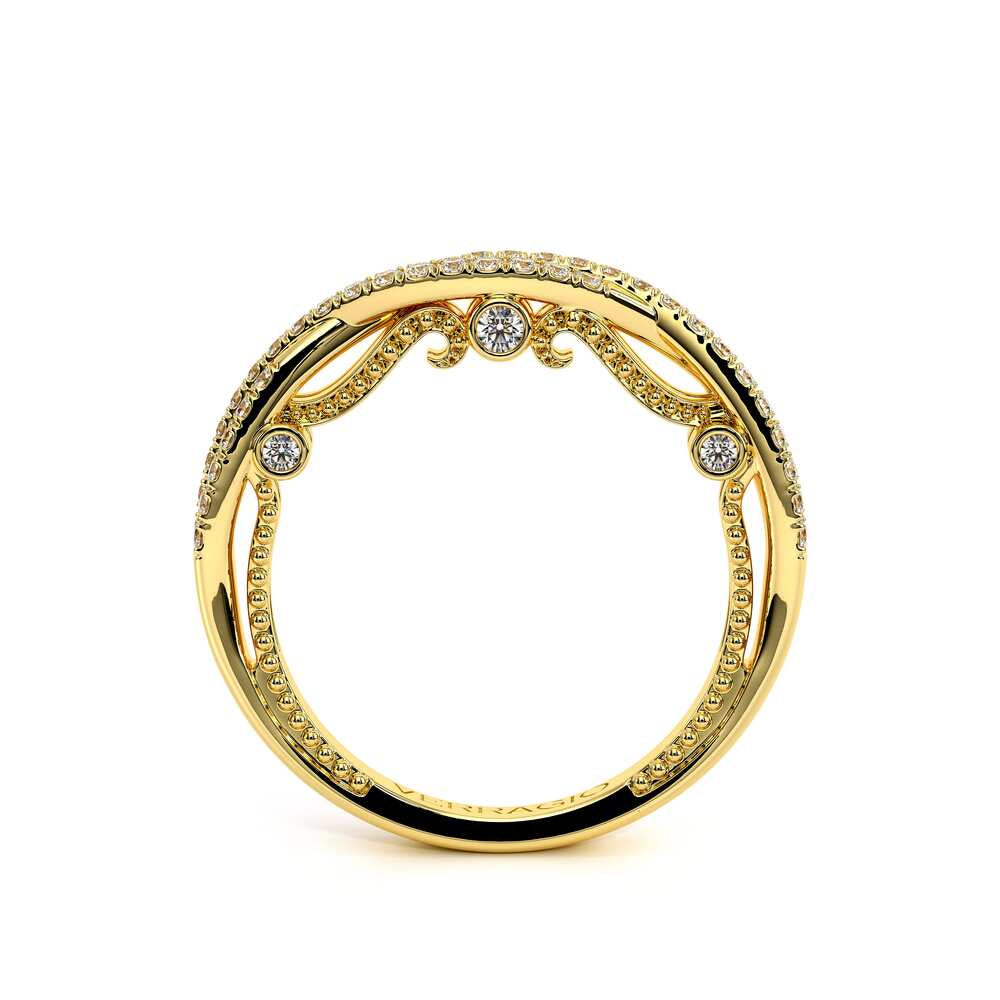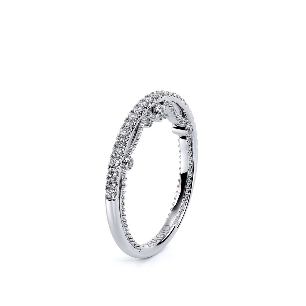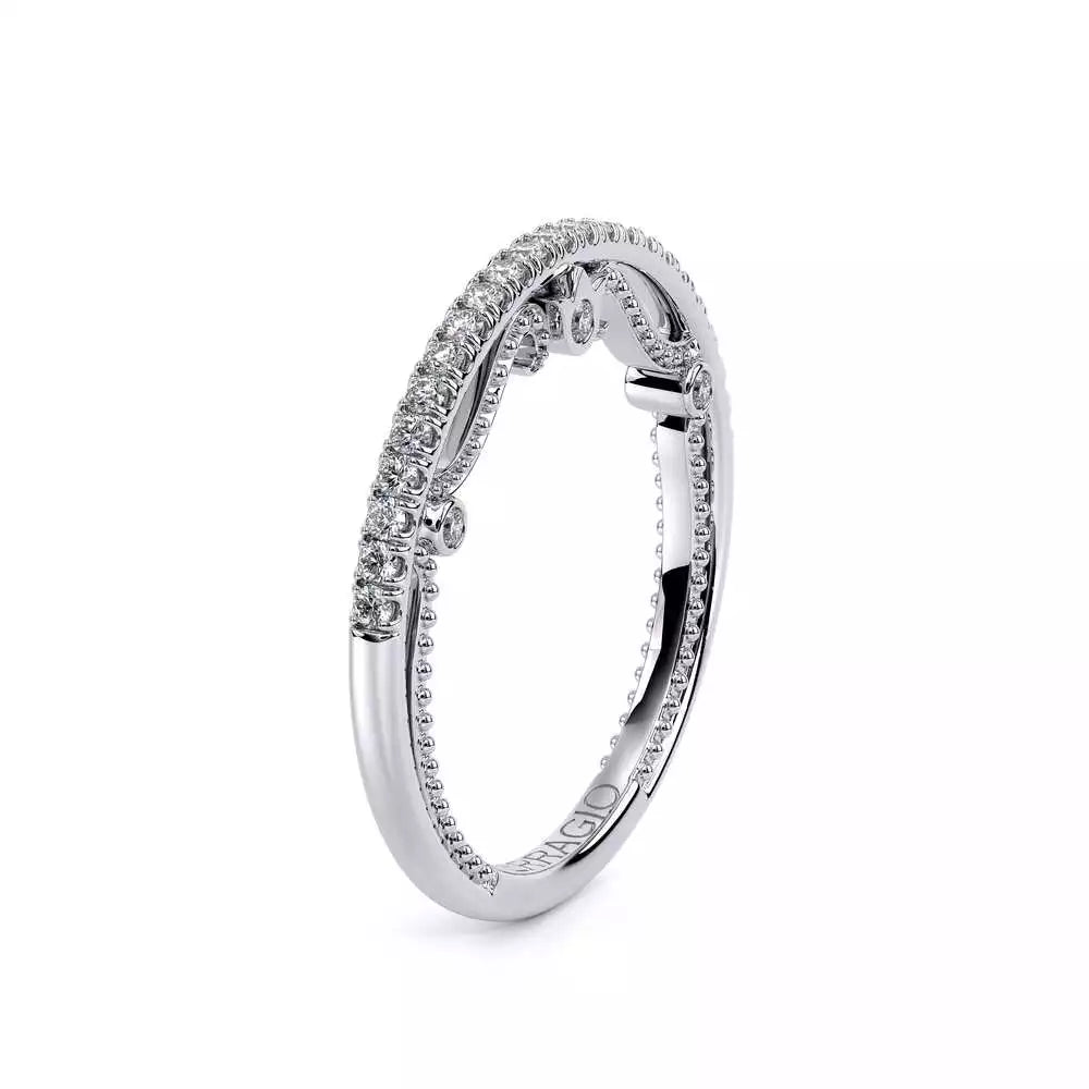 INSIGNIA-7087WSB diamond wedding ring from the Insignia Collection, featuring round brilliant-cut diamonds pave set on a straight band. Unique with bezel set diamonds with distinguishing Insignia Scrollwork accompanied by Verragio's signature beading.