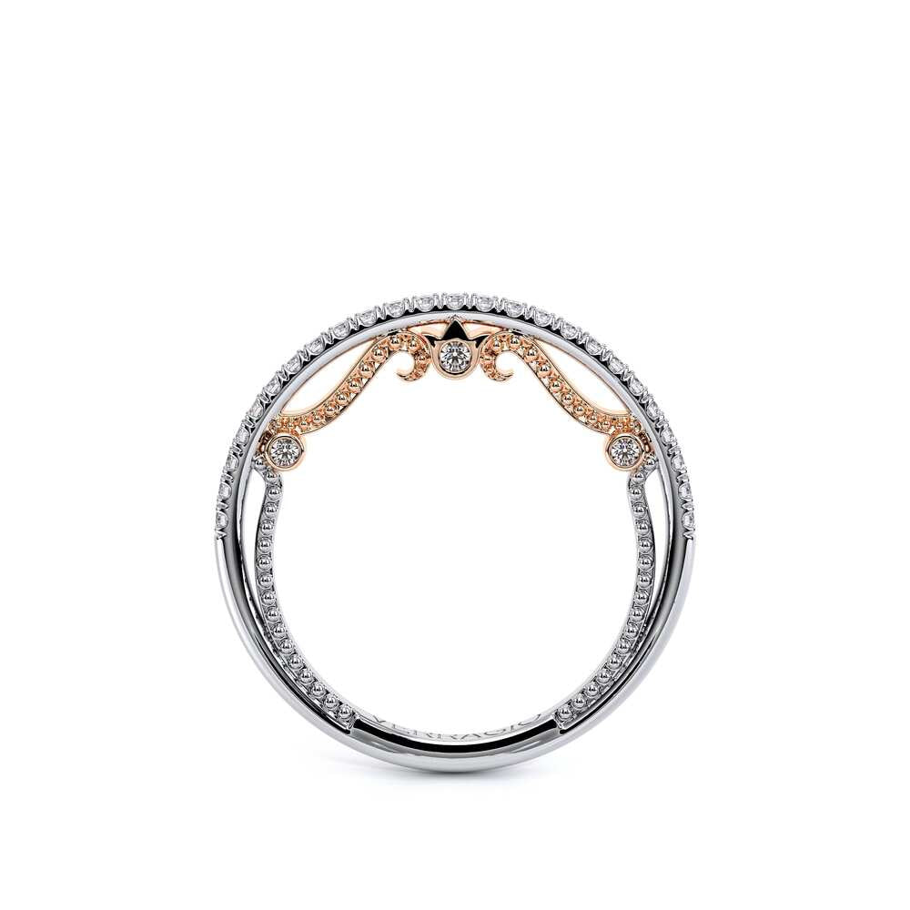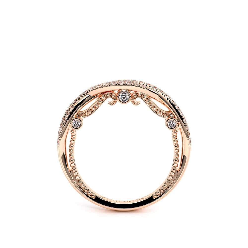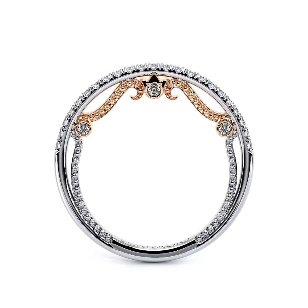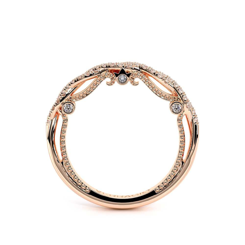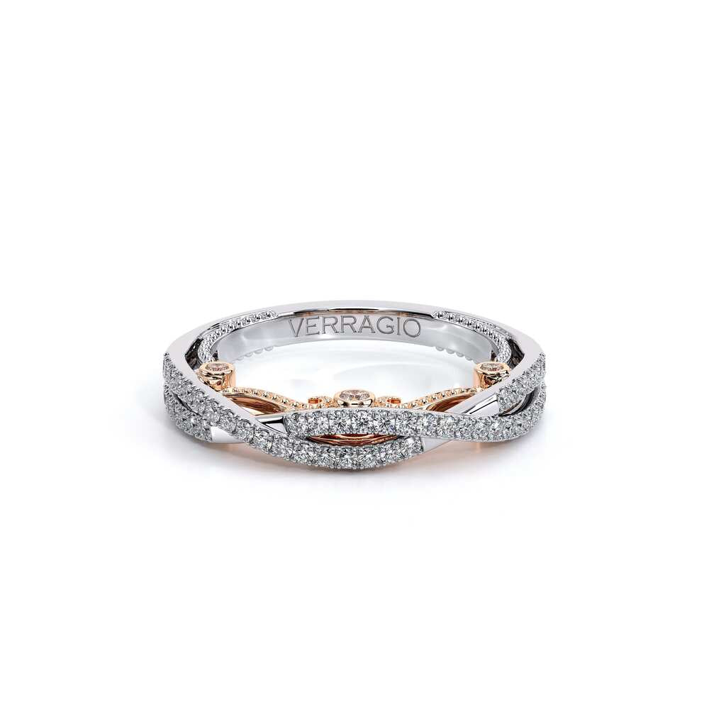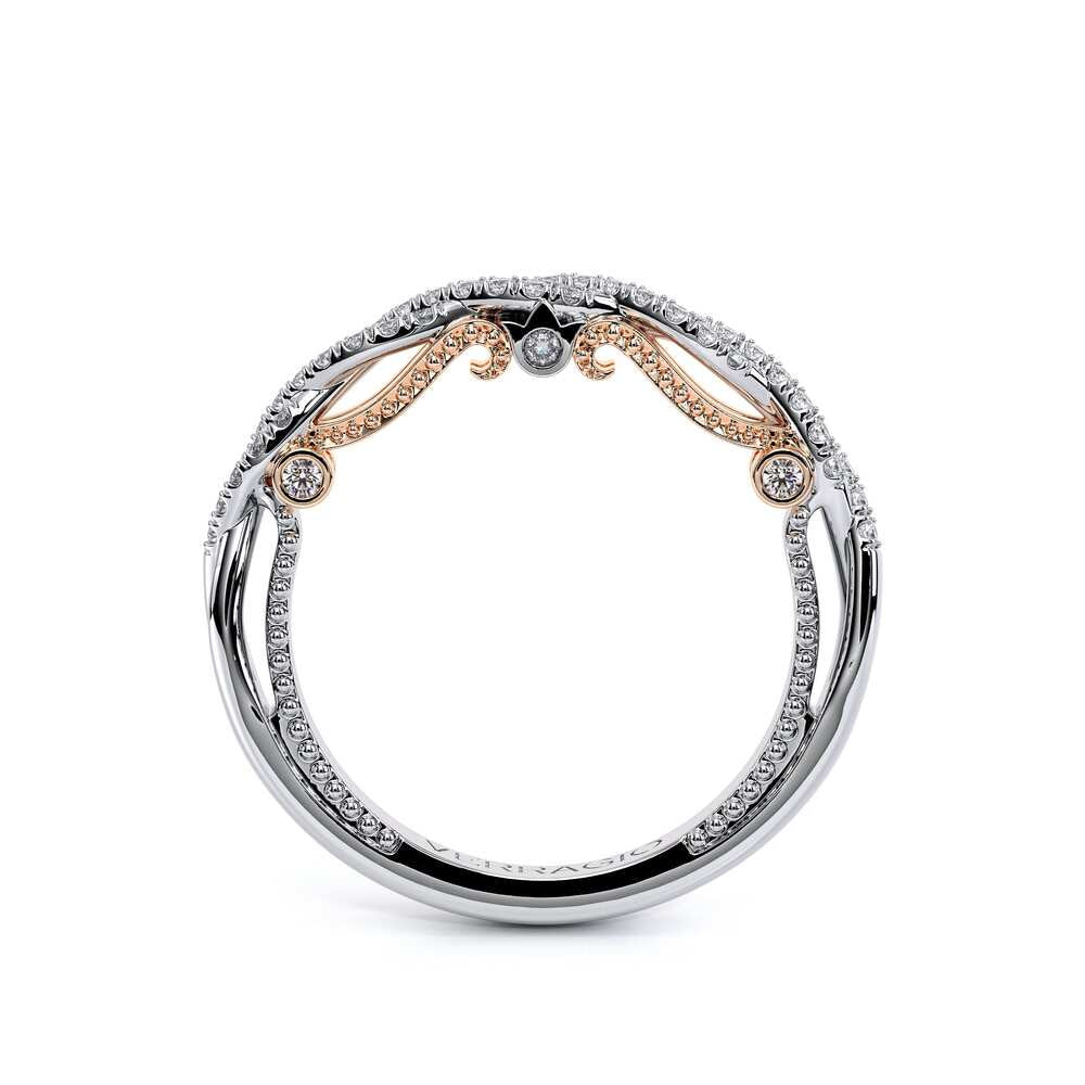 INSIGNIA-7084W-TT wedding ring from the Insignia Collection, featuring round brilliant-cut diamonds pave set on a twisted band. Unique with bezel set diamonds and distinguishing Rose Gold Insignia Scrollwork accompanied by Verragio's signature beading.