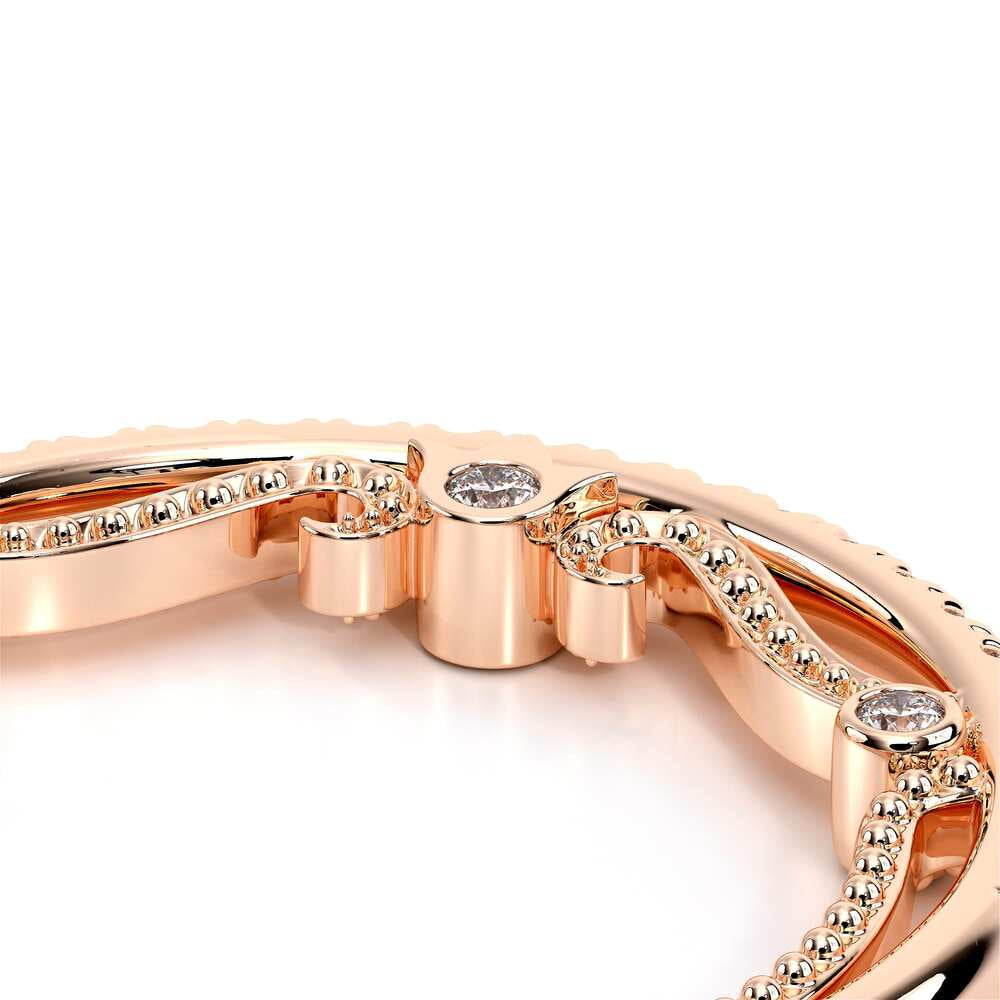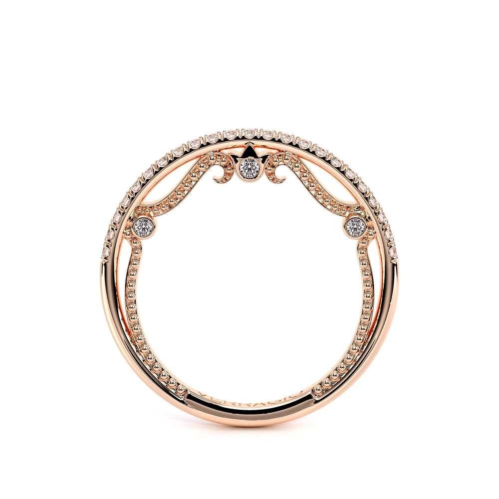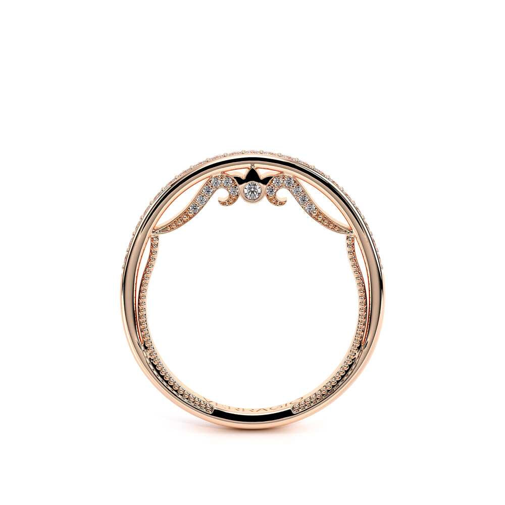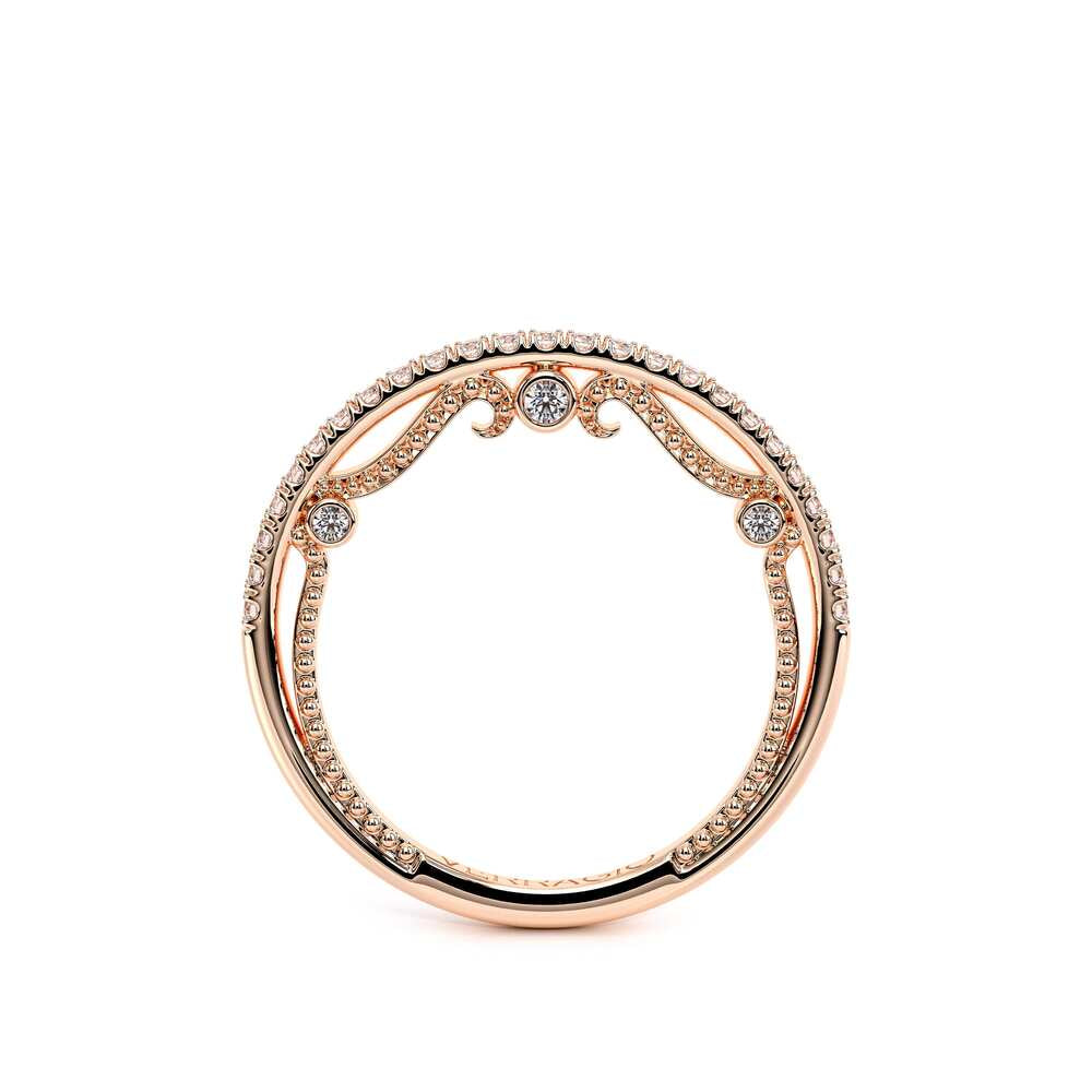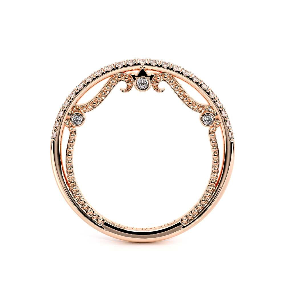 INSIGNIA-7084W-TT wedding ring from the Insignia Collection, featuring round brilliant-cut diamonds pave set on a twisted band. Unique with bezel set diamonds and distinguishing Rose Gold Insignia Scrollwork accompanied by Verragio's signature beading.