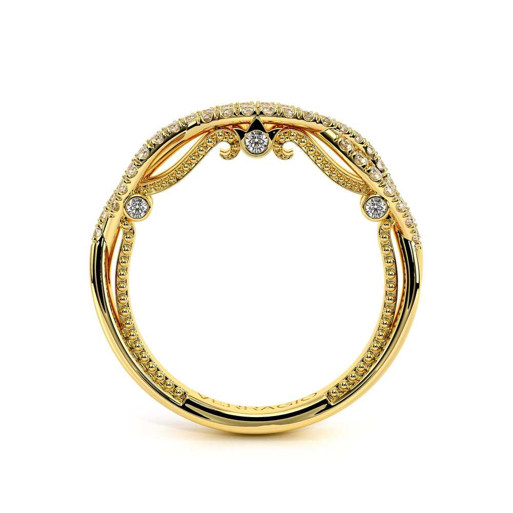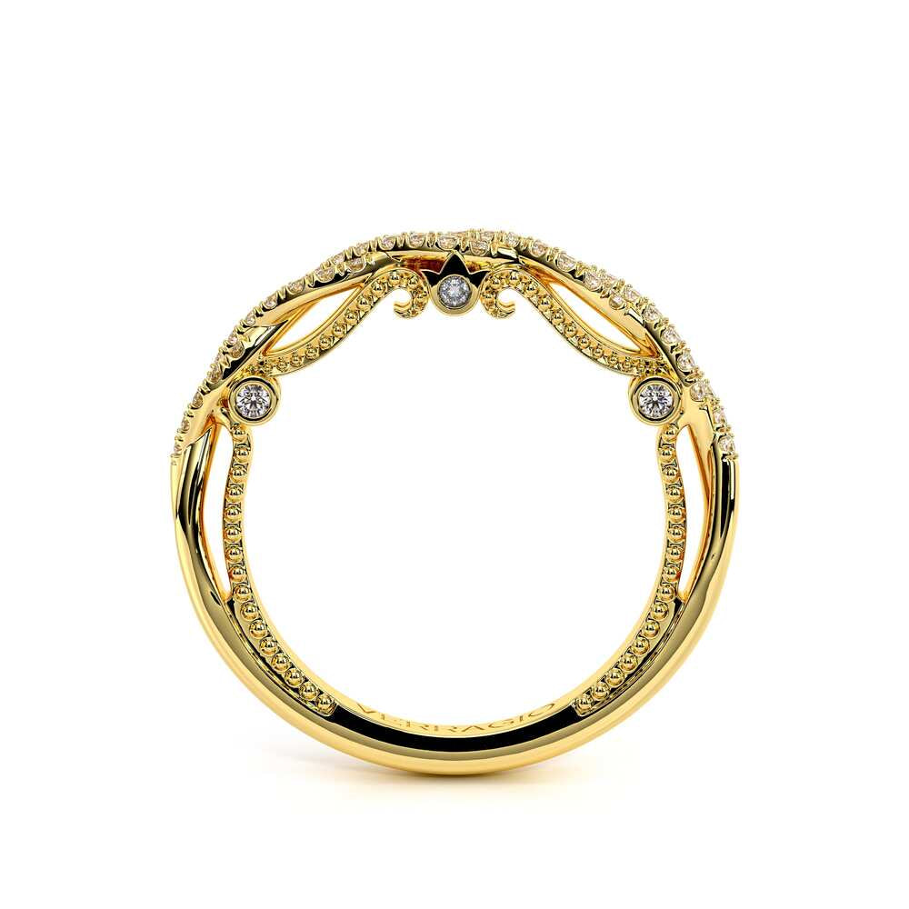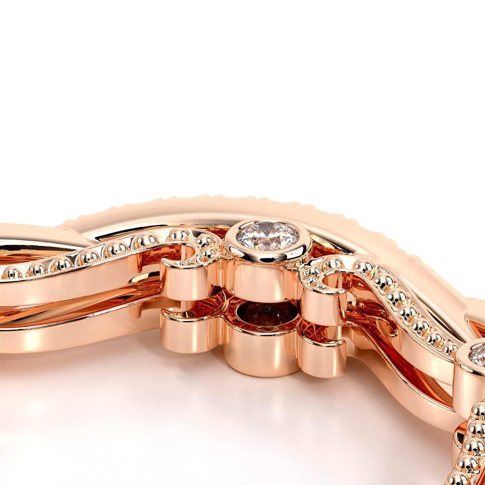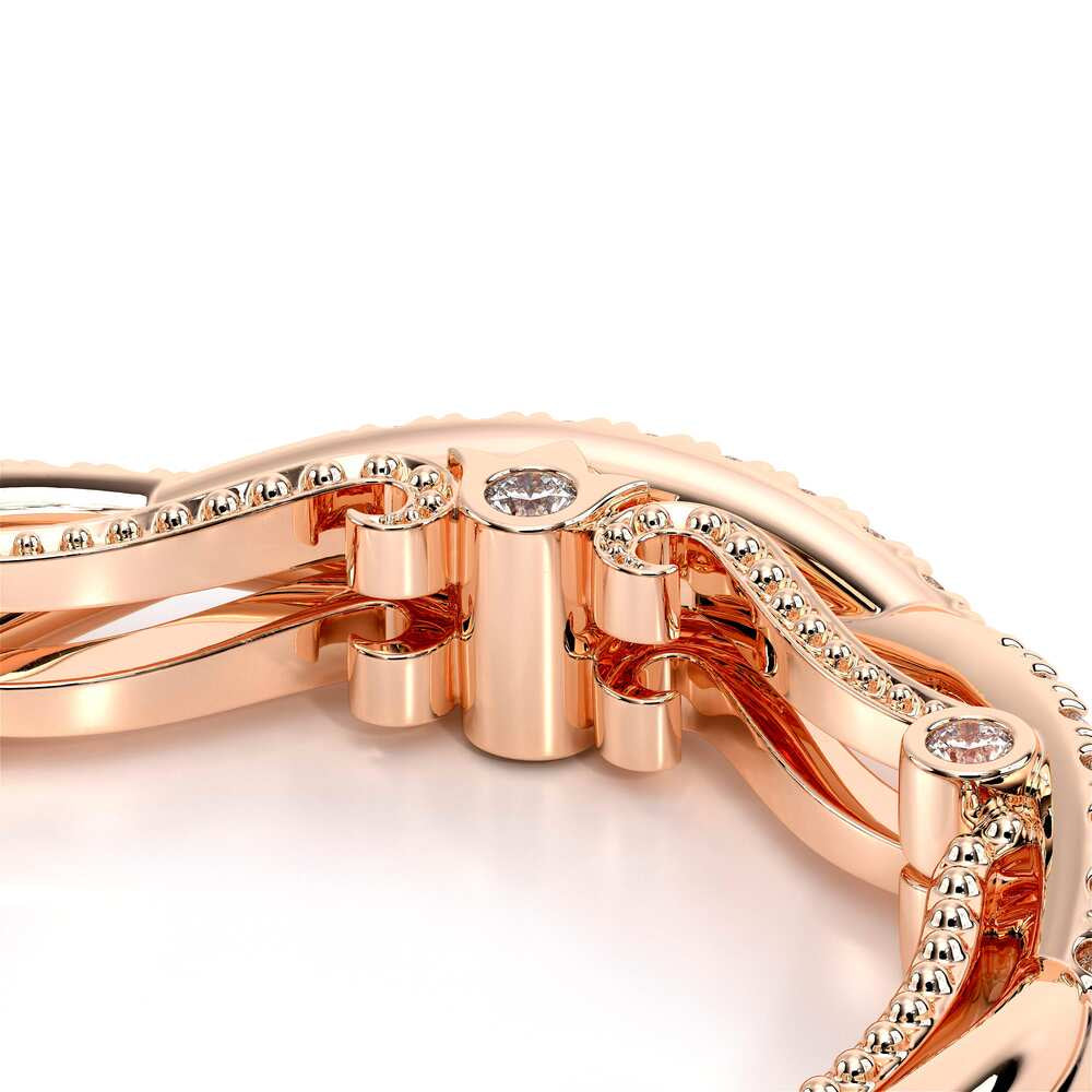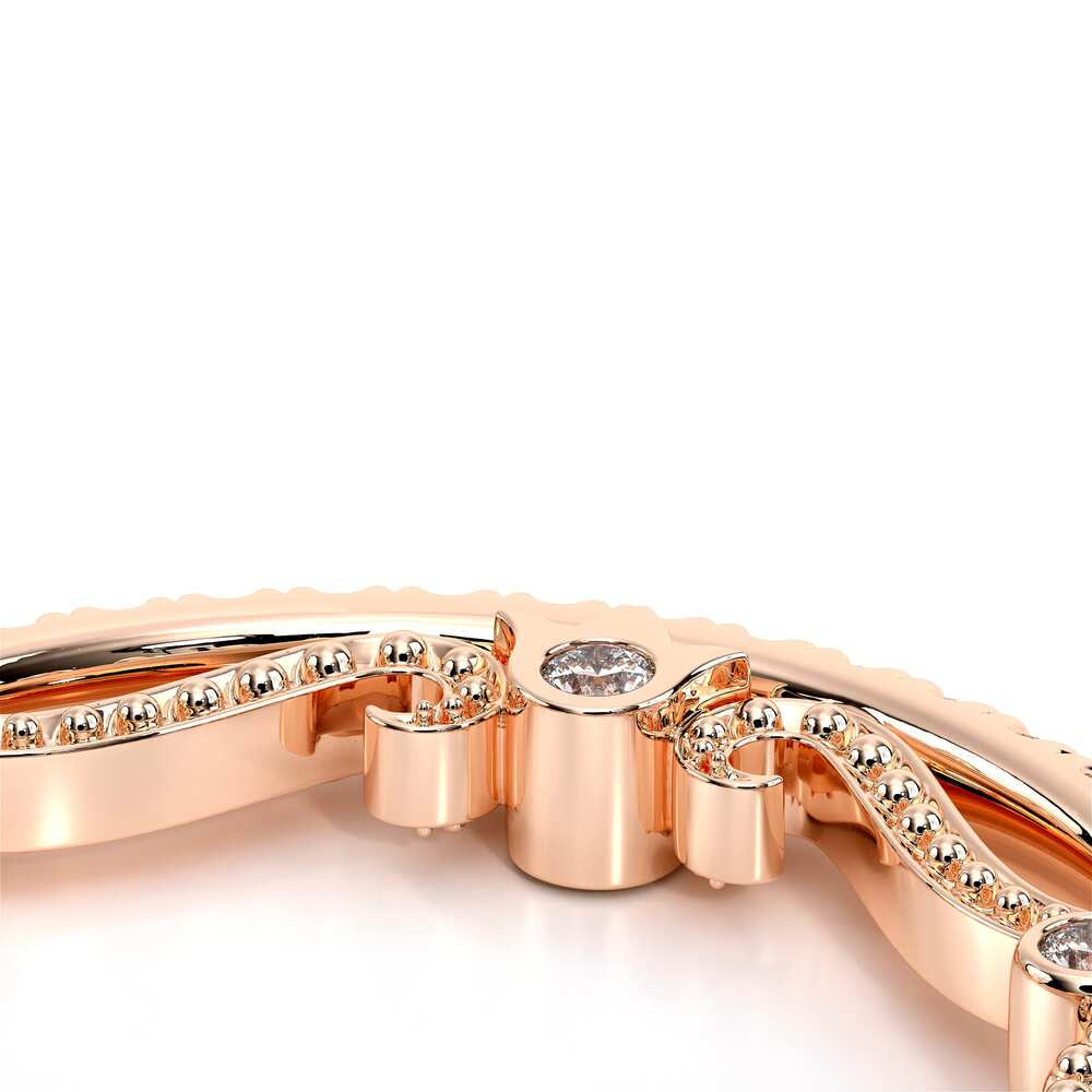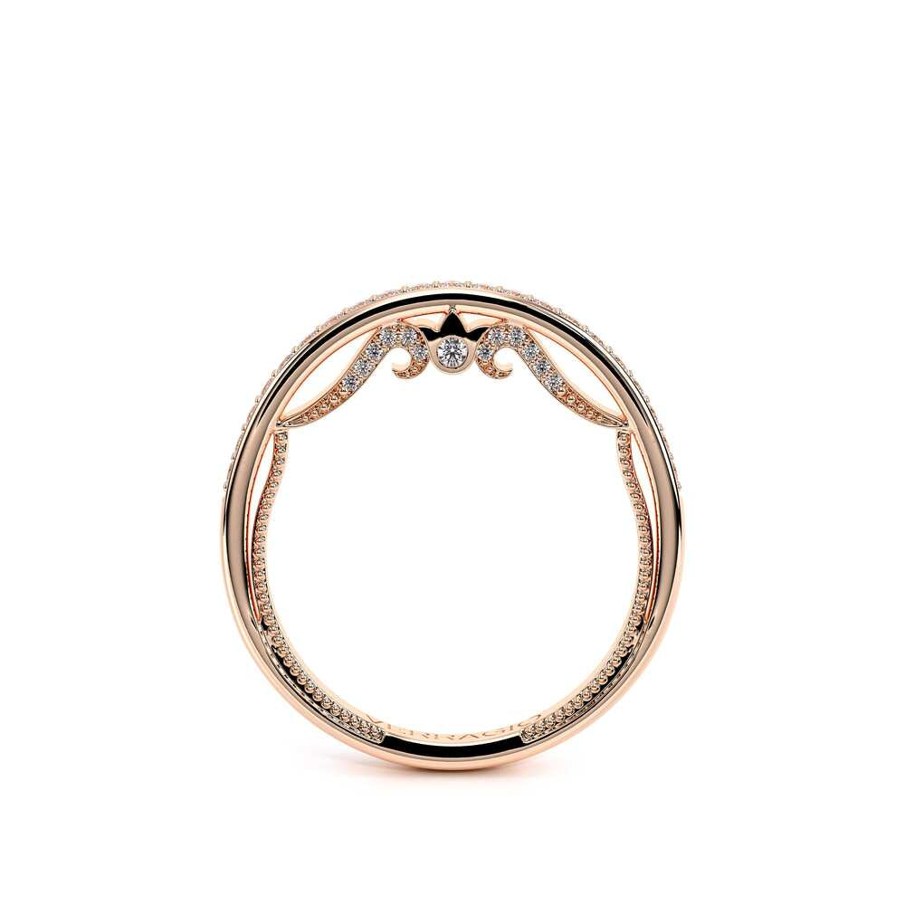 INSIGNIA-7084W-TT wedding ring from the Insignia Collection, featuring round brilliant-cut diamonds pave set on a twisted band. Unique with bezel set diamonds and distinguishing Rose Gold Insignia Scrollwork accompanied by Verragio's signature beading.