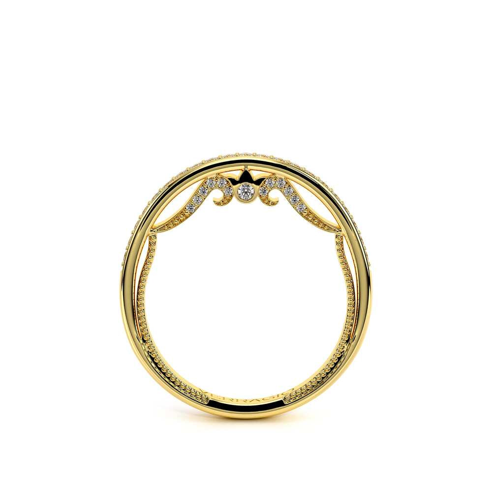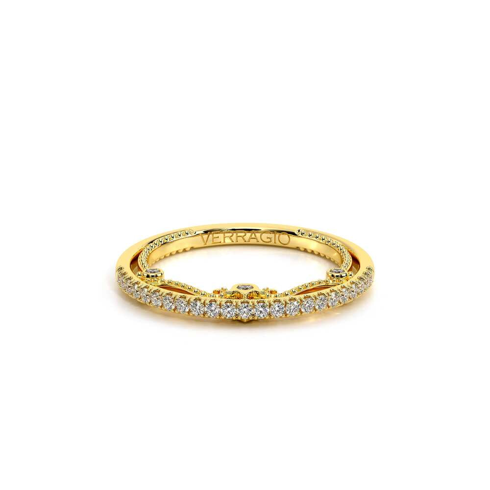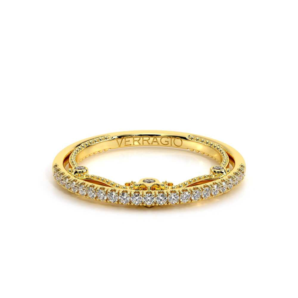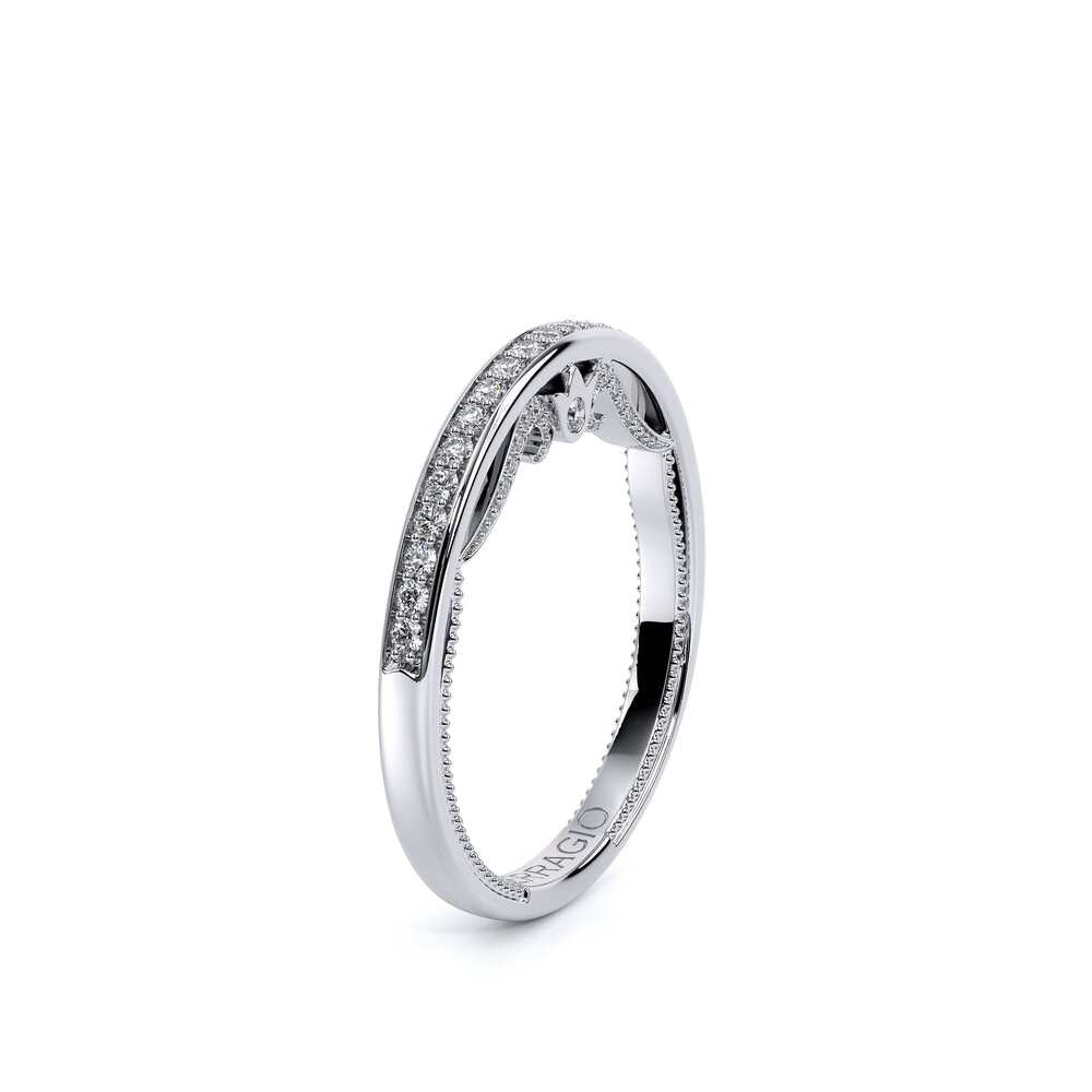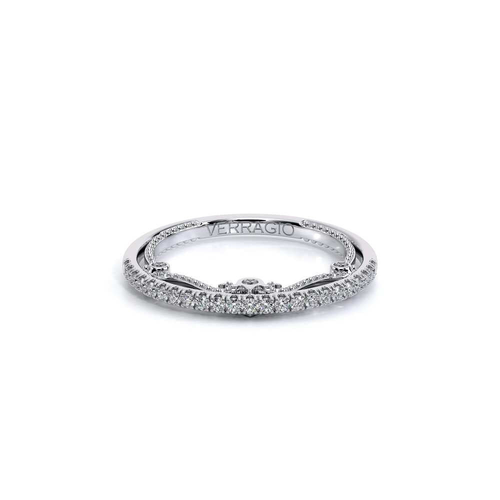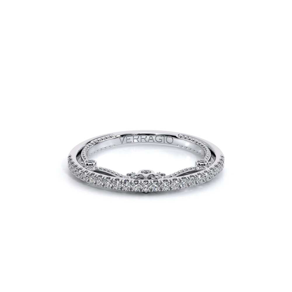 INSIGNIA-7092W diamond wedding ring from the Insignia Collection. Featuring round brilliant-cut diamonds channel set on a straight band. Distinctive diamond Insignia Scrollwork accompanied by Verragio's signature crest and beading.