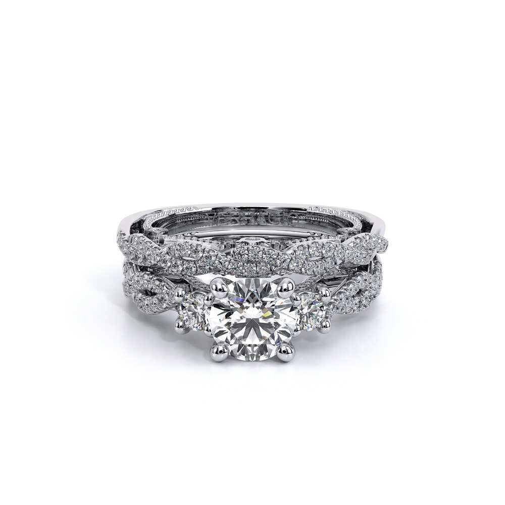 INSIGNIA-7074R Three stone diamond engagement ring adorned with Verragio's signature beading, pave set brilliant-cut diamonds on Insignia's handcrafted scrollwork and twisted band. Refined to enhance a Round diamond center.