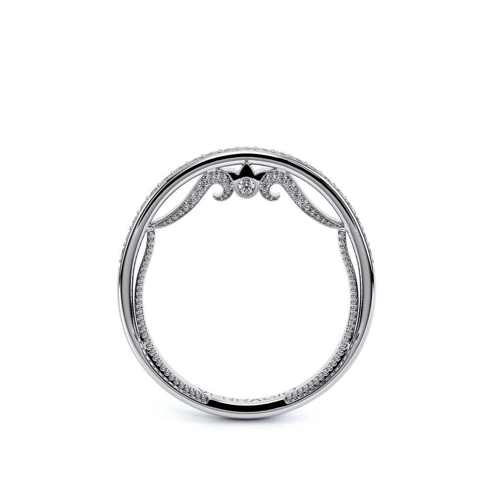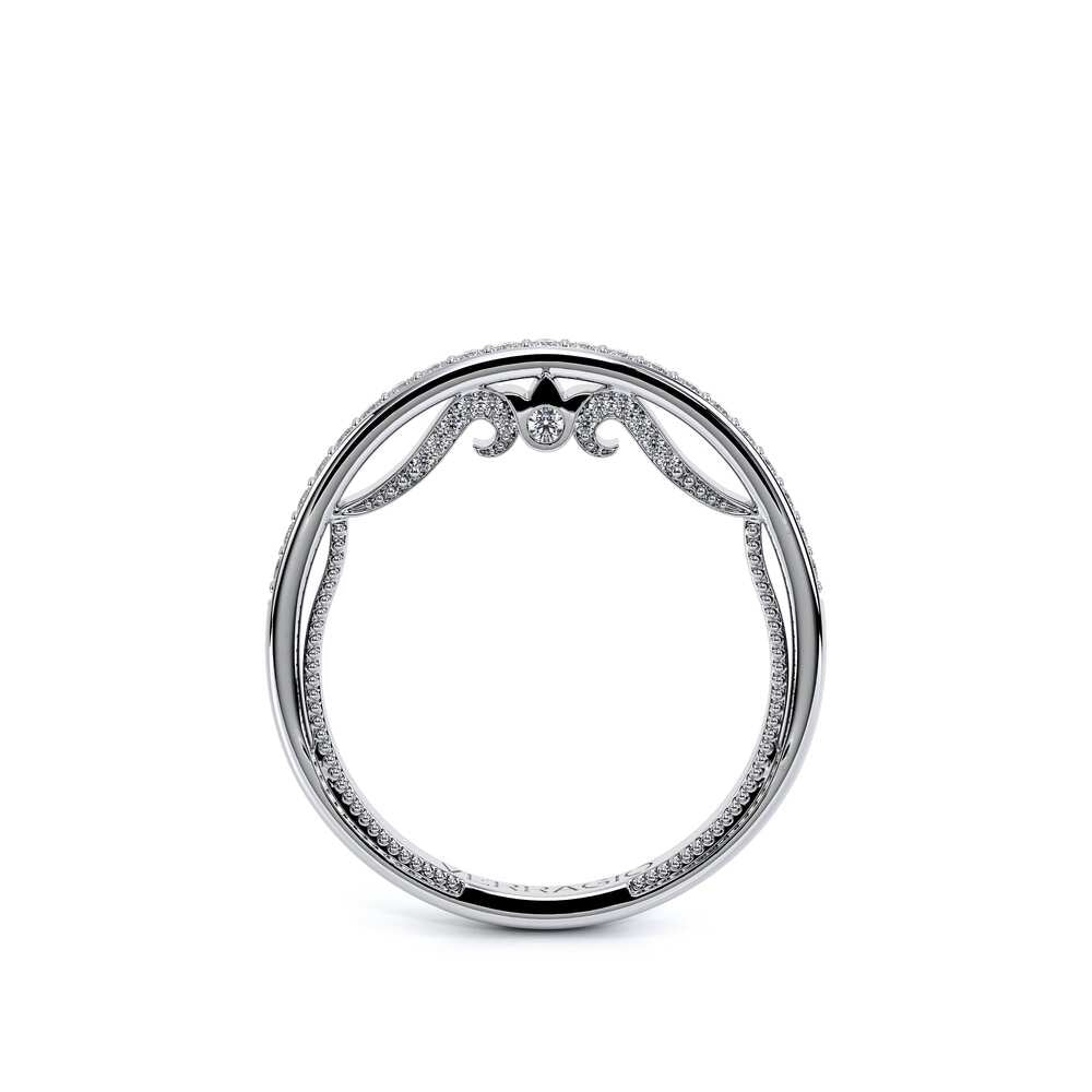 INSIGNIA-7091WSB diamond wedding ring from the Insignia Collection, featuring round brilliant-cut diamonds pave set on a straight band. Unique with bezel set diamonds with distinguishing Insignia Scrollwork accompanied by Verragio's signature crest and beading.
