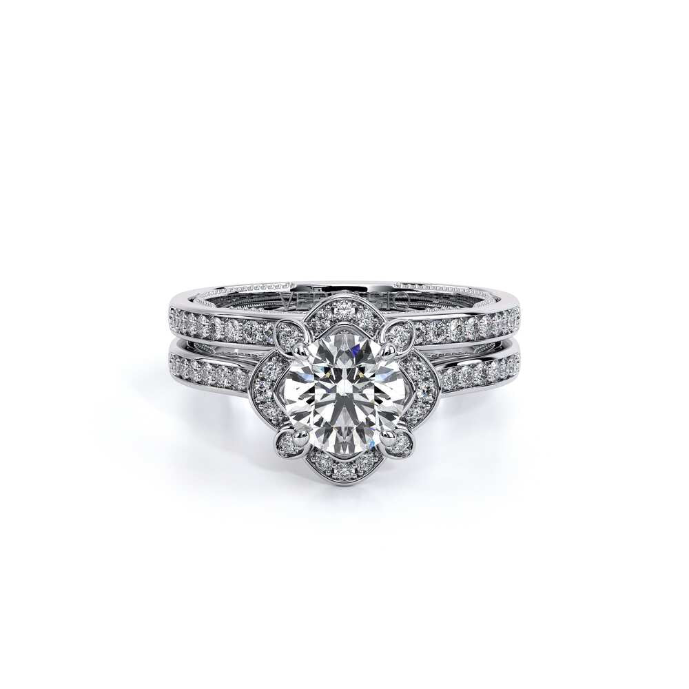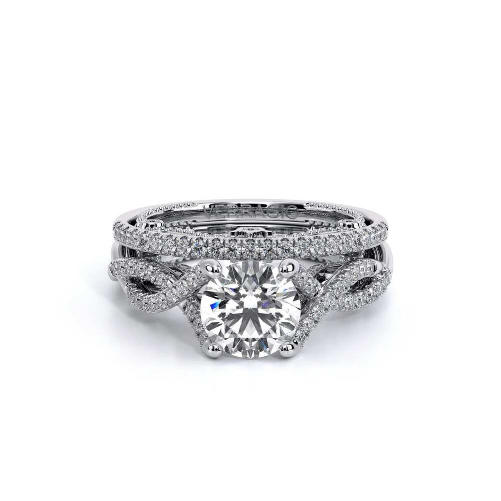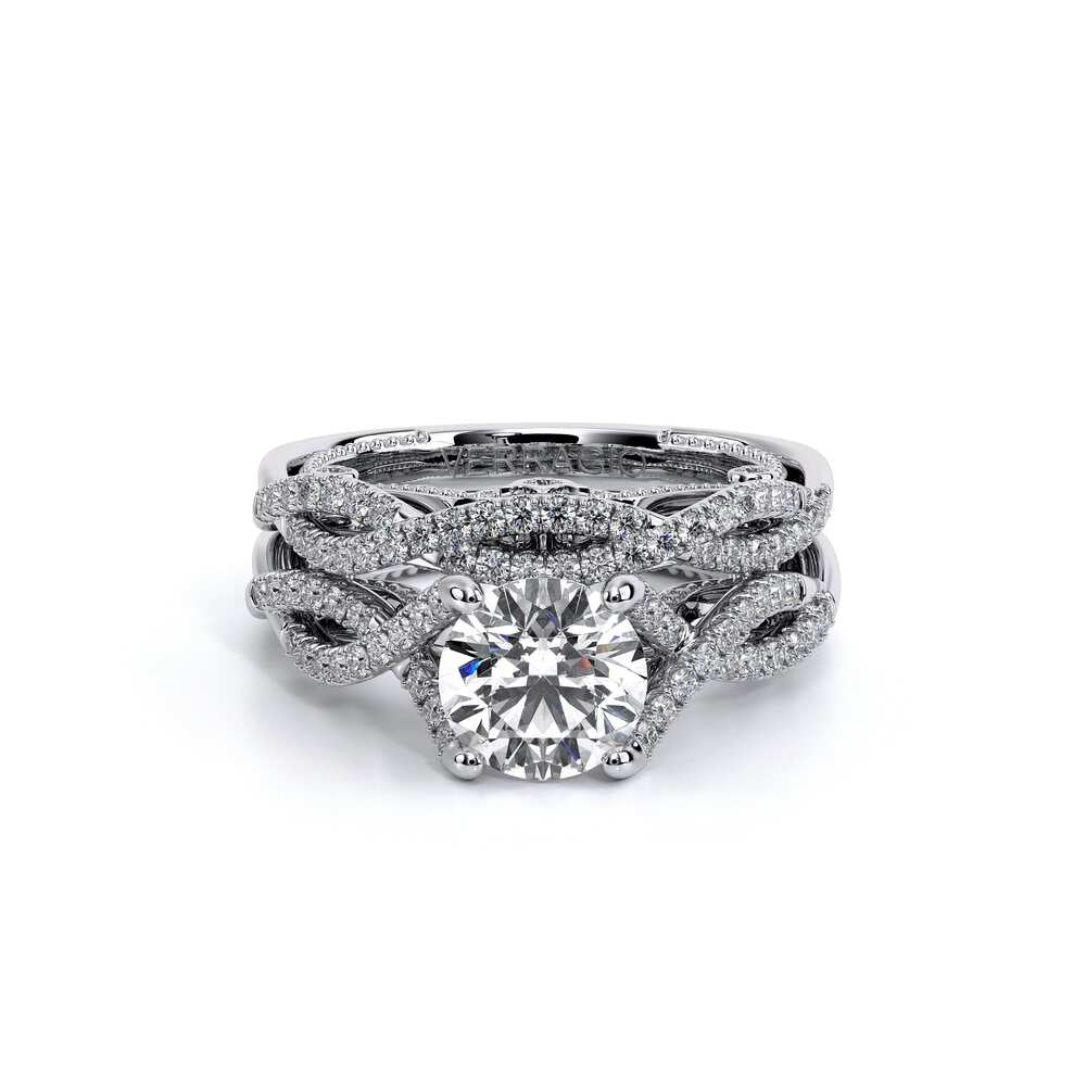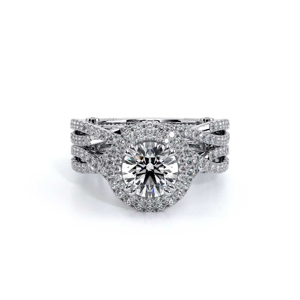 INSIGNIA-7087R Featuring, Verragio's uniquely designed handcrafted floret halo that is adorned with meticulously set round pave brilliant-cut diamonds on a twisted band. Encompassed by Insignia's handcrafted diamond scrollwork and Verragio's signature beading to enhance a Round diamond center.