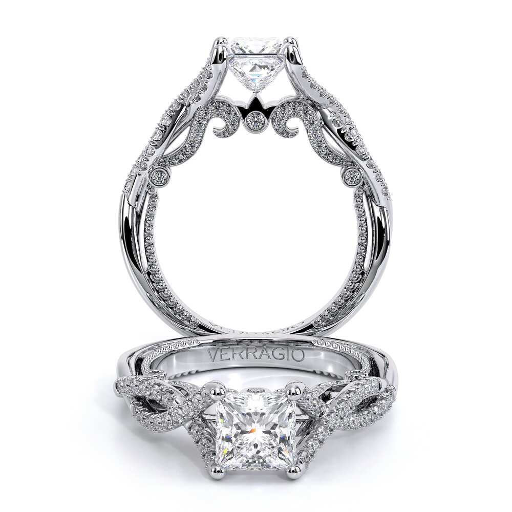 INSIGNIA-7060 Princess engagement ring, featuring round brilliant-cut pave set diamonds on a twisted band. Distinctively paired with Verragio's handcrafted signature beading and crest.