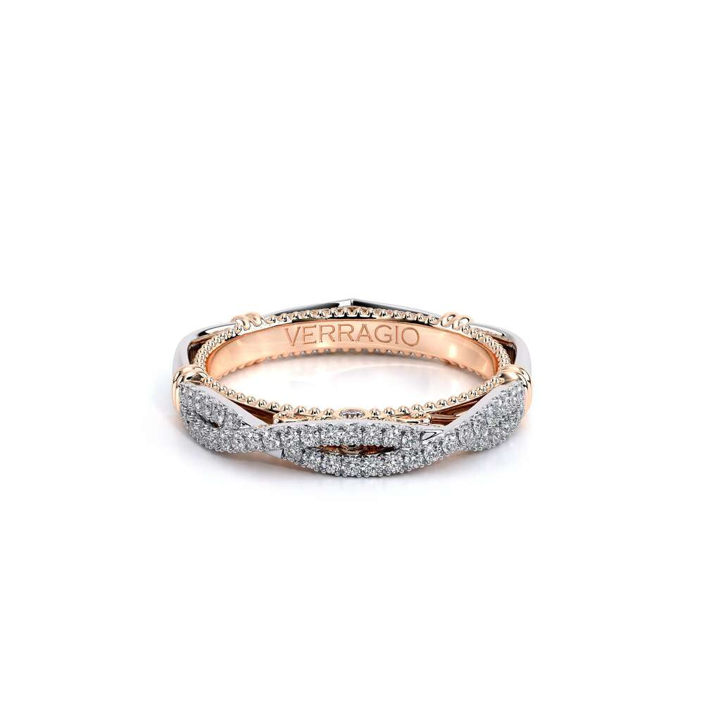 Parisian-153W wedding band is a beautifully handcrafted twisted style band that features the Parisian lace detail, our Verragio Signature beading and rose gold Timeless wraps that is meant to compliment your Parisian engagement ring. **Note: +$400 for Lace, Beading or Both in a different color