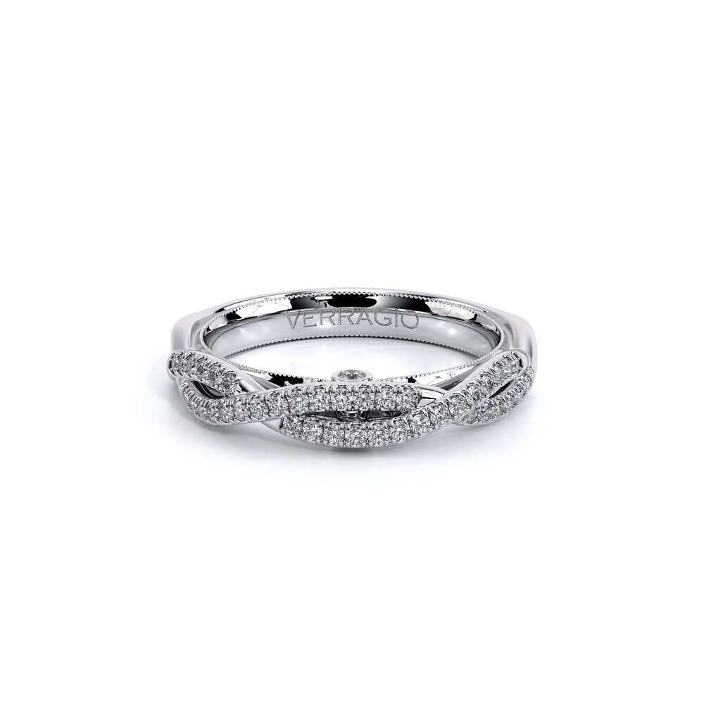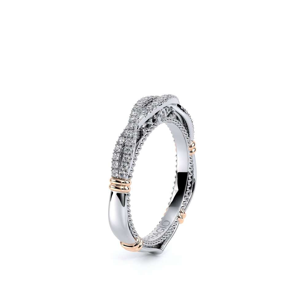 Parisian-129W is a beautifully handcrafted twisted style wedding band that features the Parisian lace detail, our Verragio Signature beading and rose gold Timeless wraps to create the perfect Parisian matching wedding set. **Note: +$400 for Lace, Beading or Both in a different color