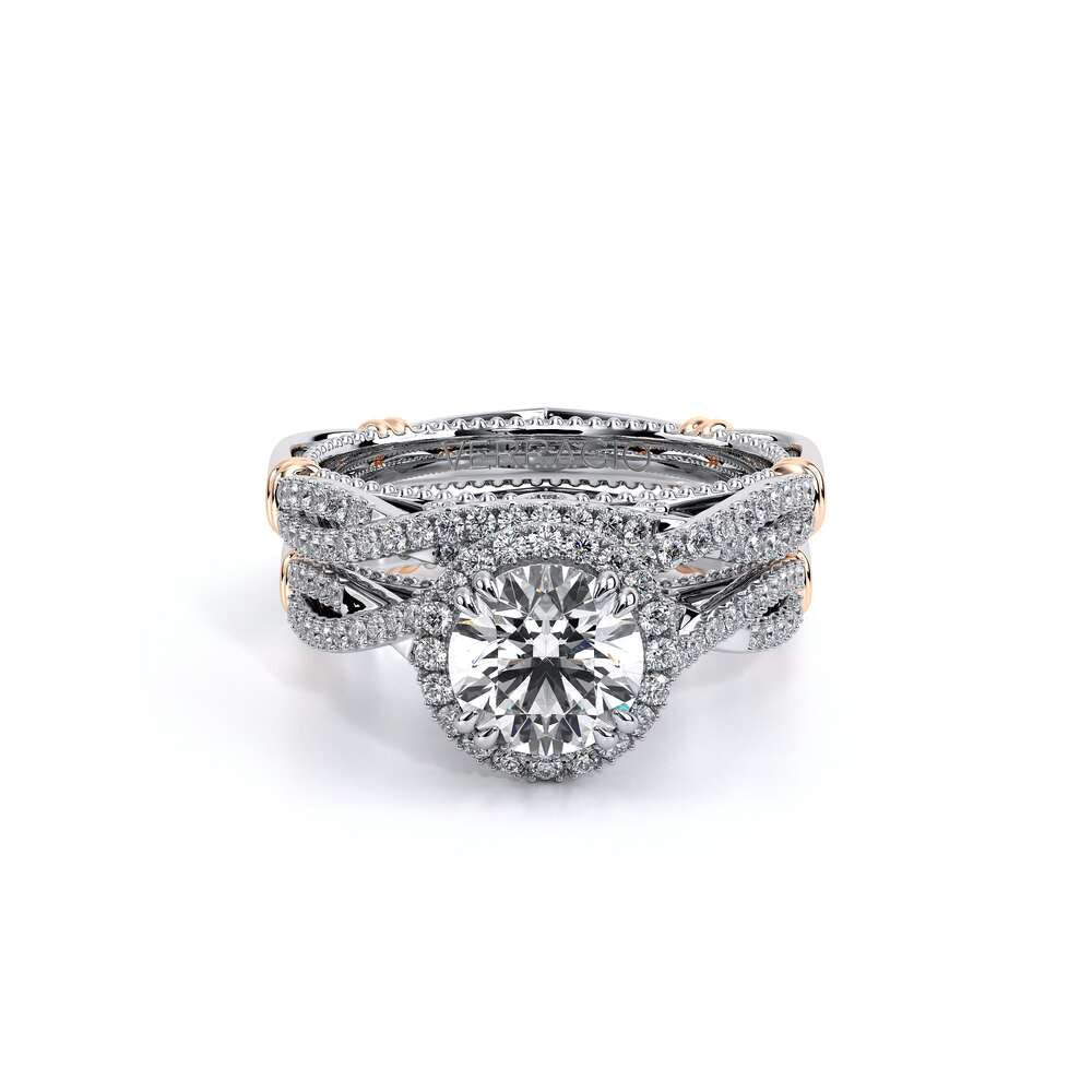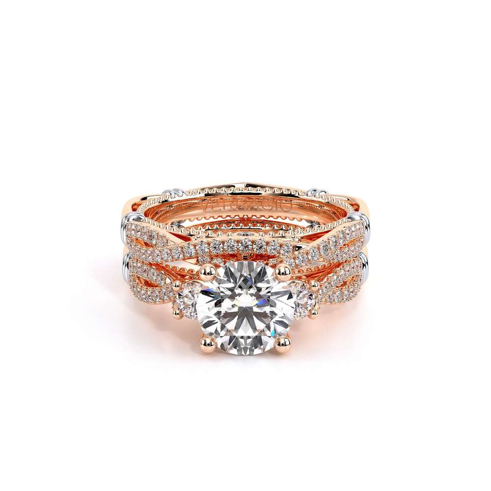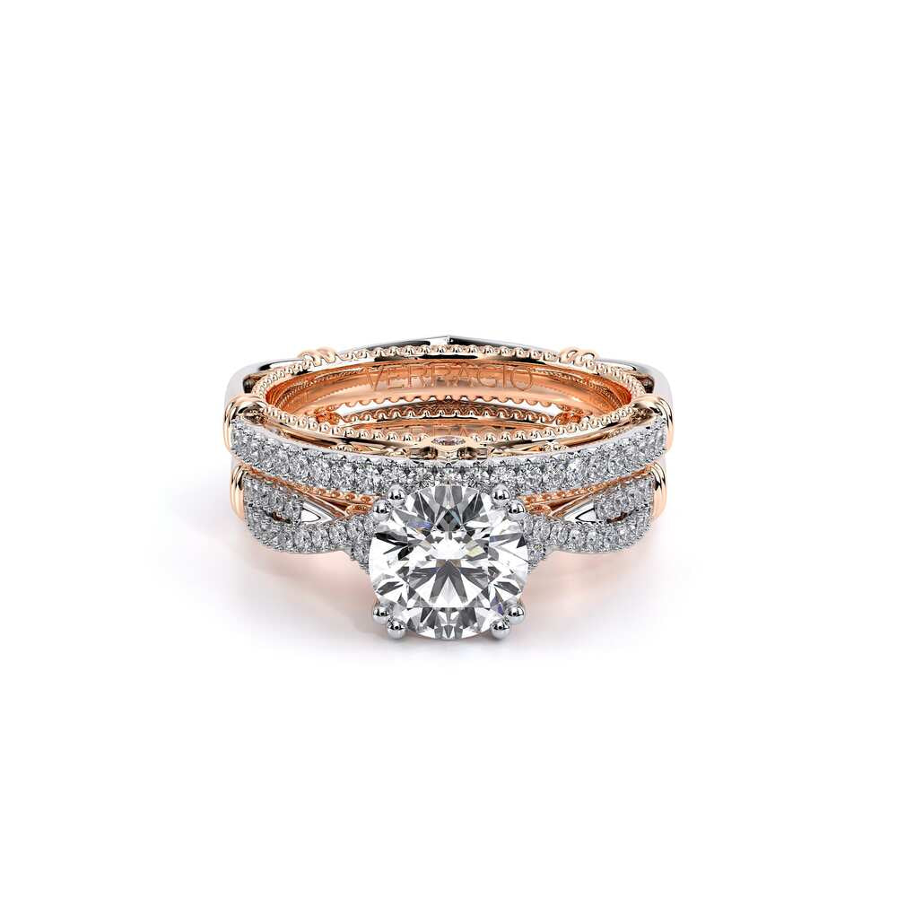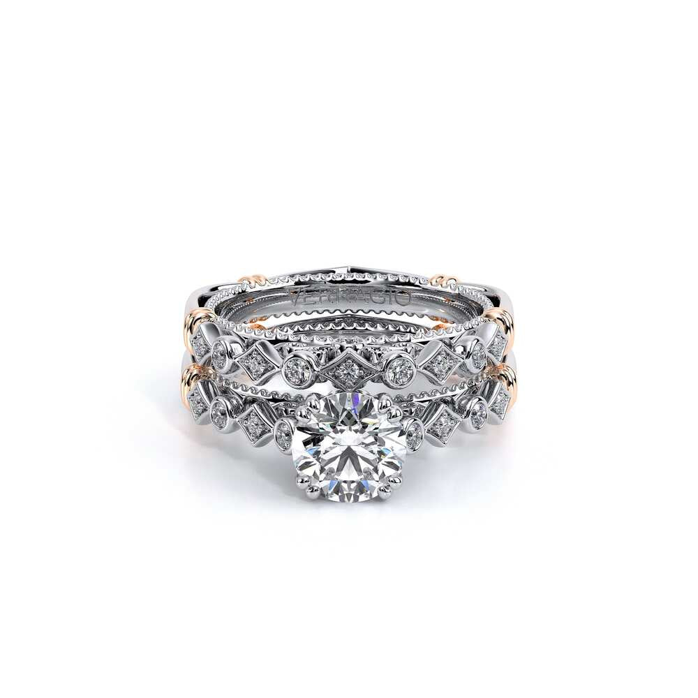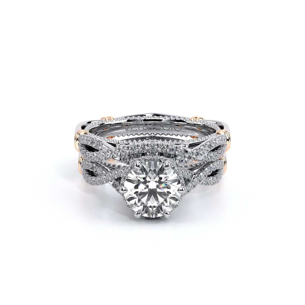 Parisian-106W wedding band is a beautifully handcrafted twisted style band that features the Parisian lace detail, our Verragio Signature beading and rose gold Timeless wraps to create the perfect wedding set. **Note: +$400 for Lace, Beading or Both in a different color
