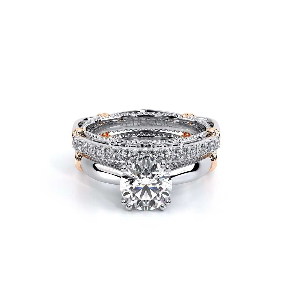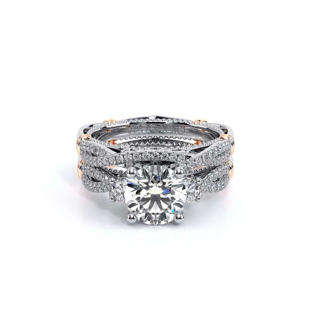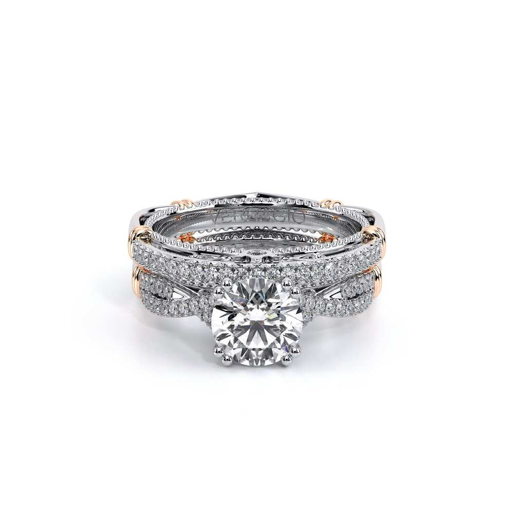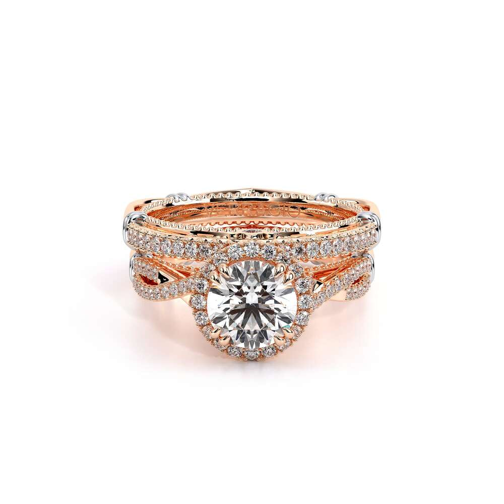 Parisian-106W wedding band is a beautifully handcrafted twisted style band that features the Parisian lace detail, our Verragio Signature beading and rose gold Timeless wraps to create the perfect wedding set. **Note: +$400 for Lace, Beading or Both in a different color