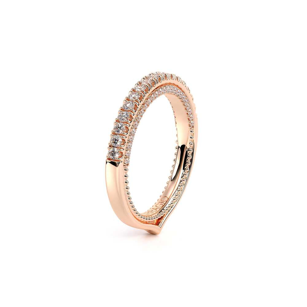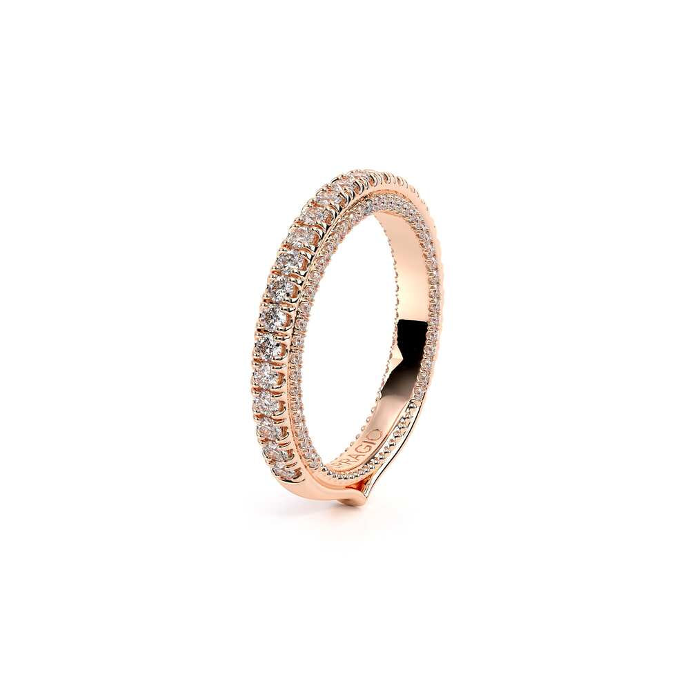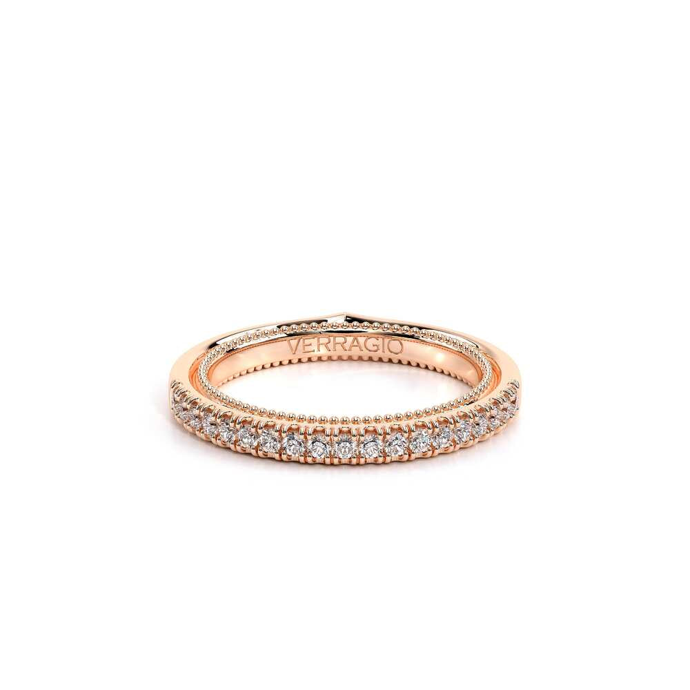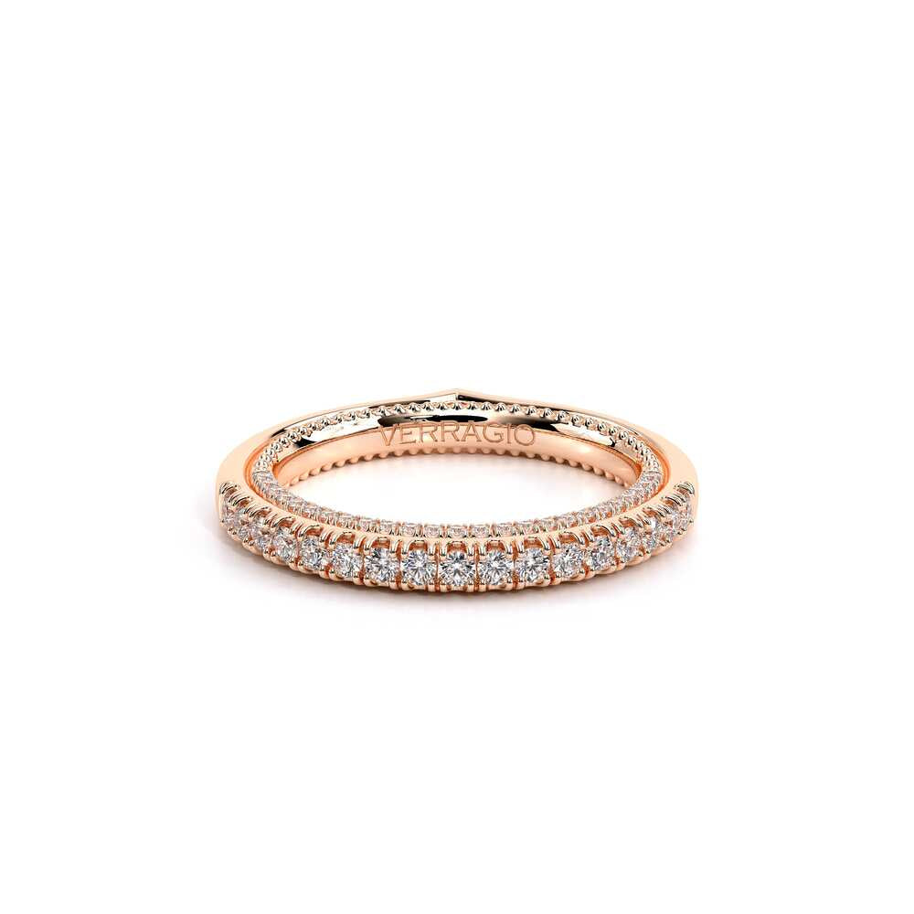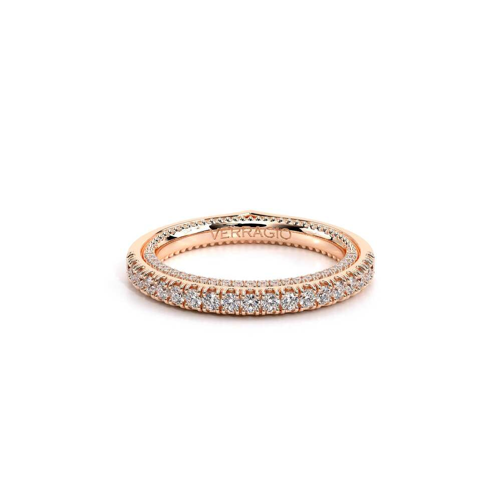 COUTURE-0429W Dazzling Wedding band pave with round brilliant diamonds, featuring the Verragio Bezel Set and upward Scrollwork Signature Beading profile, completed with the Couture pointed shank.