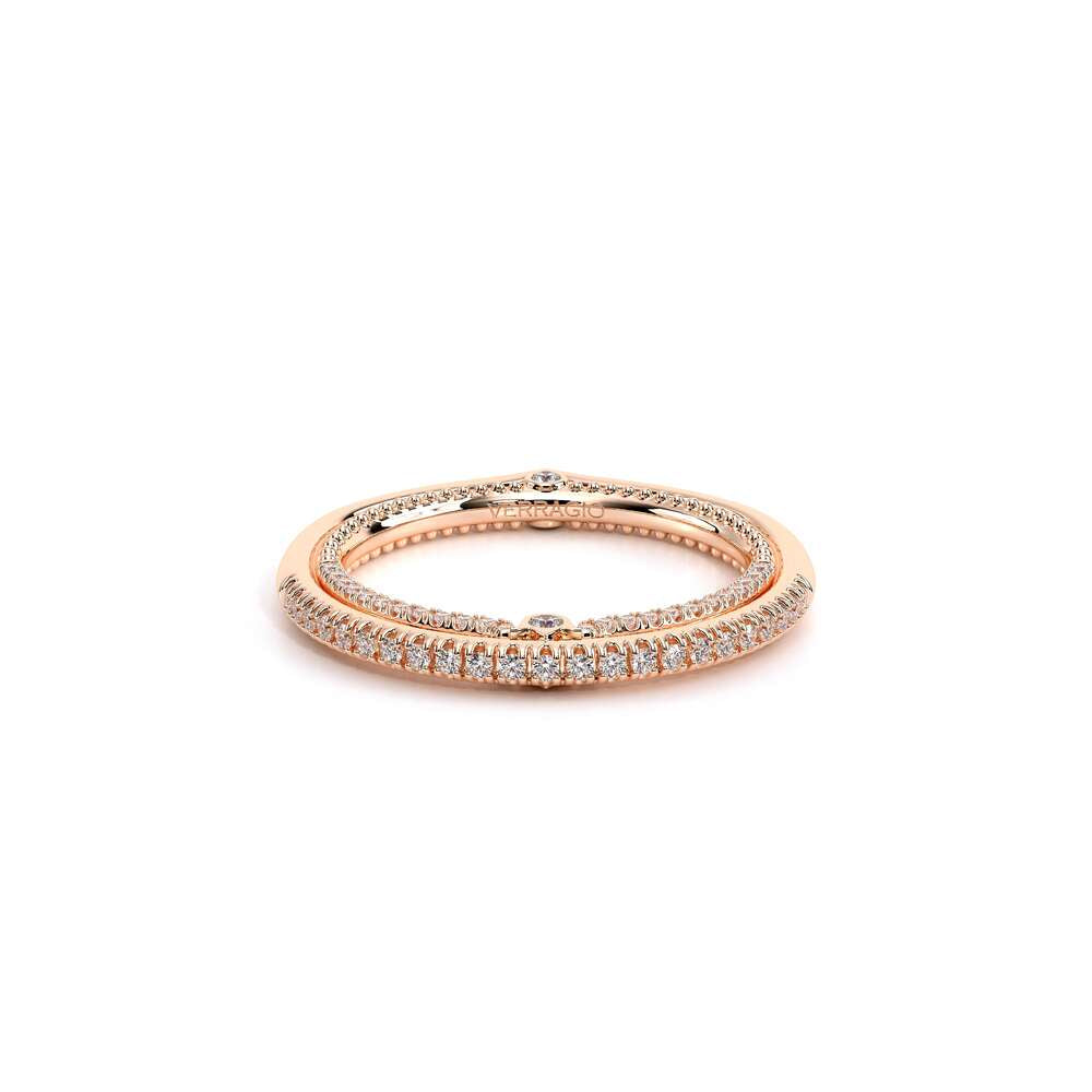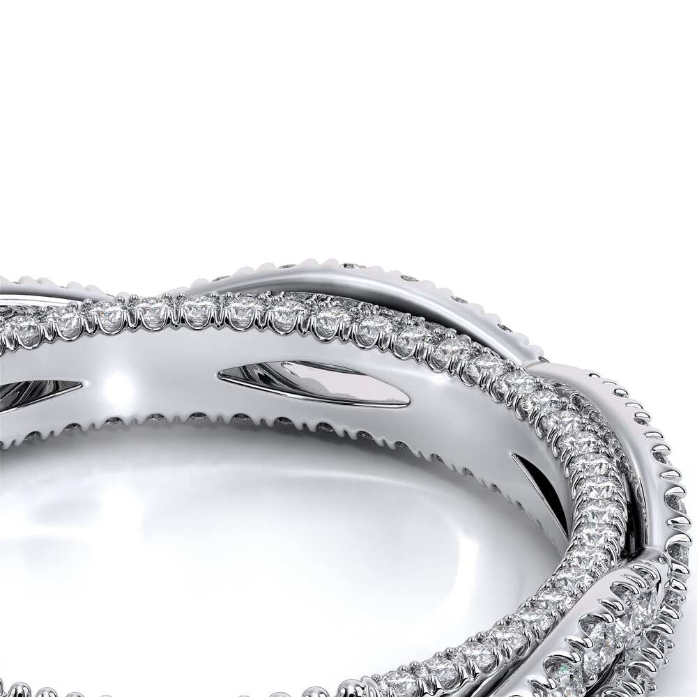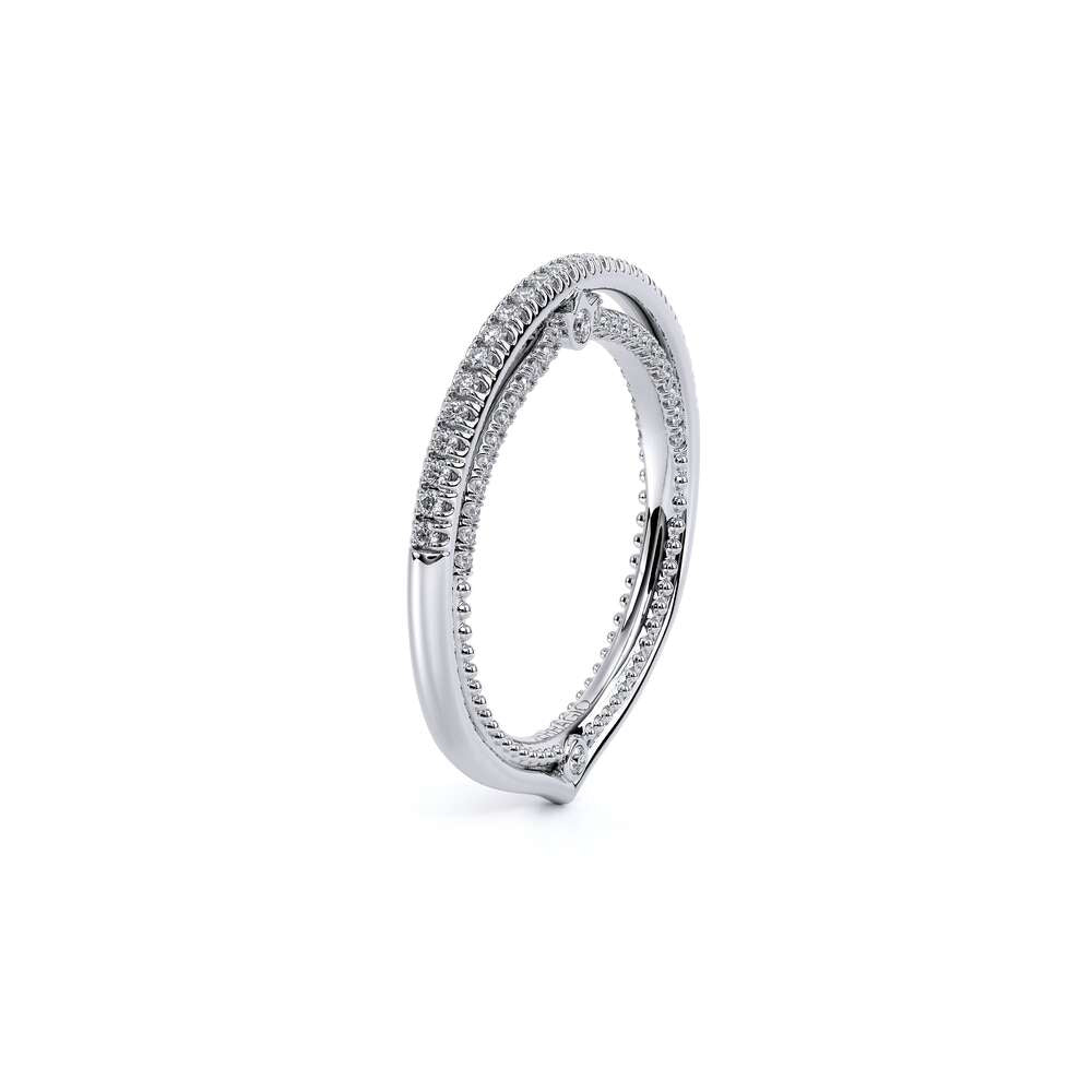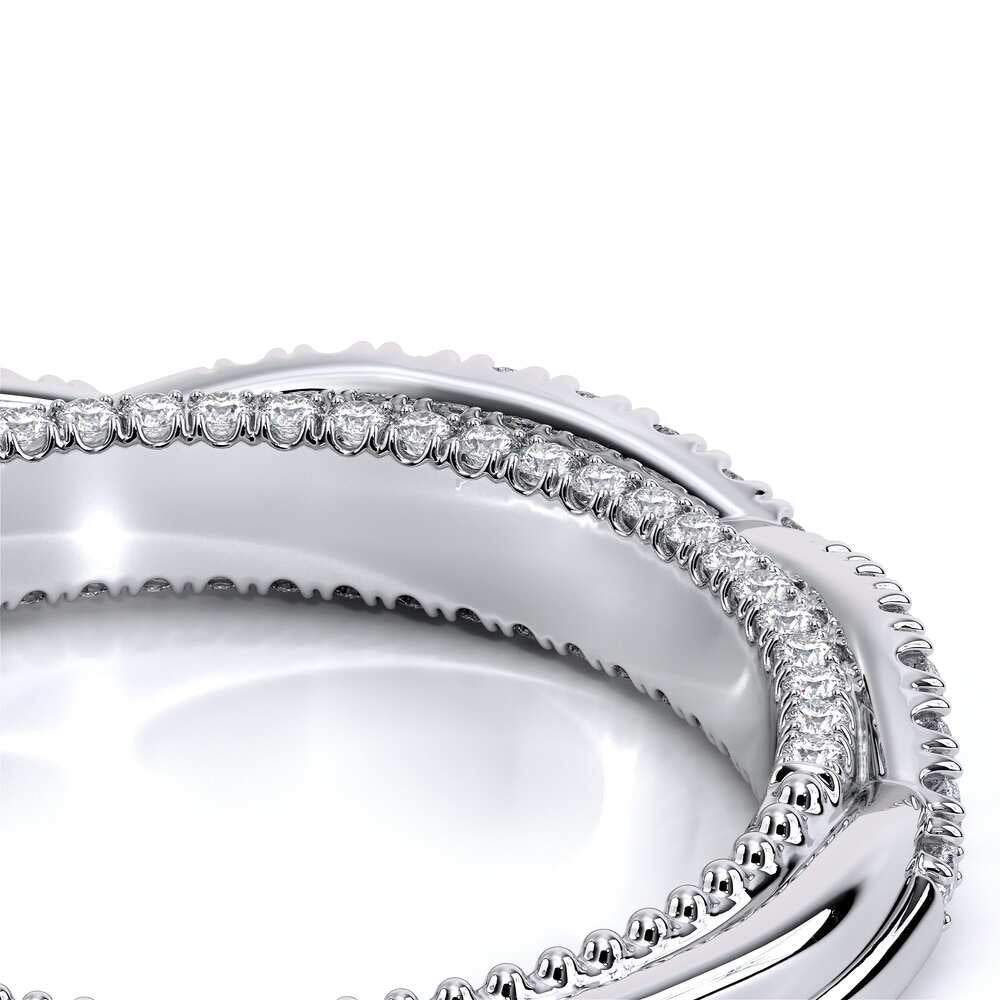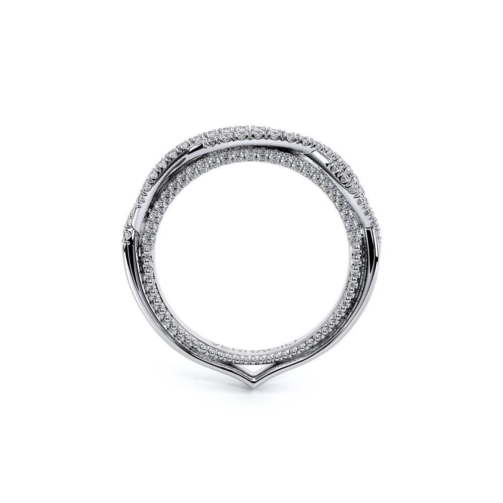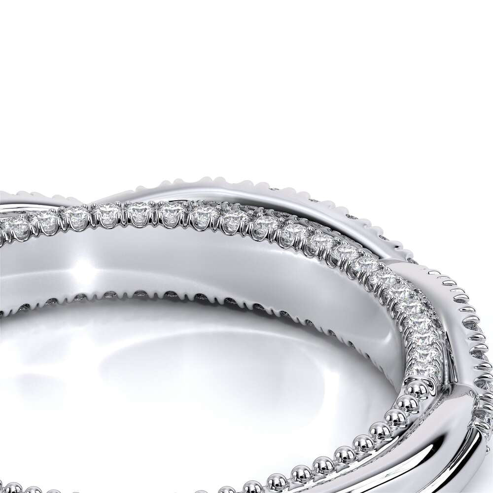 COUTURE-0421W-2T Elegant Twist Wedding band pave with round brilliant diamonds, featuring the Verragio Bezel set and upward Scrollwork Signature Beading profile, completed with the Couture pointed shank.