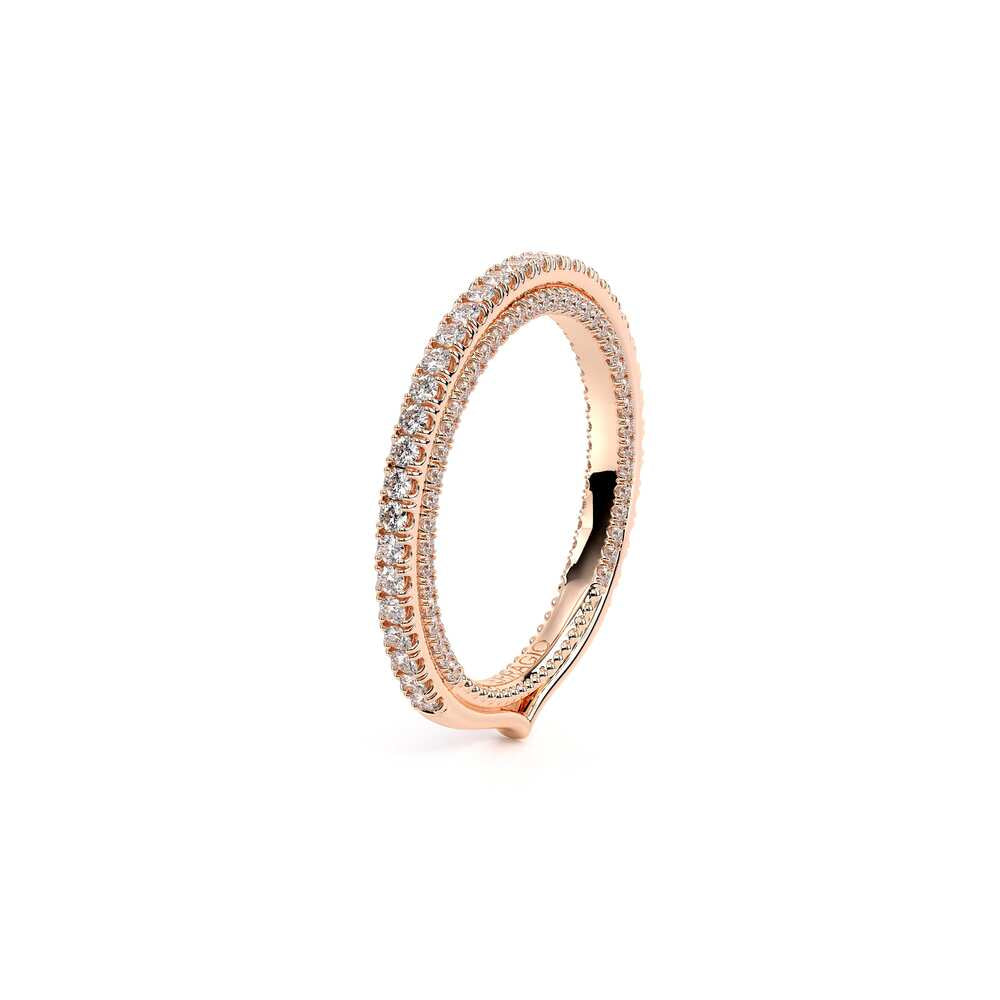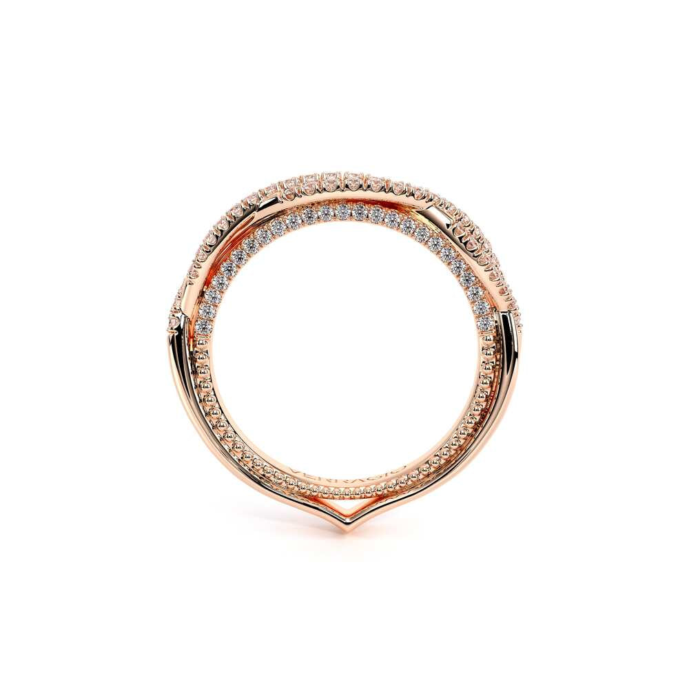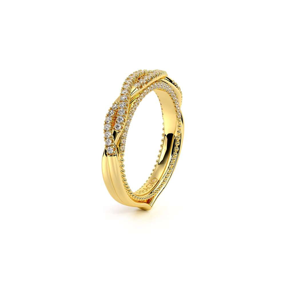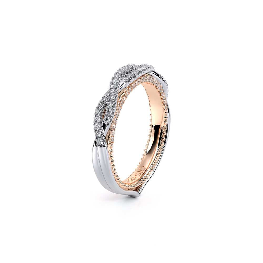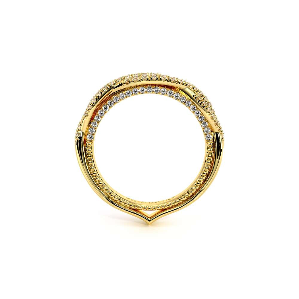 COUTURE-0421W-2T Elegant Twist Wedding band pave with round brilliant diamonds, featuring the Verragio Bezel set and upward Scrollwork Signature Beading profile, completed with the Couture pointed shank.
