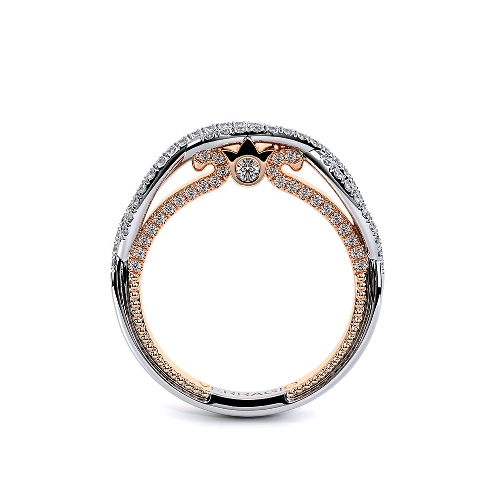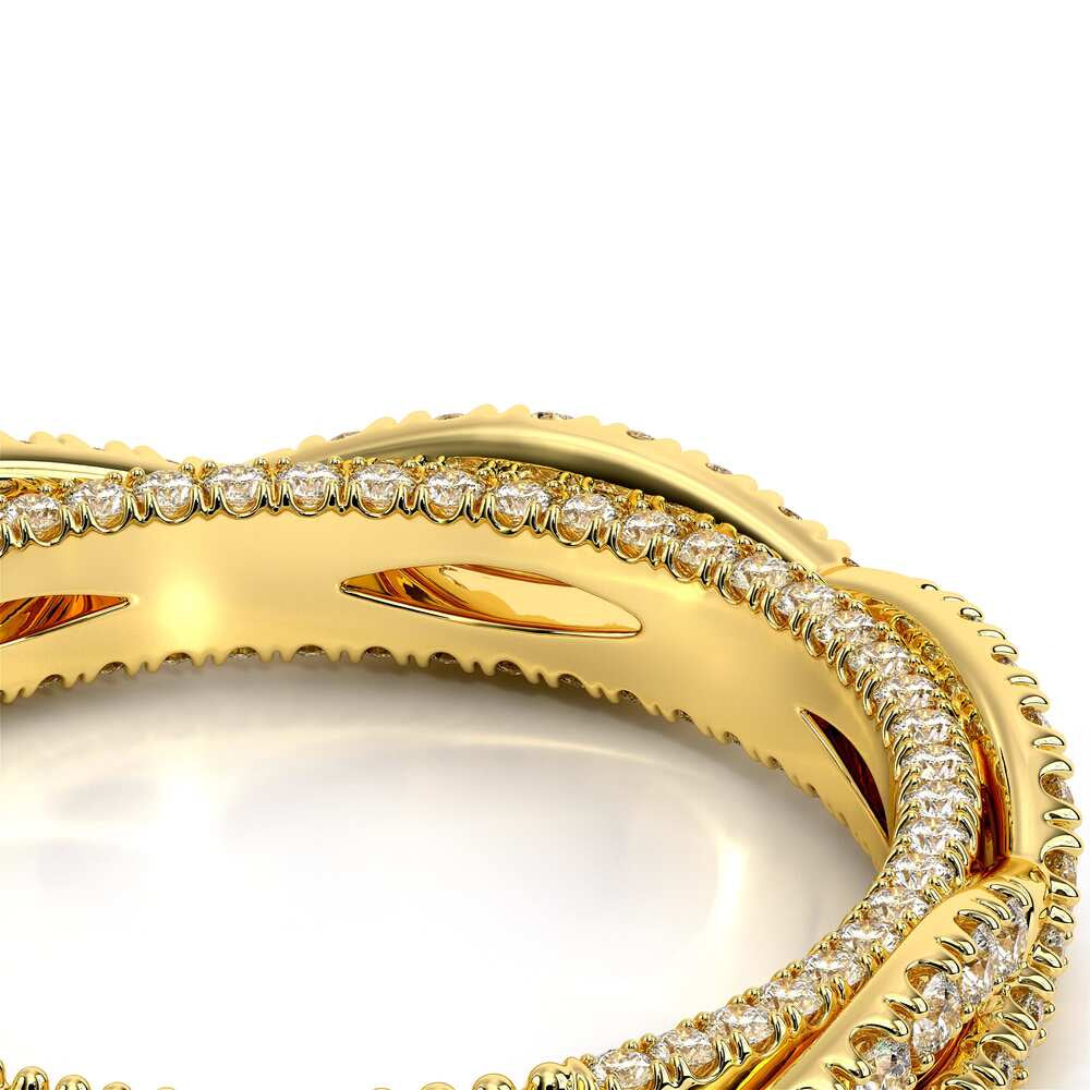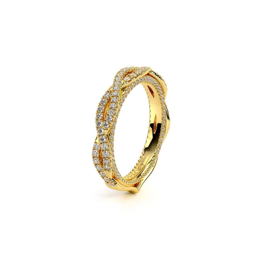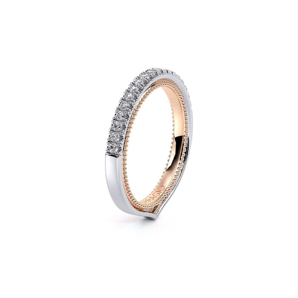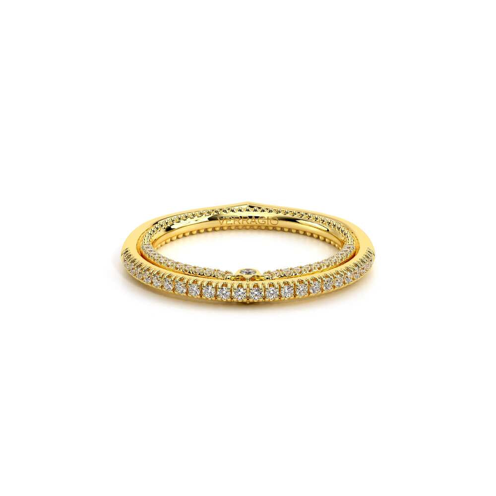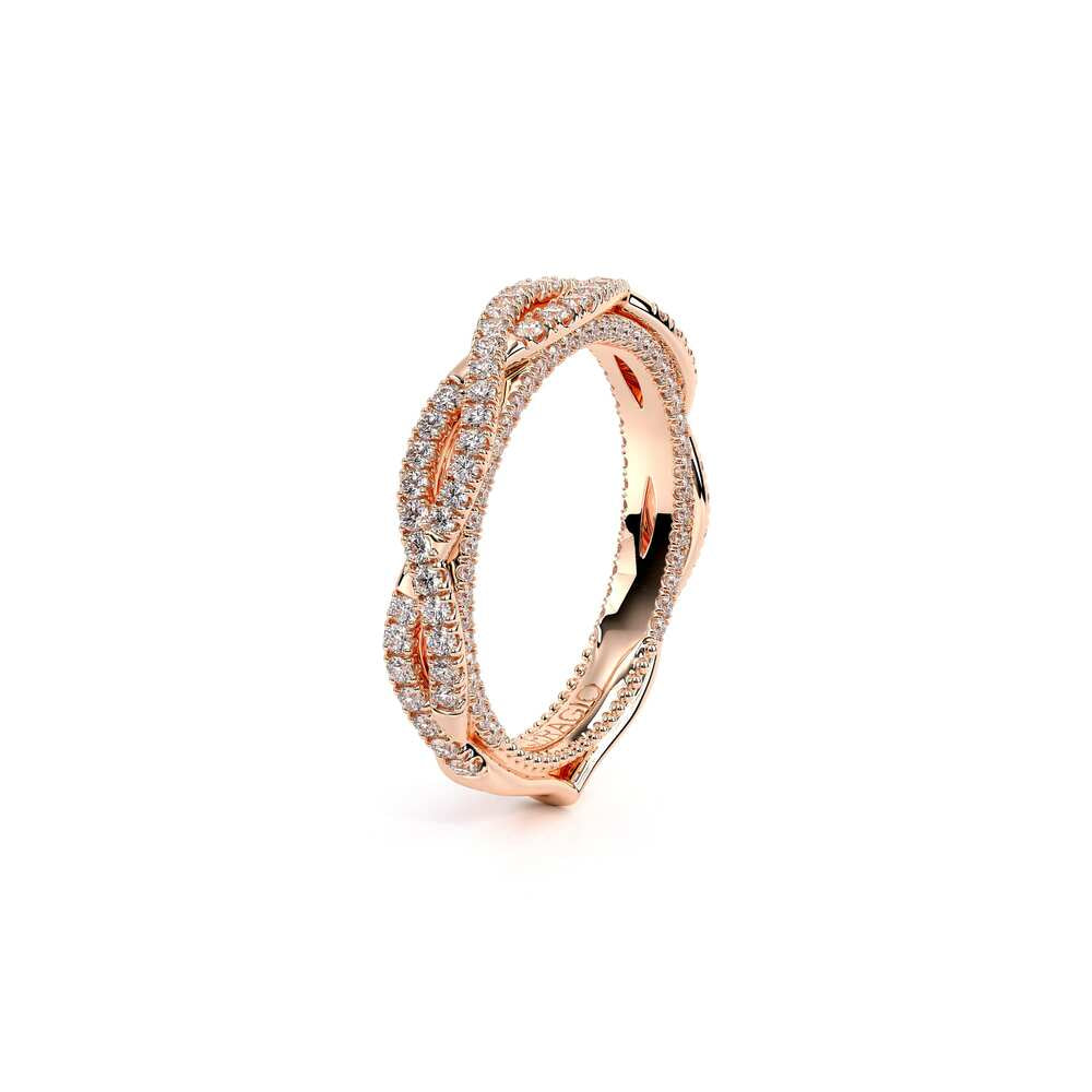 COUTURE-0421W-2T Elegant Twist Wedding band pave with round brilliant diamonds, featuring the Verragio Bezel set and upward Scrollwork Signature Beading profile, completed with the Couture pointed shank.