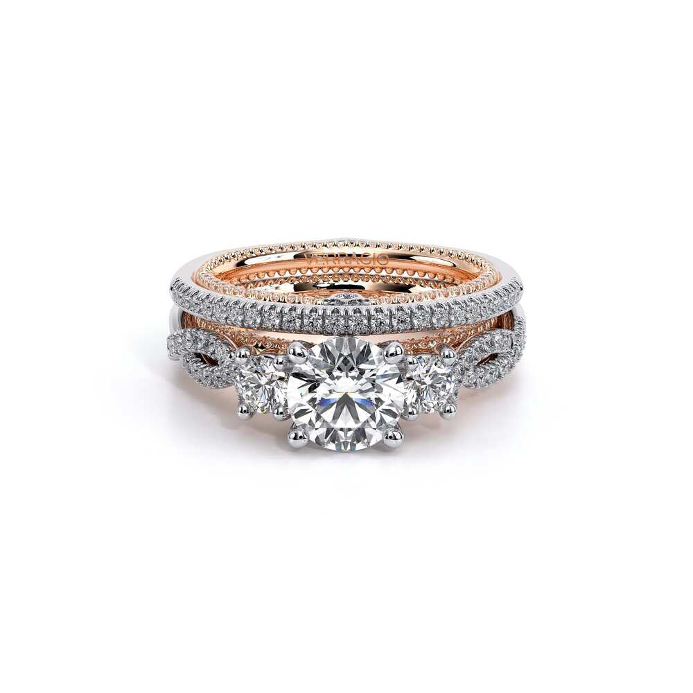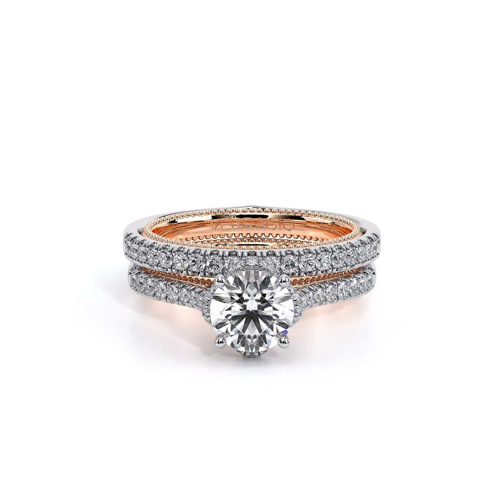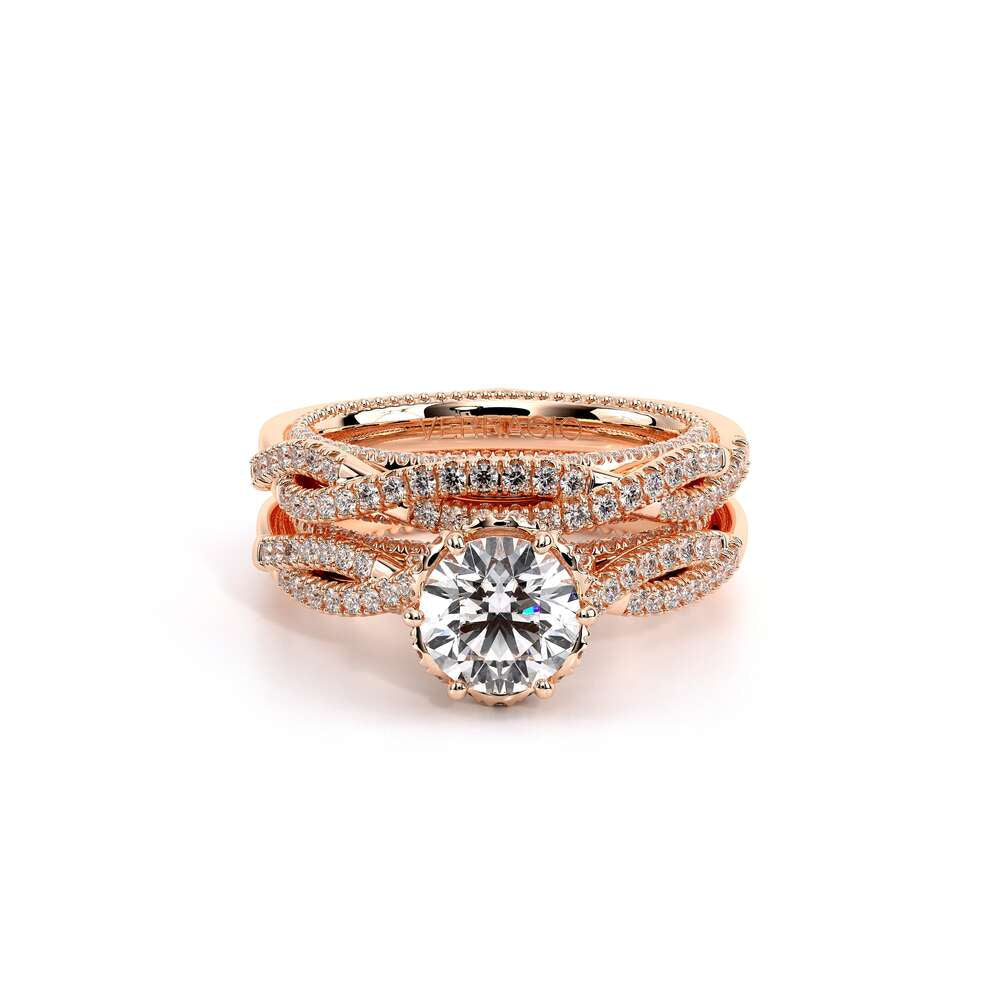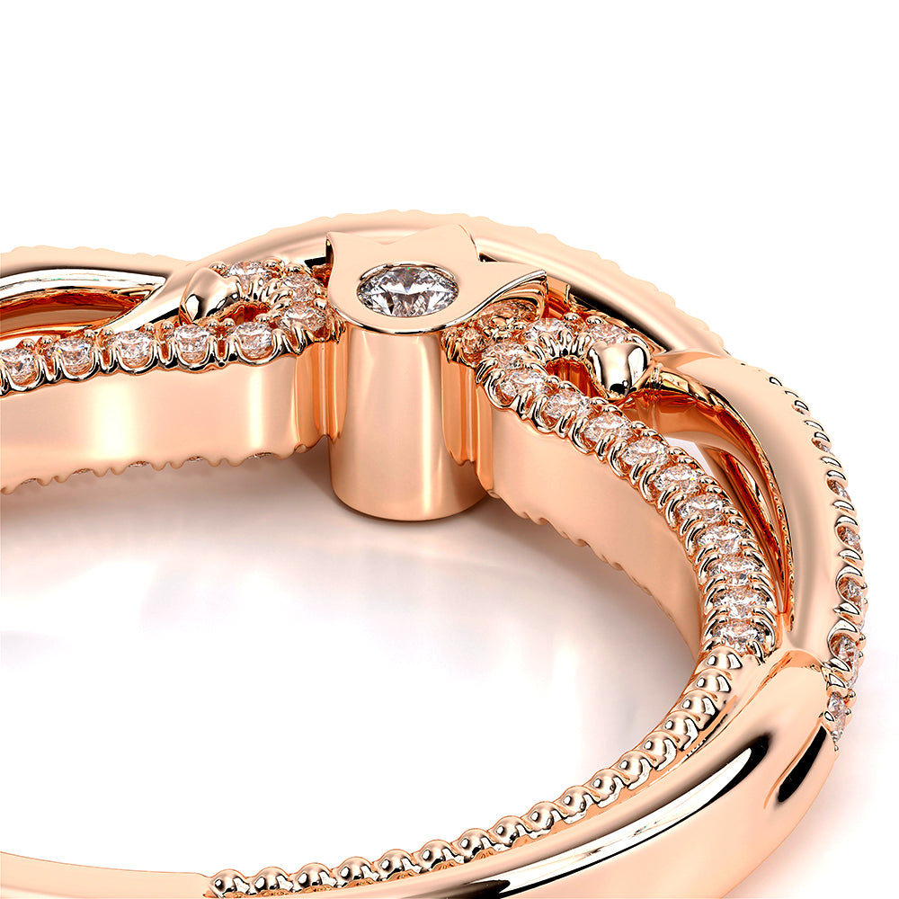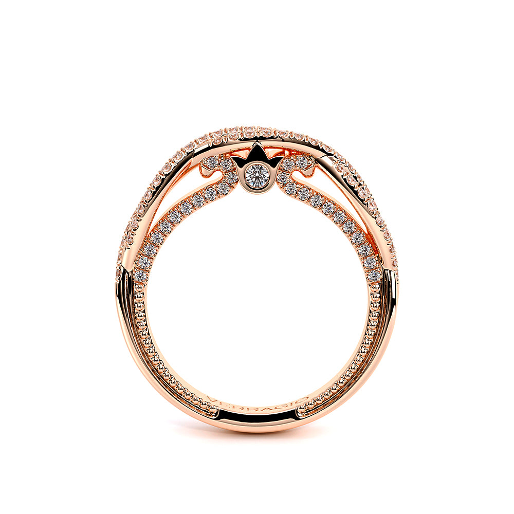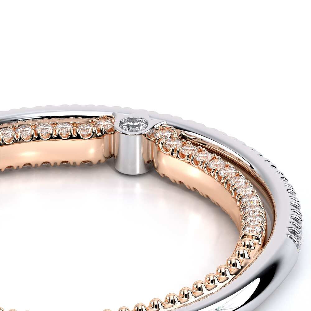 COUTURE-0421W-2T Elegant Twist Wedding band pave with round brilliant diamonds, featuring the Verragio Bezel set and upward Scrollwork Signature Beading profile, completed with the Couture pointed shank.