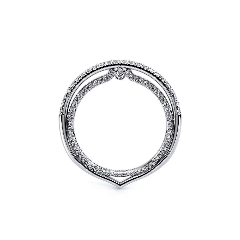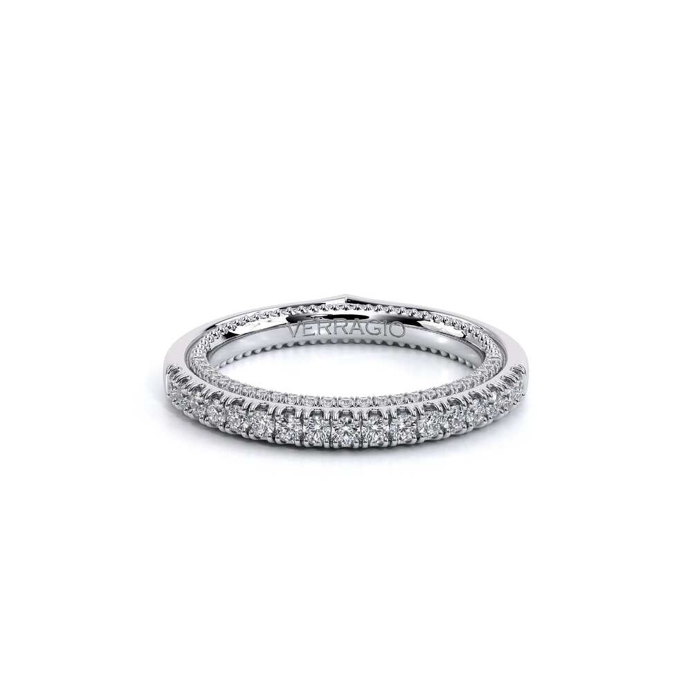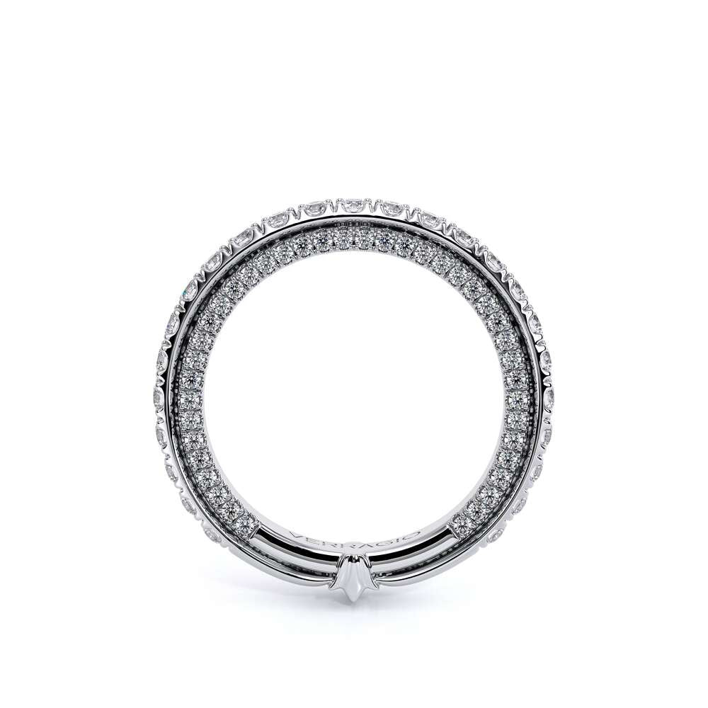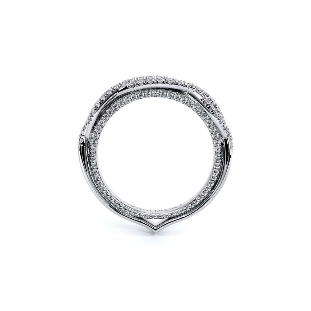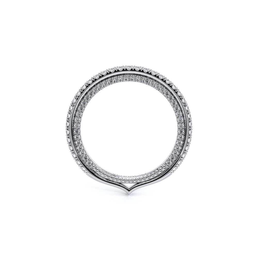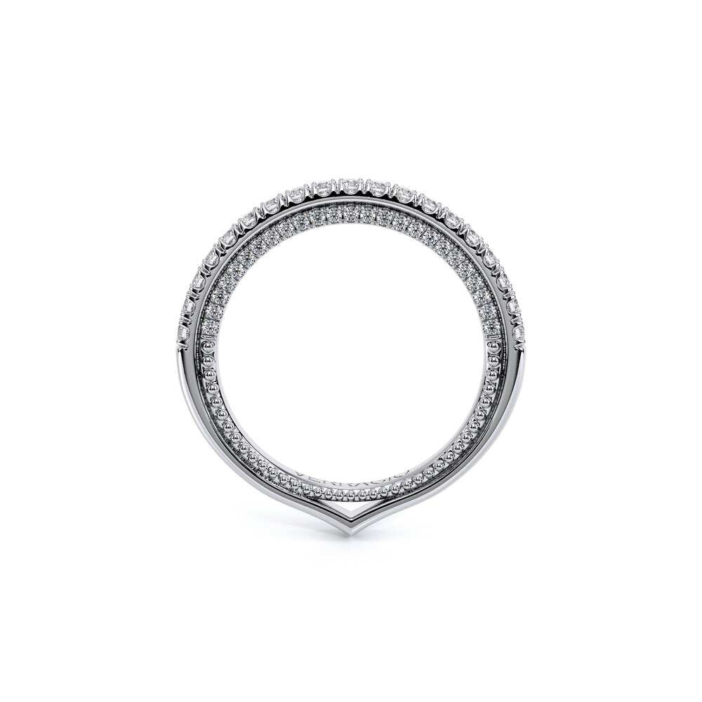 COUTURE-0420W-2T Classic Wedding band pave with round brilliant diamonds, featuring full Signature Beading profile, completed with the Couture pointed shank and Verragio Bezel immersed.