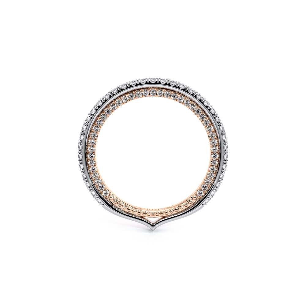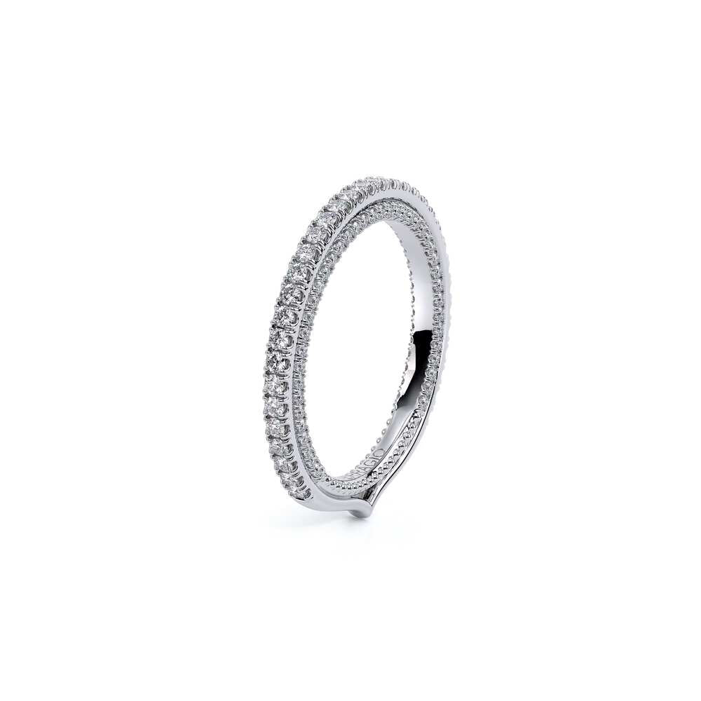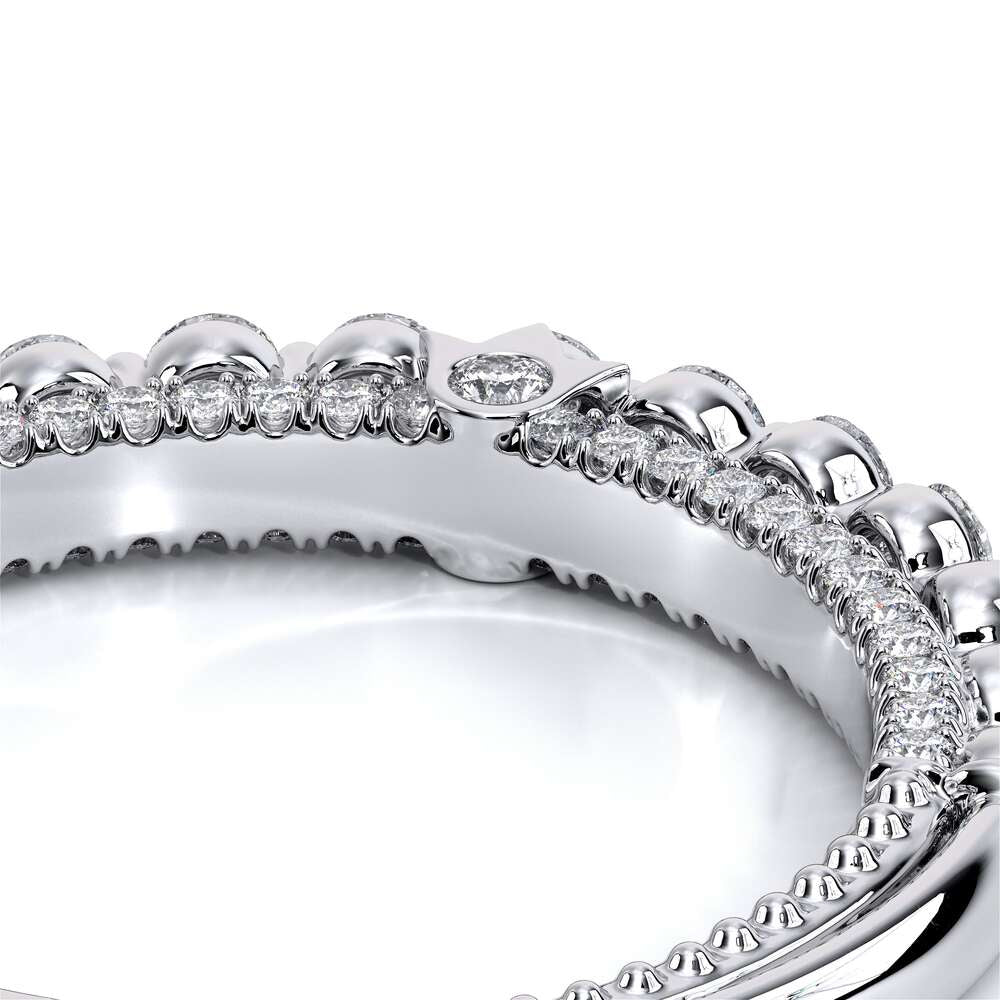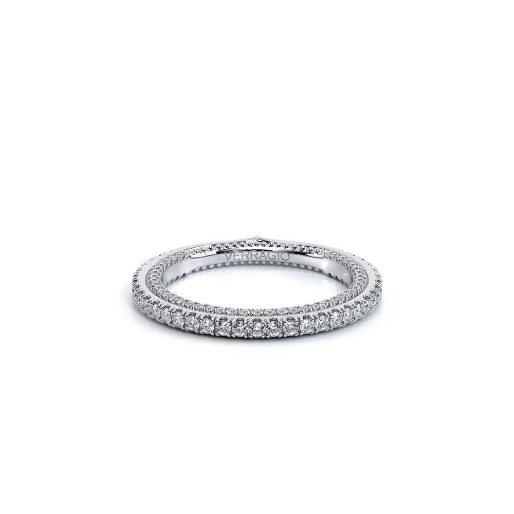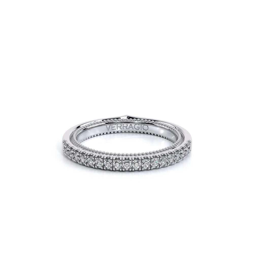 COUTURE-0420W-2T Classic Wedding band pave with round brilliant diamonds, featuring full Signature Beading profile, completed with the Couture pointed shank and Verragio Bezel immersed.