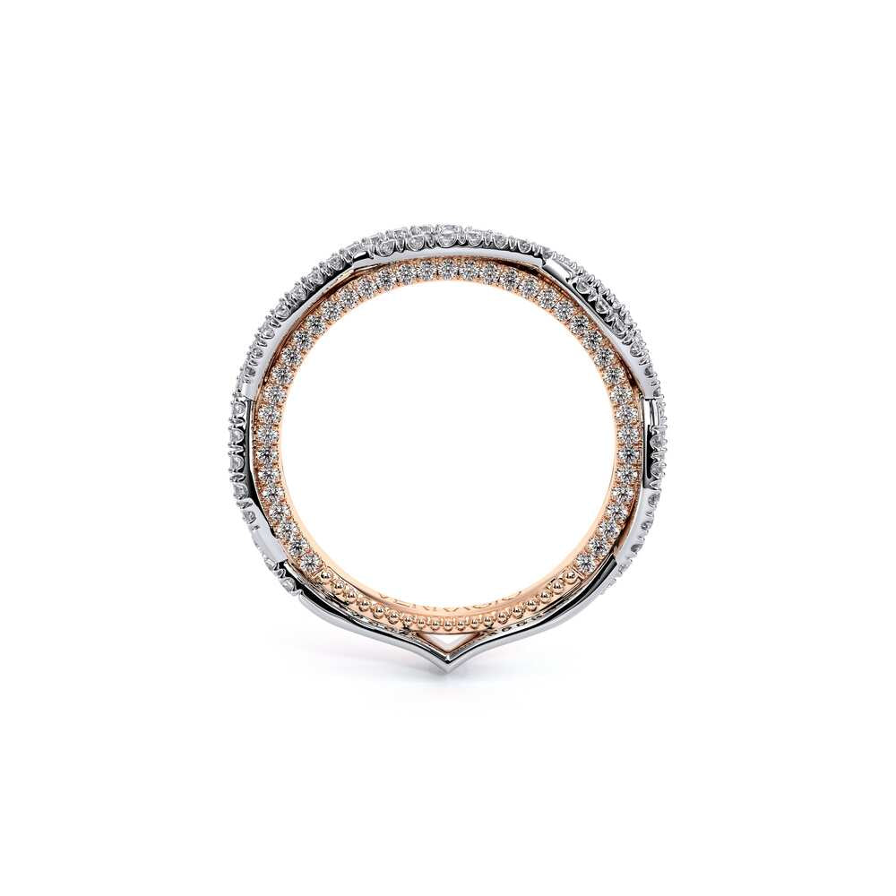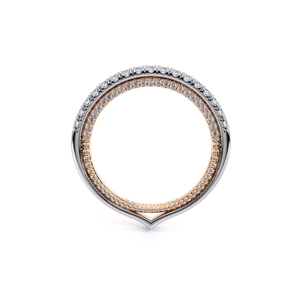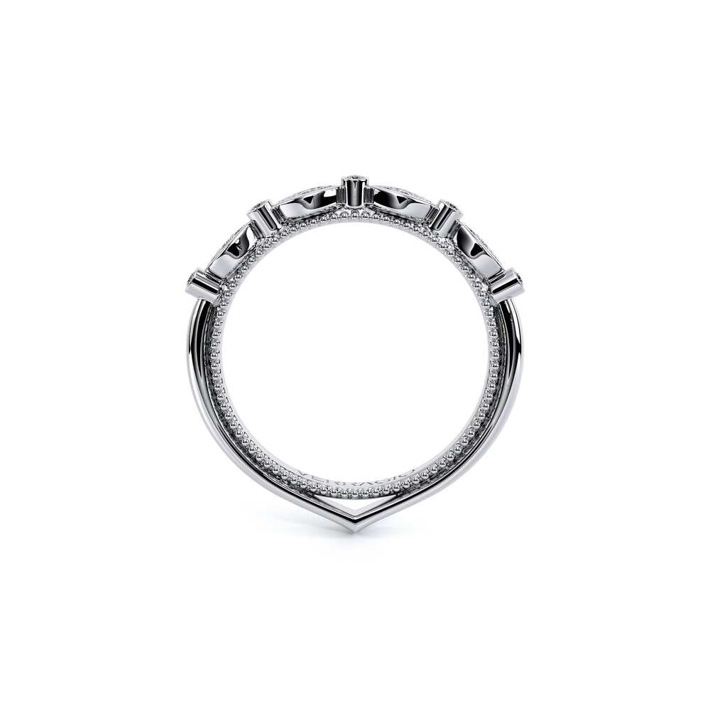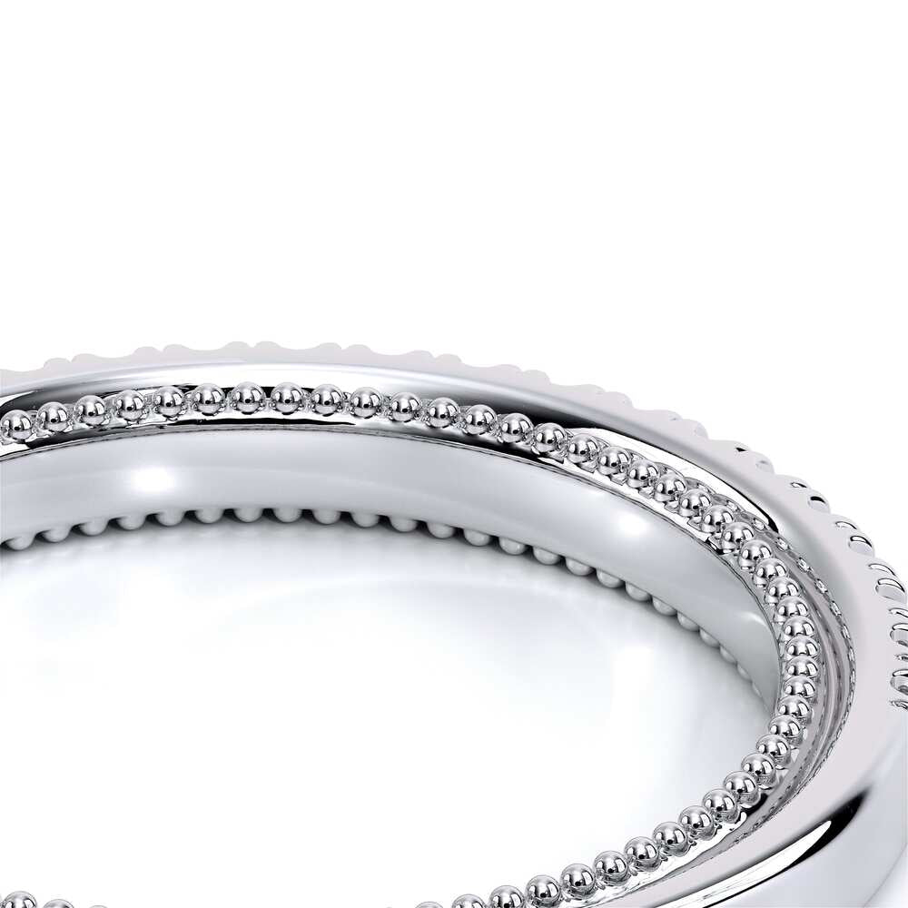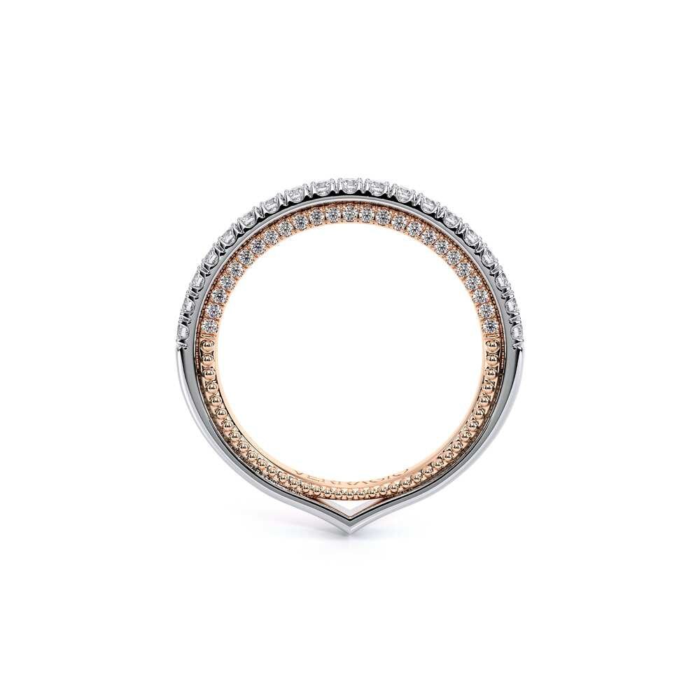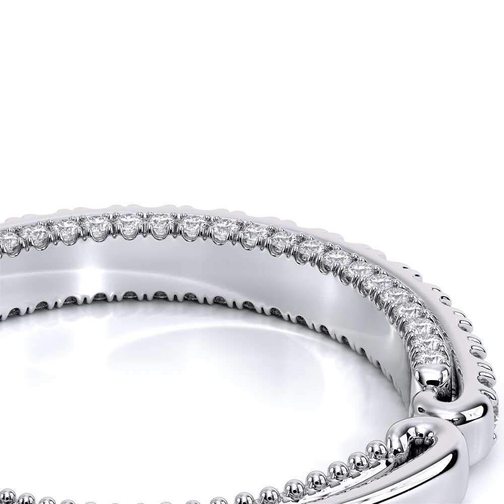 COUTURE-0420W-2T Classic Wedding band pave with round brilliant diamonds, featuring full Signature Beading profile, completed with the Couture pointed shank and Verragio Bezel immersed.