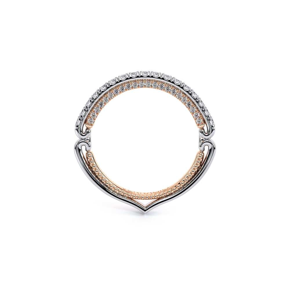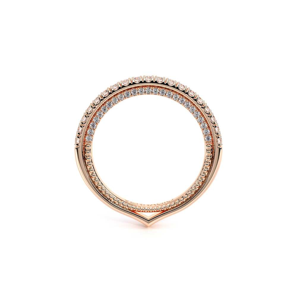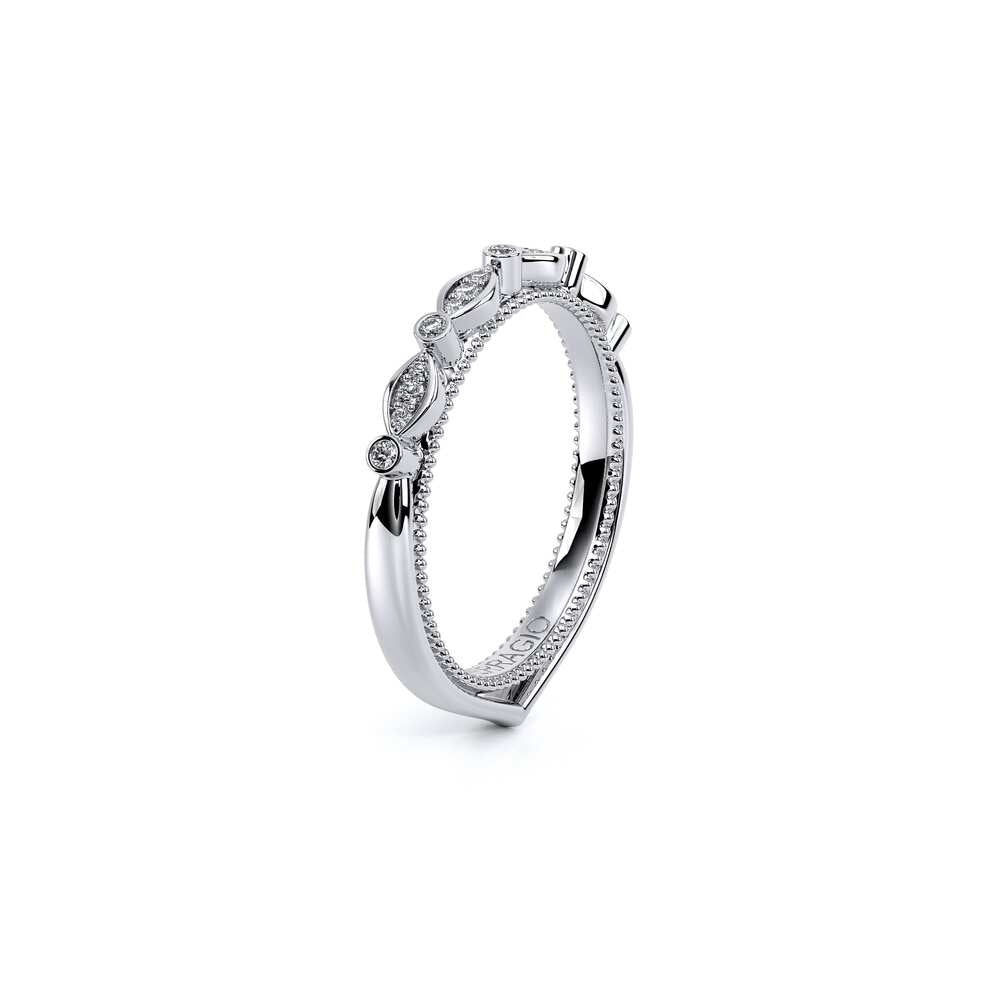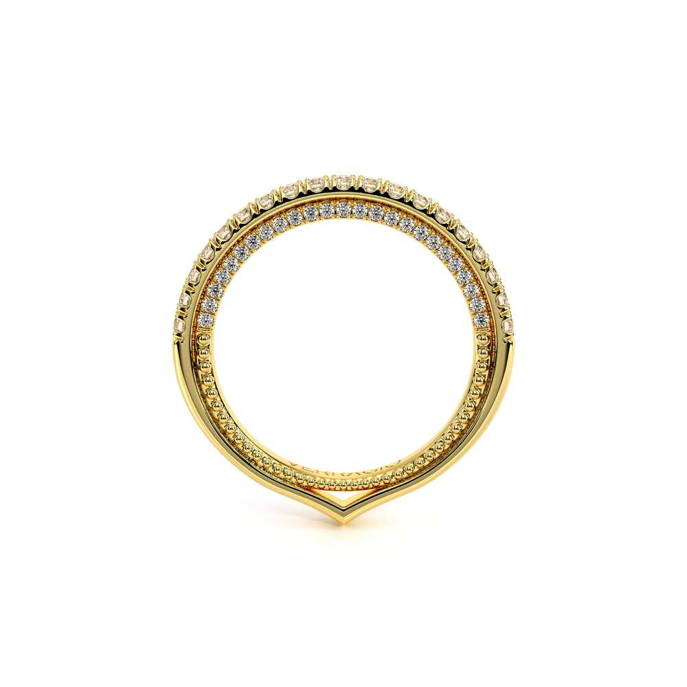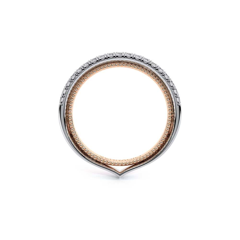 COUTURE-0420W-2T Classic Wedding band pave with round brilliant diamonds, featuring full Signature Beading profile, completed with the Couture pointed shank and Verragio Bezel immersed.