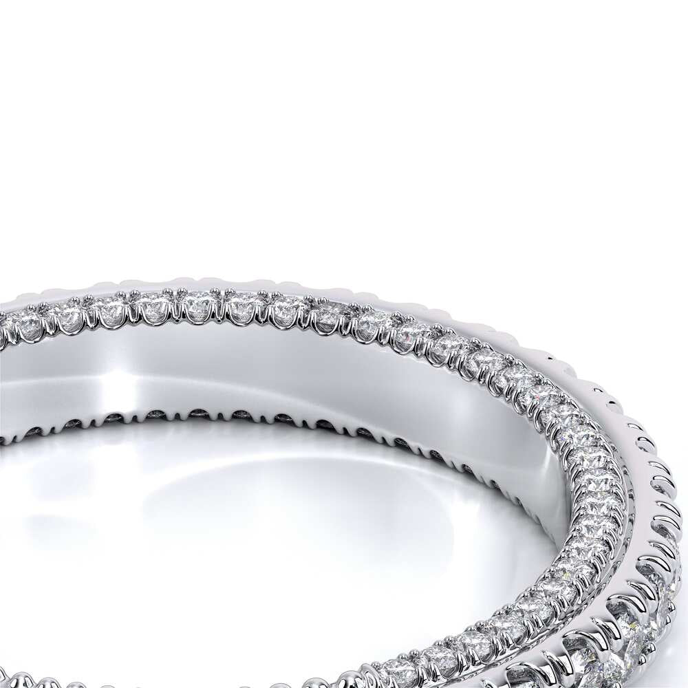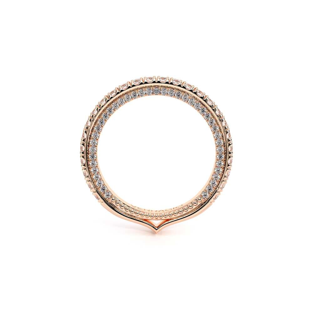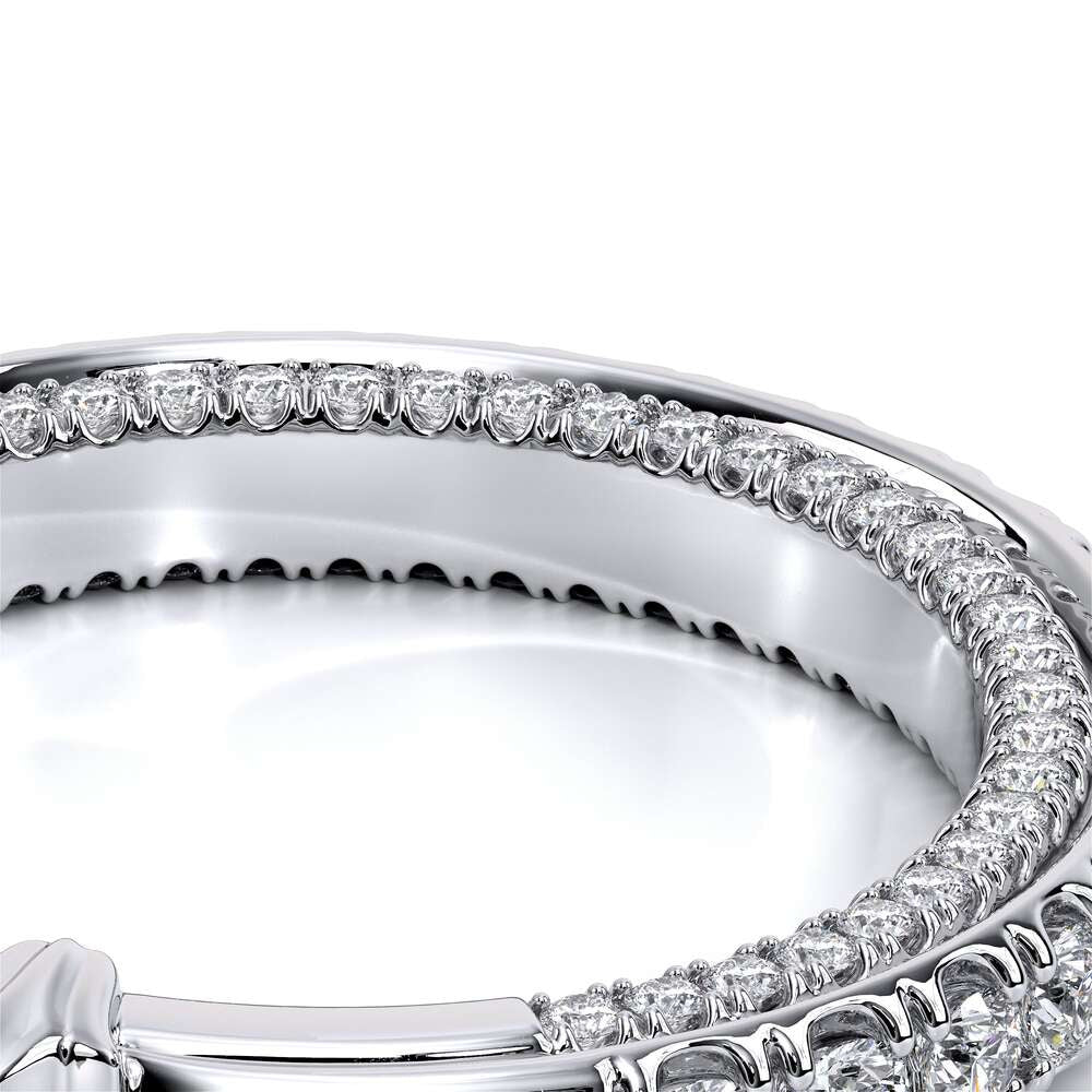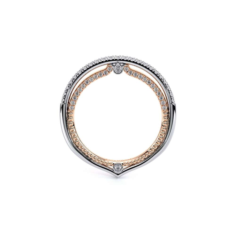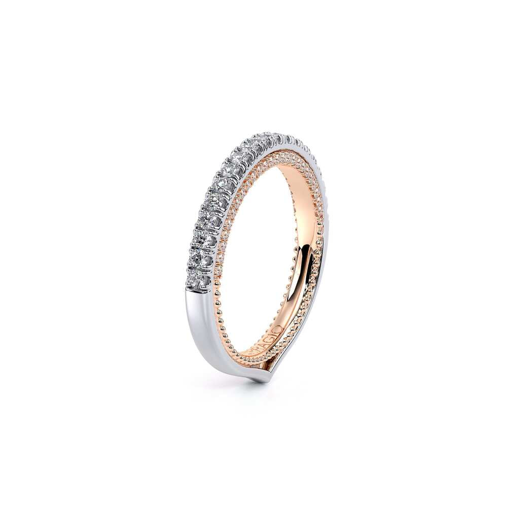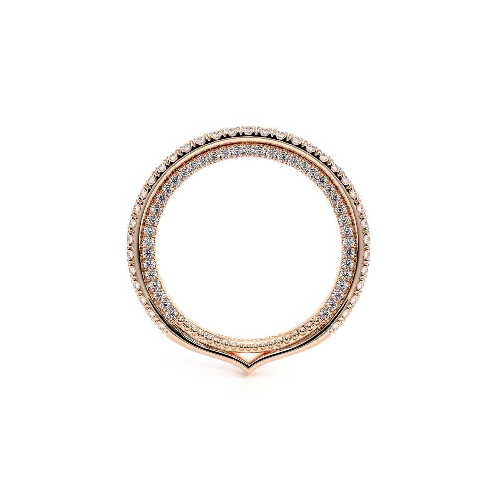 COUTURE-0420W-2T Classic Wedding band pave with round brilliant diamonds, featuring full Signature Beading profile, completed with the Couture pointed shank and Verragio Bezel immersed.