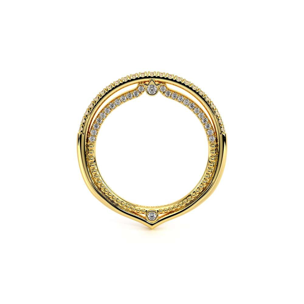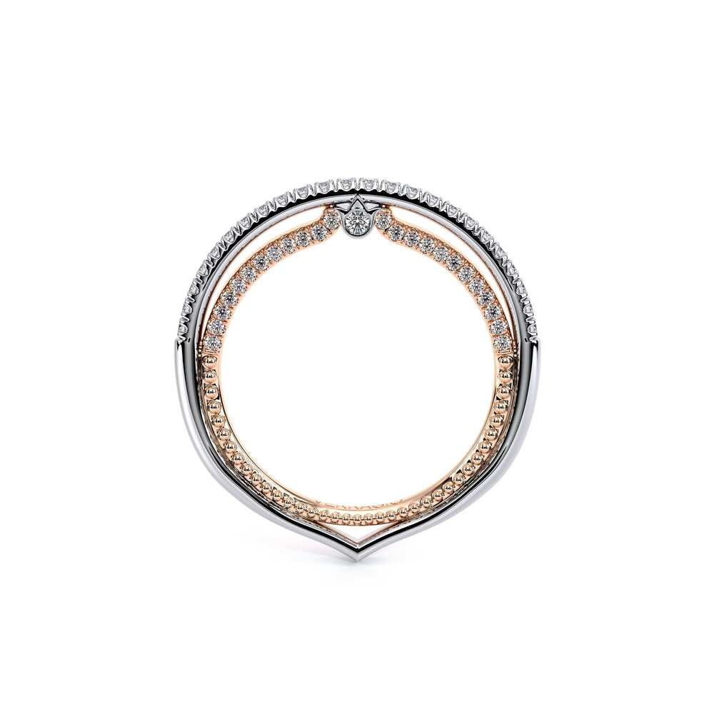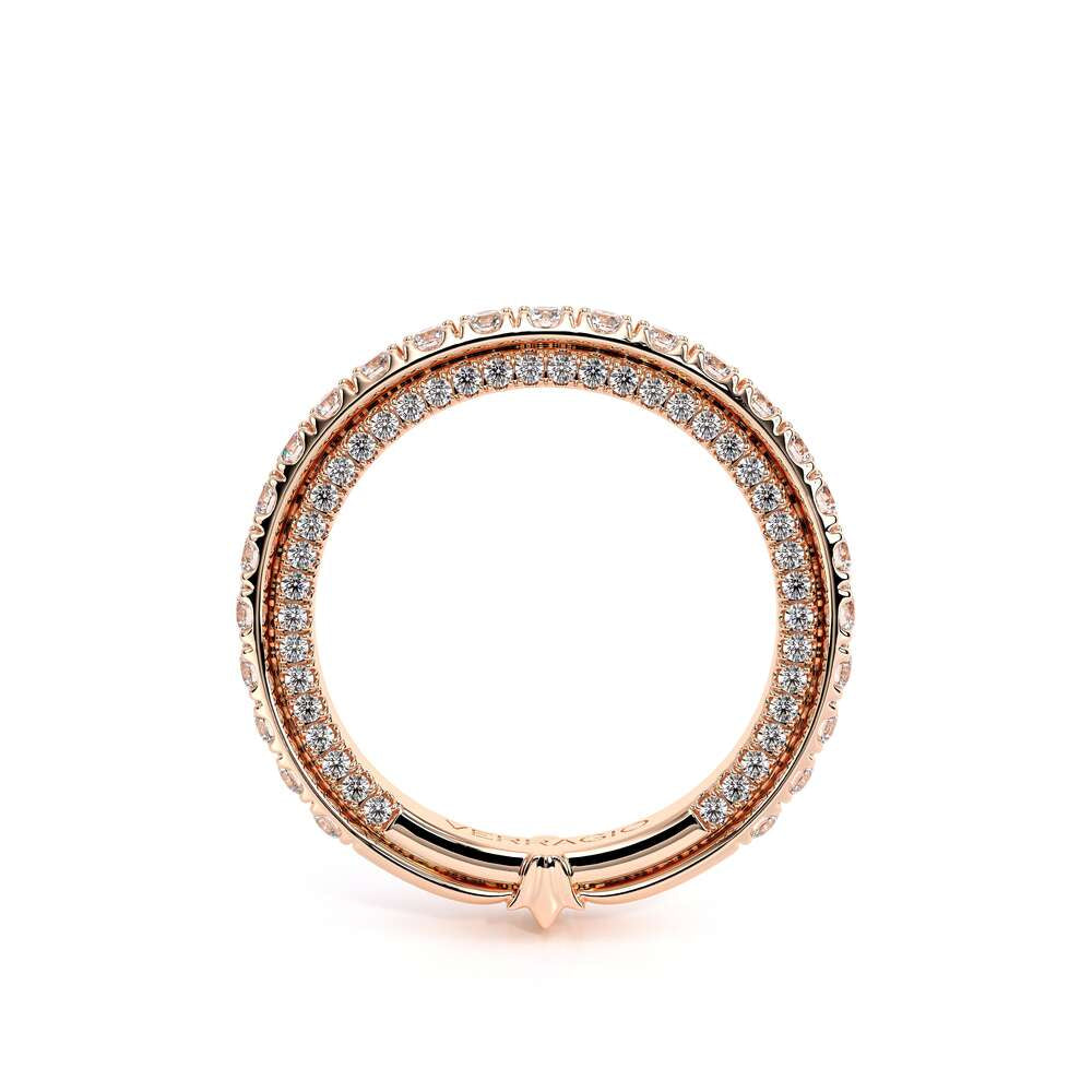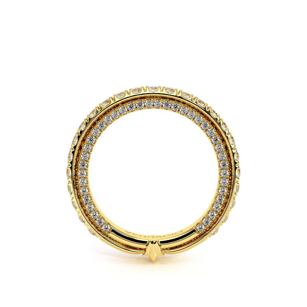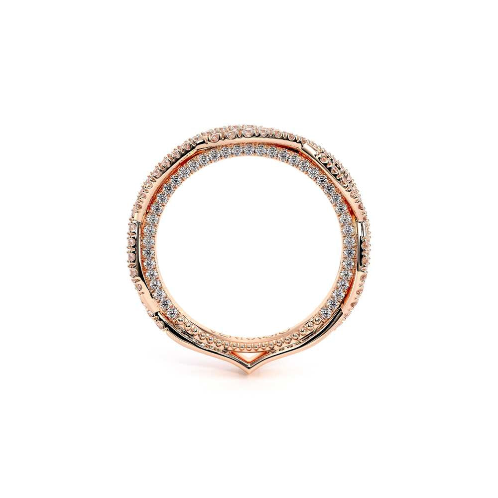COUTURE-0420W-2T Classic Wedding band pave with round brilliant diamonds, featuring full Signature Beading profile, completed with the Couture pointed shank and Verragio Bezel immersed.