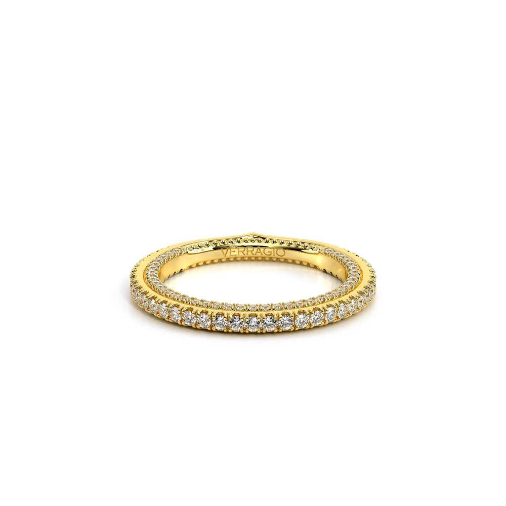 COUTURE-0426W Timeless Wedding band pave with round brilliant diamonds, featuring the Verragio Bezel set and upward Scrollwork Signature Beading profile, completed with the Couture pointed shank.