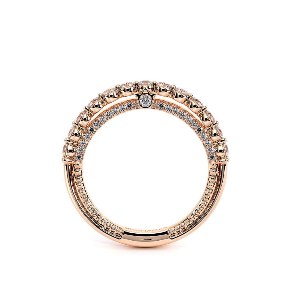 COUTURE-0418W Classic Wedding band, pave with round brilliant diamonds, featuring full Signature Beading profile, completed with the Couture pointed shank and Verragio Bezel immersed.
