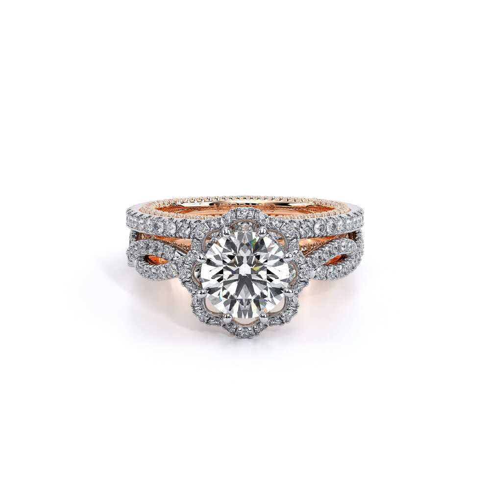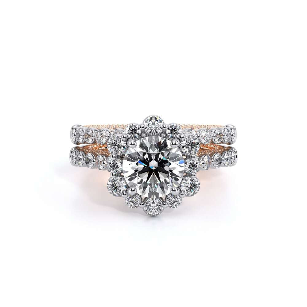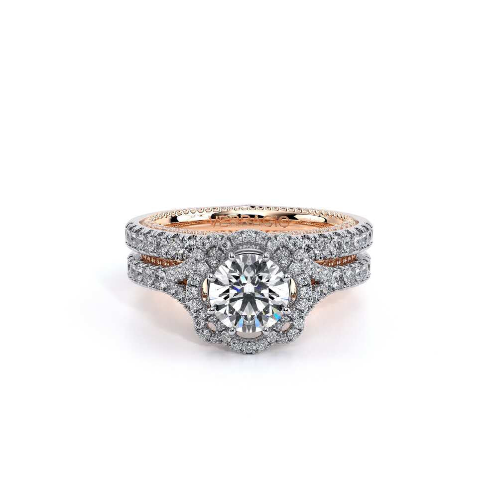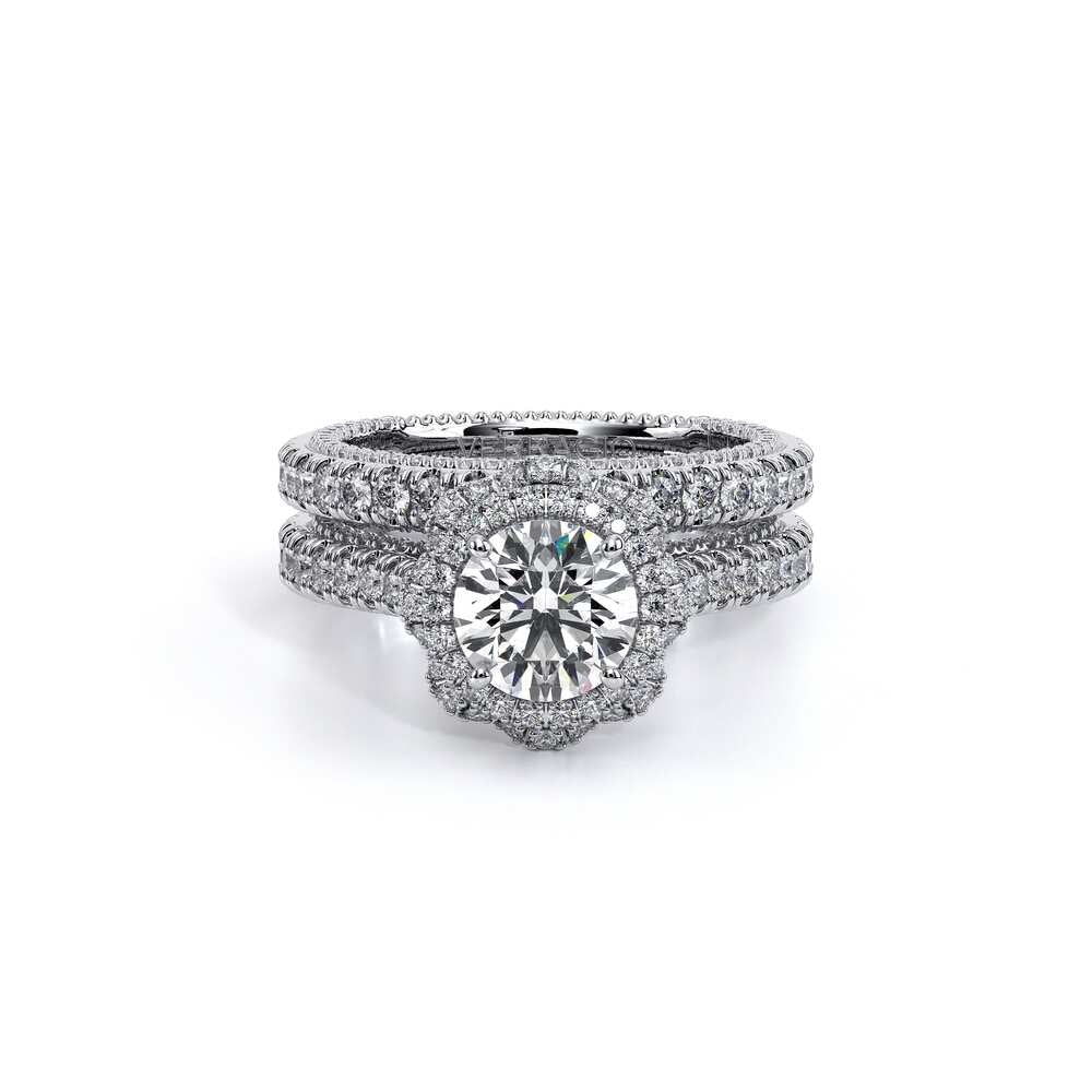 Features, bezel set brilliant-cut diamonds on our new Amore halo with meticulously set diamonds on a straight band. All details are elevated with the addition of our 1/2 Diamonds Riviera with Verragio's timeless signature crest and beading.