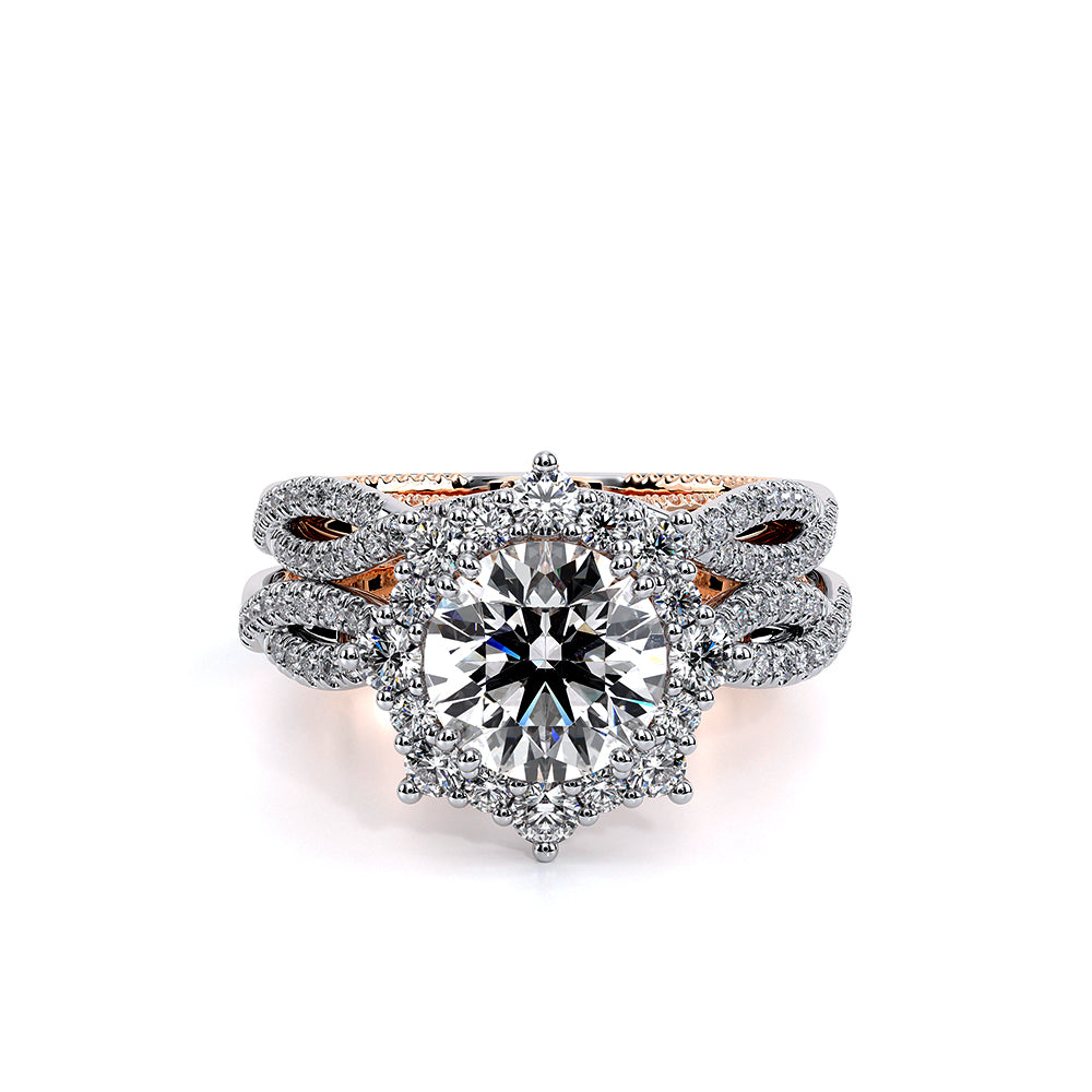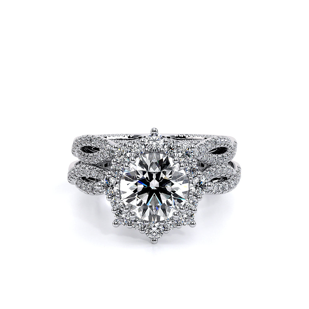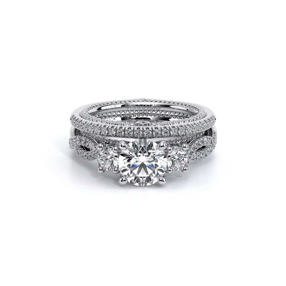 COUTURE-0481W features a twisted band from the Couture Collection with round brilliant diamonds, adorned with a Half Diamond Riviera-Signature Beading profile, opt for a twisted band or a straight band to match your Verragio engagement ring.