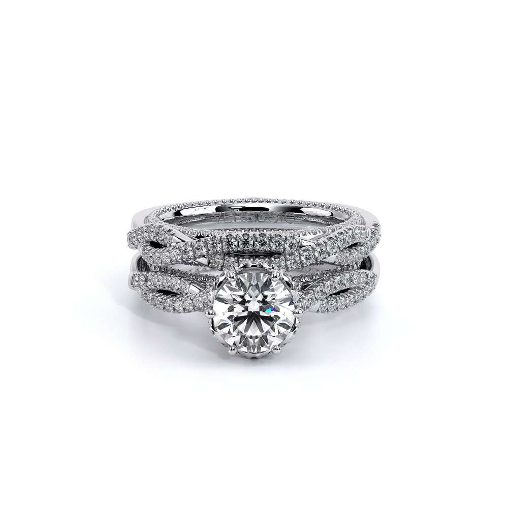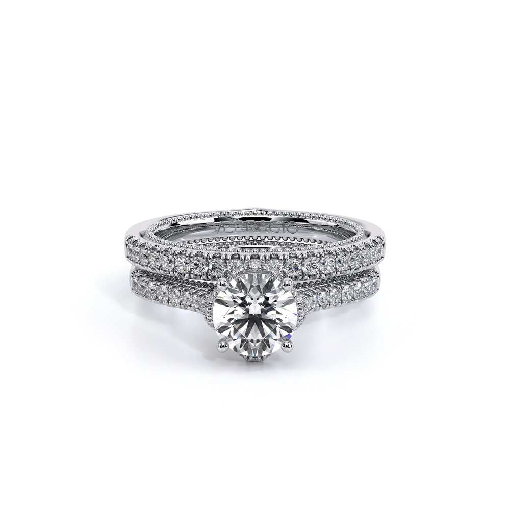 COUTURE-0450WSB Straight band version of 0450W, pave with round brilliant diamonds, featuring the Verragio Crest and Half Diamond Riviera-Signature Beading profile, completed with the Couture pointed shank.