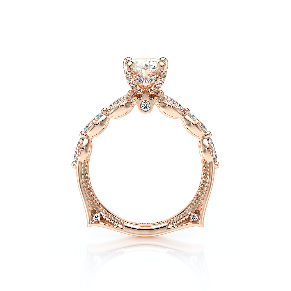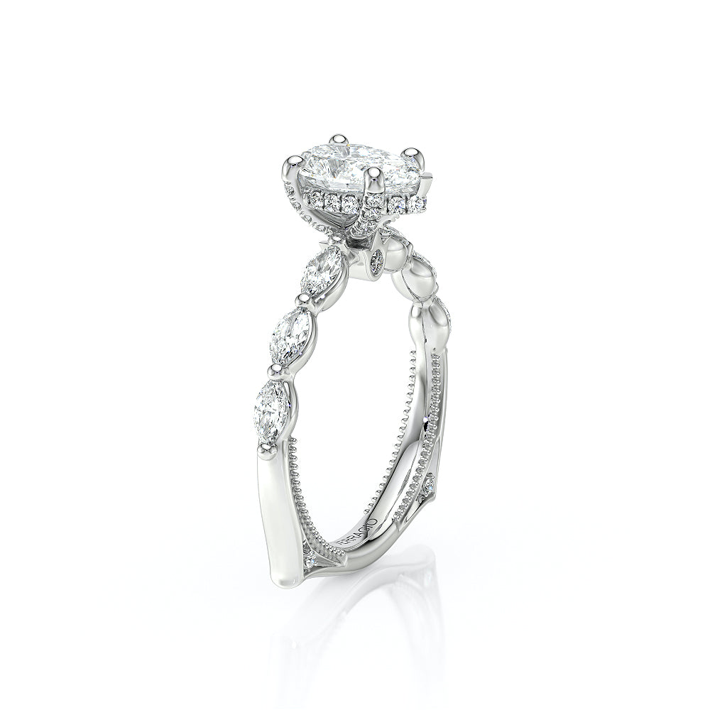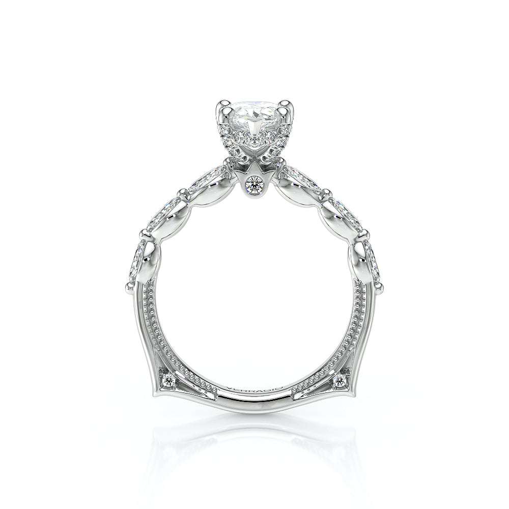 The VNG-2204OV features a knife-edge shank with round stones flowing along both sides, paired with Verragio beading on the side profile and diamond-accented prongs for a harmonious look.