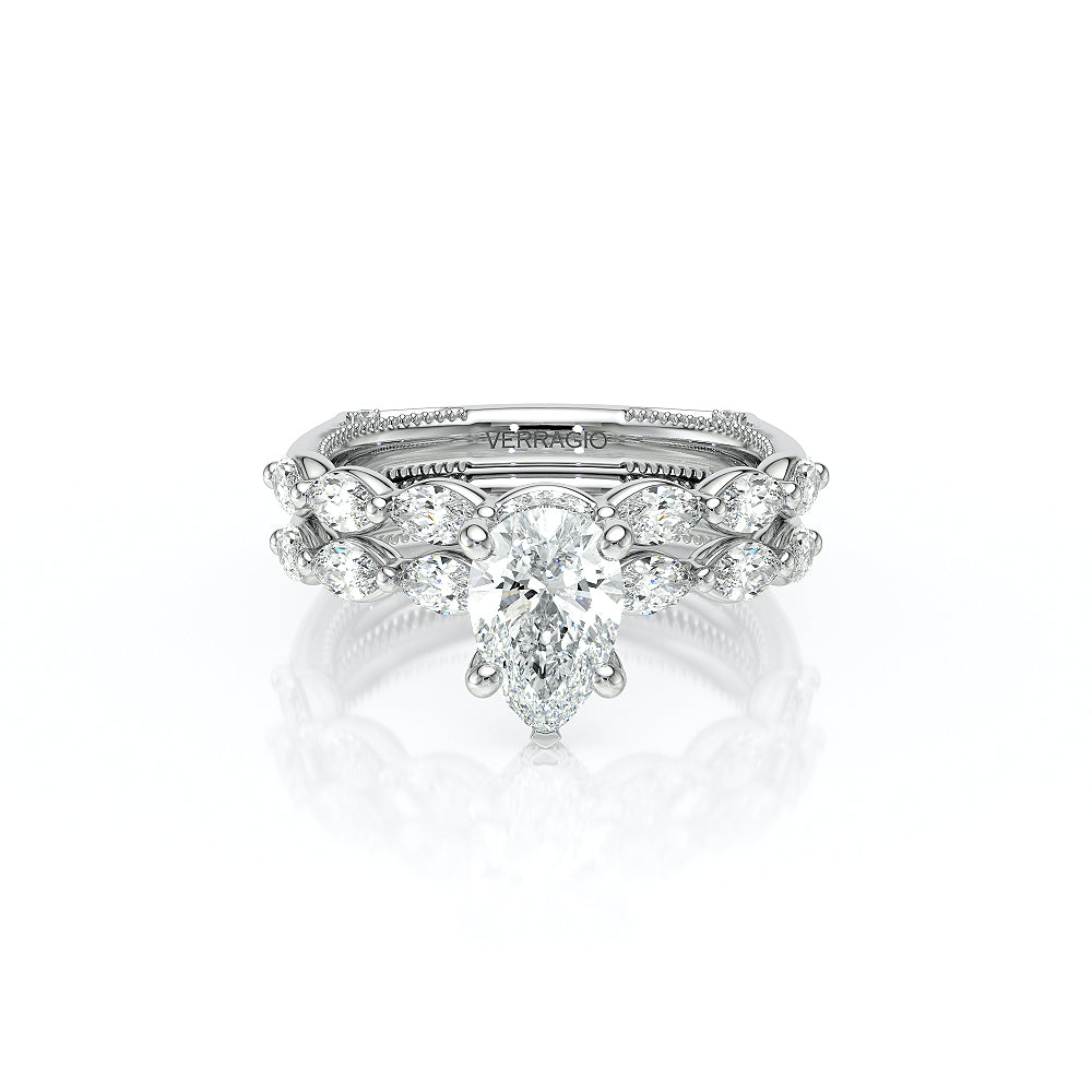 The exquisite embellisher, VNG-2040W, features two pear-shaped stones at its center, elegantly descending into a path of round diamonds, all held within the iconic Insignia scrollwork. This design is a true heritage piece, embodying Verragio's timeless artistry and signature craftsmanship.