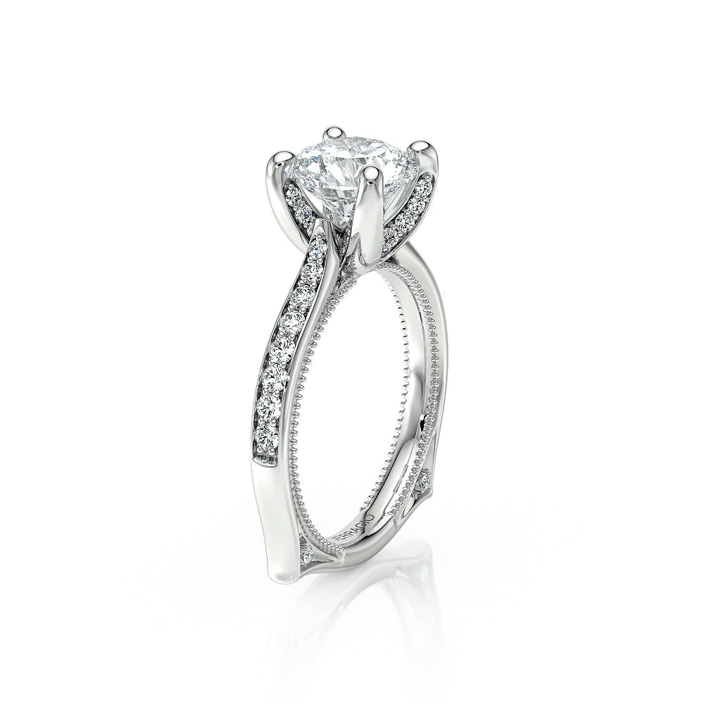 VENETIAN-5003 engagement ring from the Venetian Collection, features round brilliant-cut diamonds pave set in a twisted shank, enhancing the center stone giving an illusion of a floating diamond. Our beautiful Venetian lace and Verragio signature beading completes this vintage piece.