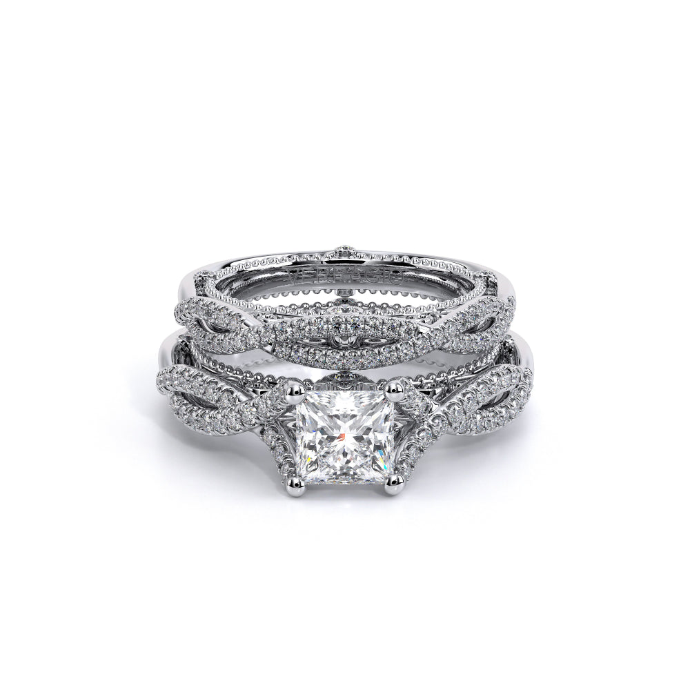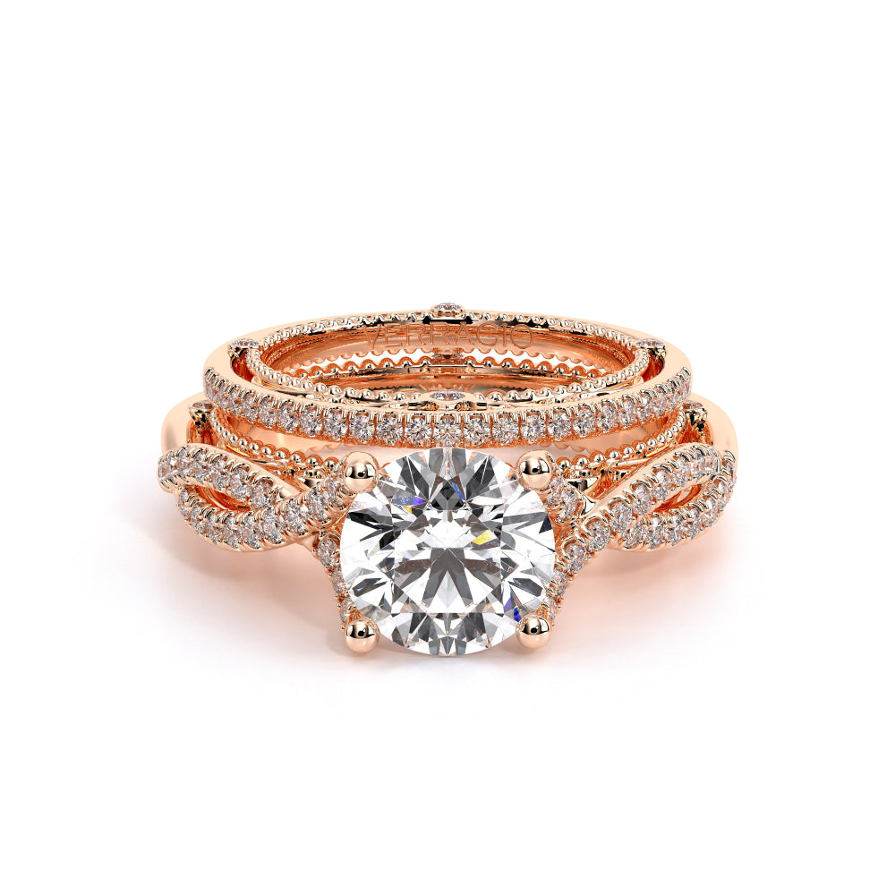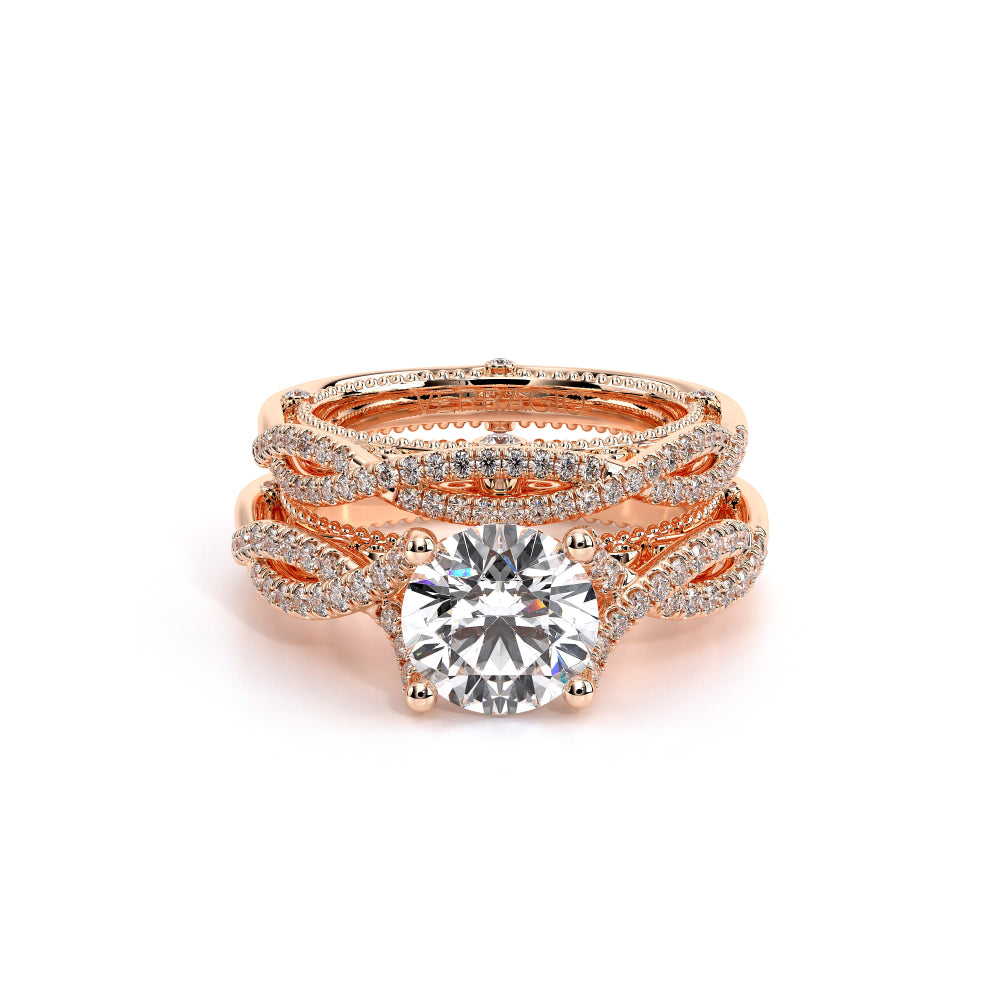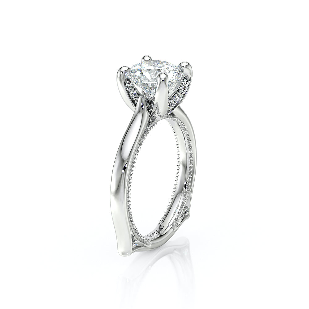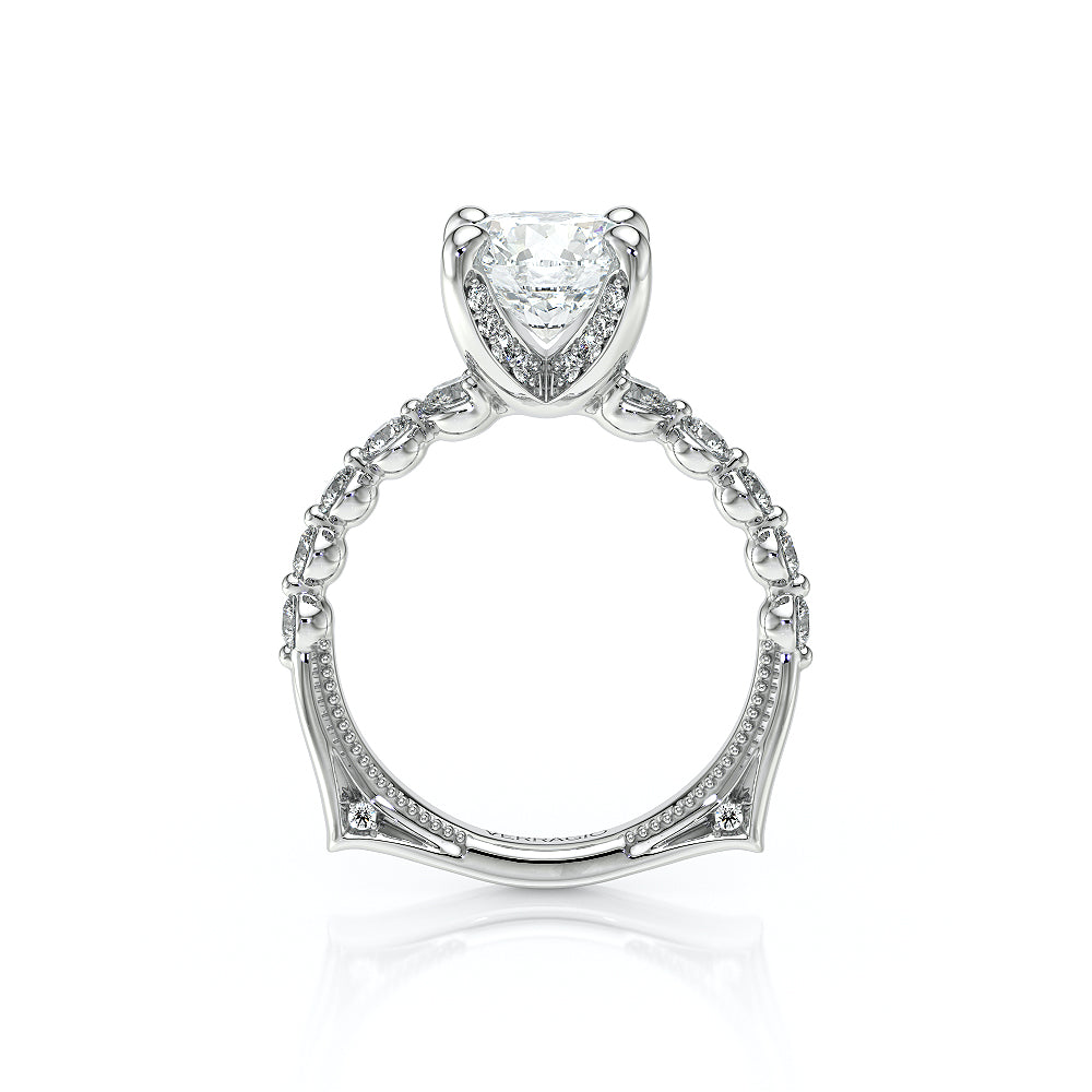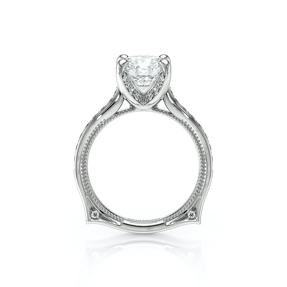VENETIAN-5003 engagement ring from the Venetian Collection, features round brilliant-cut diamonds pave set in a twisted shank, enhancing any center shape of your choice in a floating design. Our beautiful Venetian lace and Verragio signature beading completes this vintage piece.