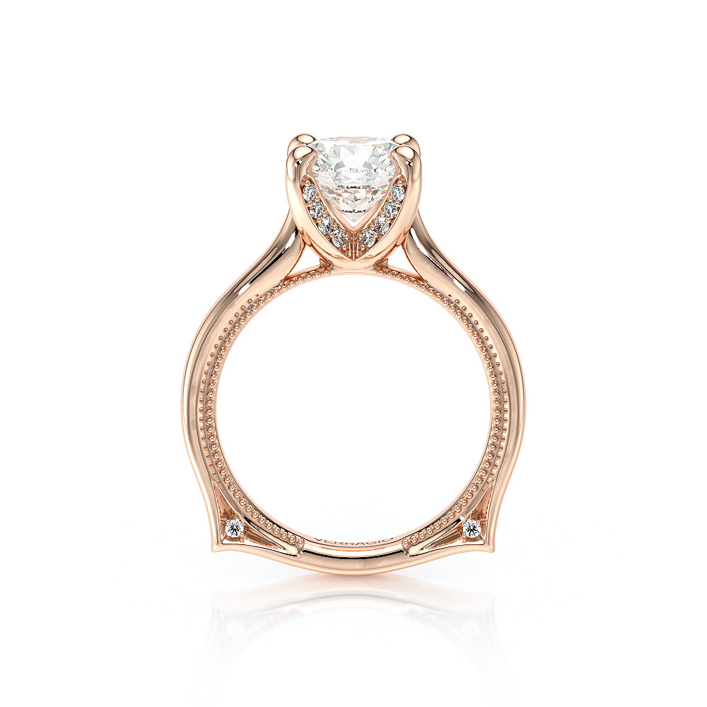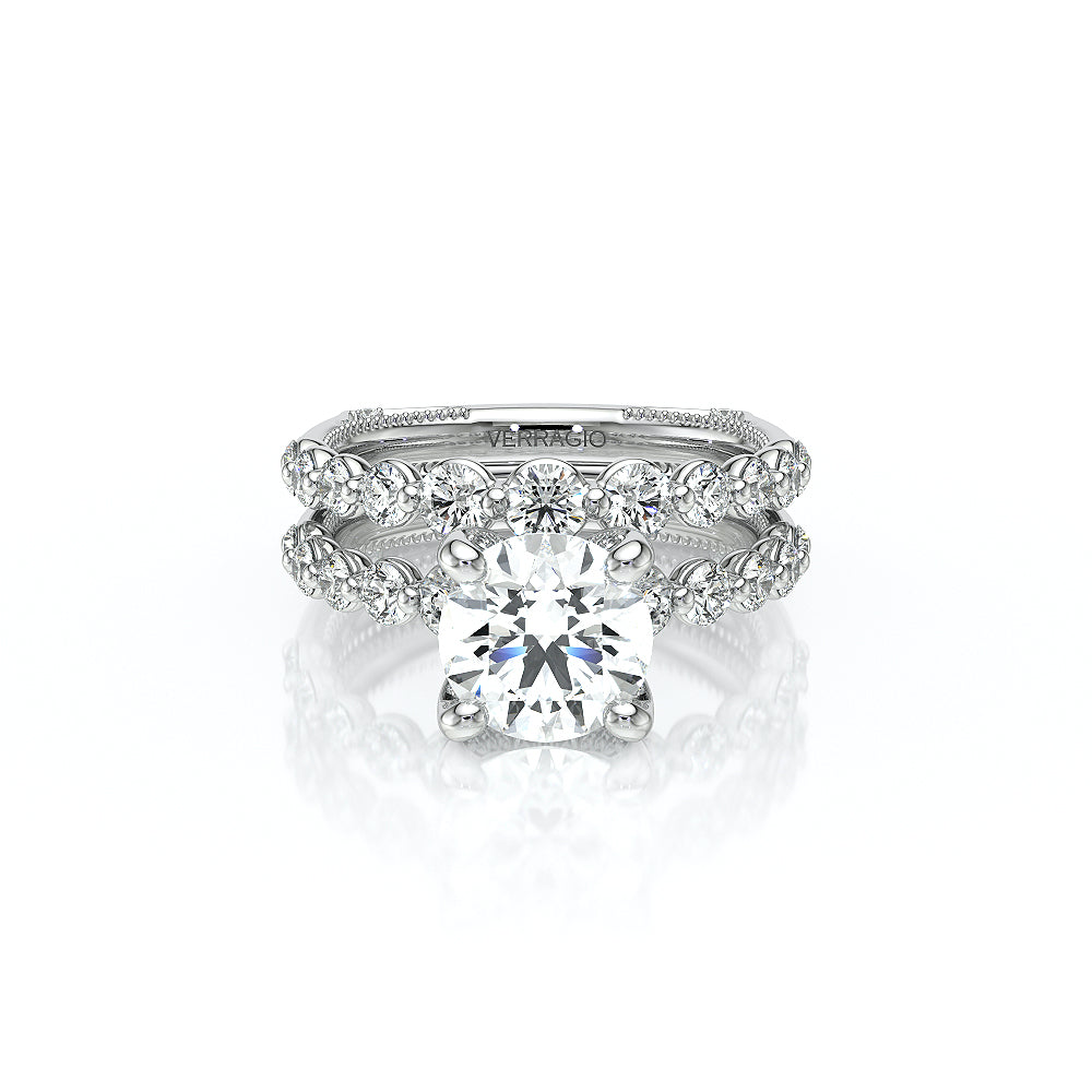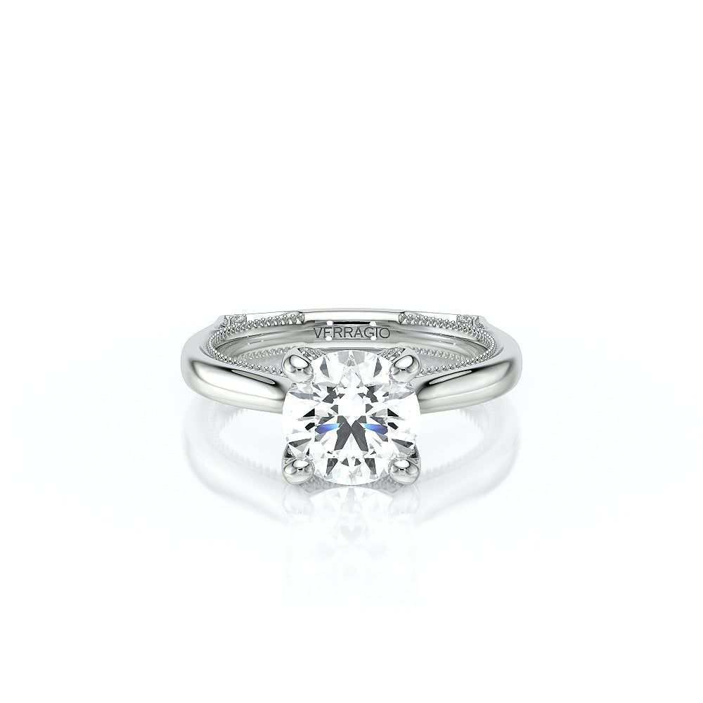The VNG-2207R-S, an elevated solitaire, features a round center stone setting, enhanced by two bezels, signature Verragio beading, and two rows of diamonds along the prong for a polished and refined design.