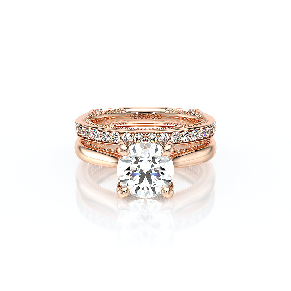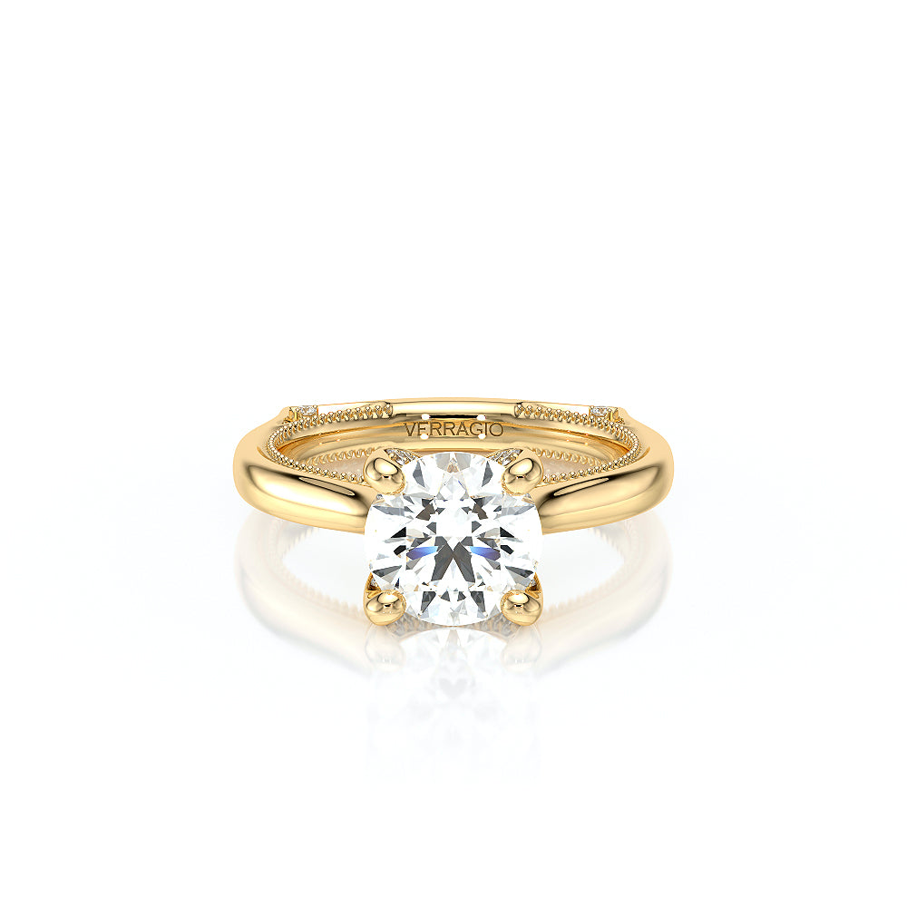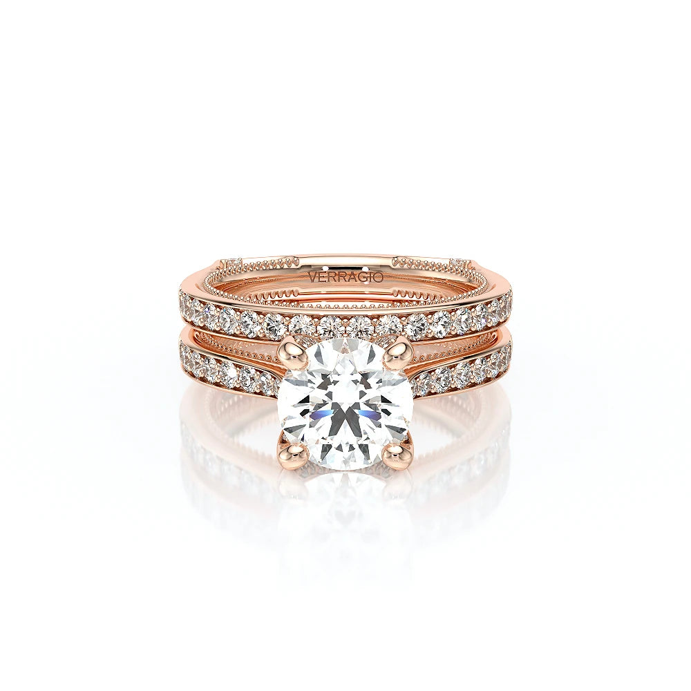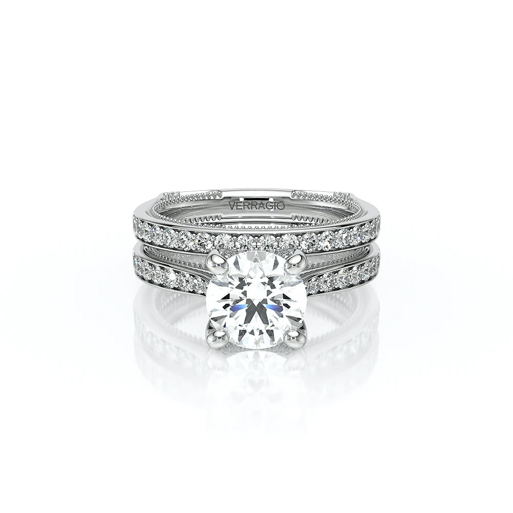 The VNG-2207R-S, an elevated solitaire, features a round center stone setting, enhanced by two bezels, signature Verragio beading, and two rows of diamonds along the prong for a polished and refined design.